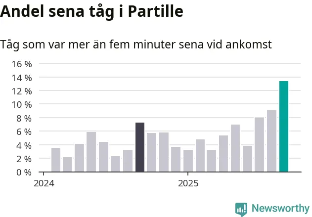 13 procent är den högsta andelen sena tåg sedan åtminstone den hårt förseningsdrabbade vintern 2023/24. Siffrorna bygger på realtidsinformation om tågavgångar och ankomster från Trafikverket, som Newsworthy löpande samlar in.