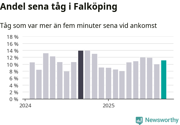 Elva procent kan jämföras med tio procent månaden innan, och 14 procent i september 2024. Siffrorna bygger på realtidsinformation om tågavgångar och ankomster från Trafikverket, som Newsworthy löpande samlar in.