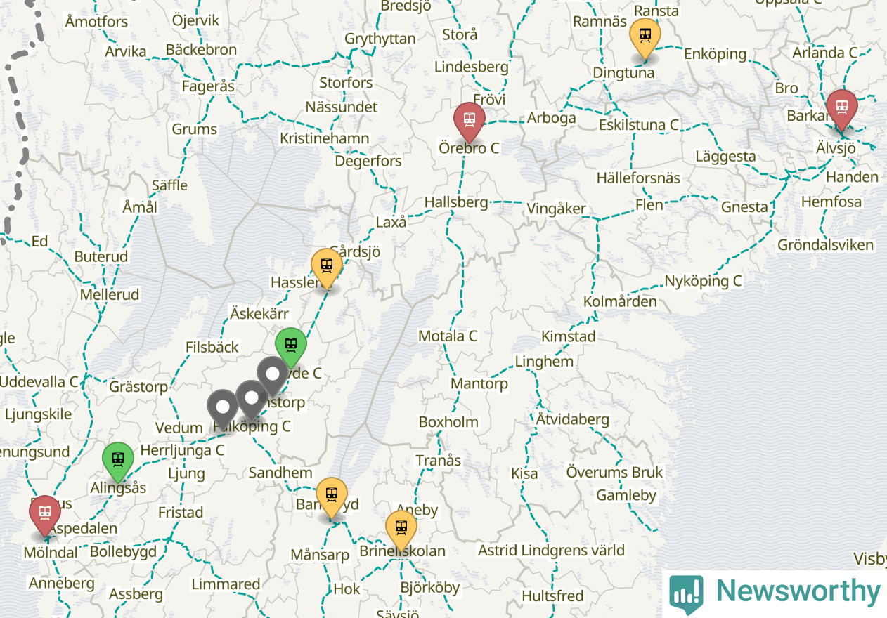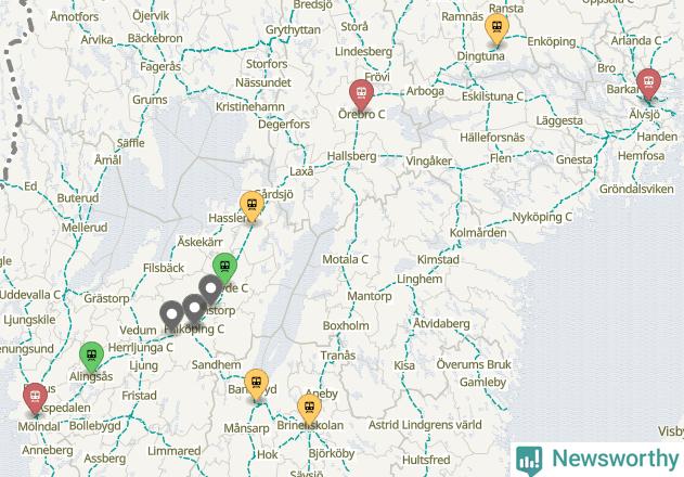 Dagen med flest sena tåg var torsdag den 25 september, när 25 procent av tågen var mer än fem minuter försenade vid ankomst. Det enskilt mest försenade tåget var tåg 12039 (VR Snabbtåg), mellan Stockholm C och Göteborg C, som var 4 timmar och 11 minuter sent när det passerade Falköpings kommun på kvällen fredag den 26:e. Det senaste stationsmeddelandet vi sparat från det tåget löd: Olycka.