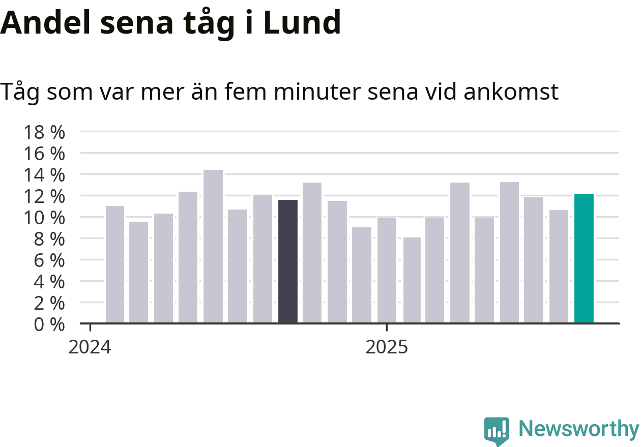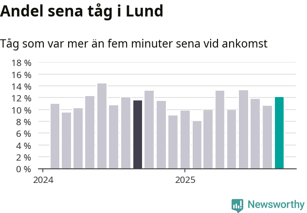 Tolv procent kan jämföras med elva procent månaden innan, och tolv procent i september 2024. Siffrorna bygger på realtidsinformation om tågavgångar och ankomster från Trafikverket, som Newsworthy löpande samlar in.