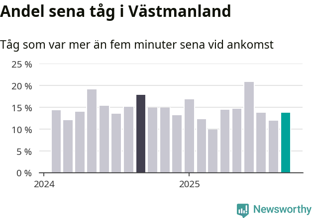 14 procent kan jämföras med tolv procent månaden innan, och 18 procent i september 2024. Siffrorna bygger på realtidsinformation om tågavgångar och ankomster från Trafikverket, som Newsworthy löpande samlar in.