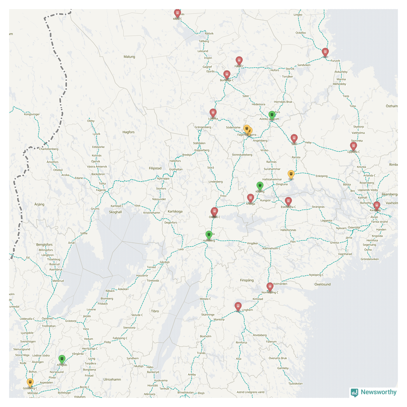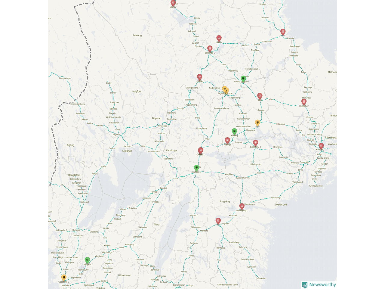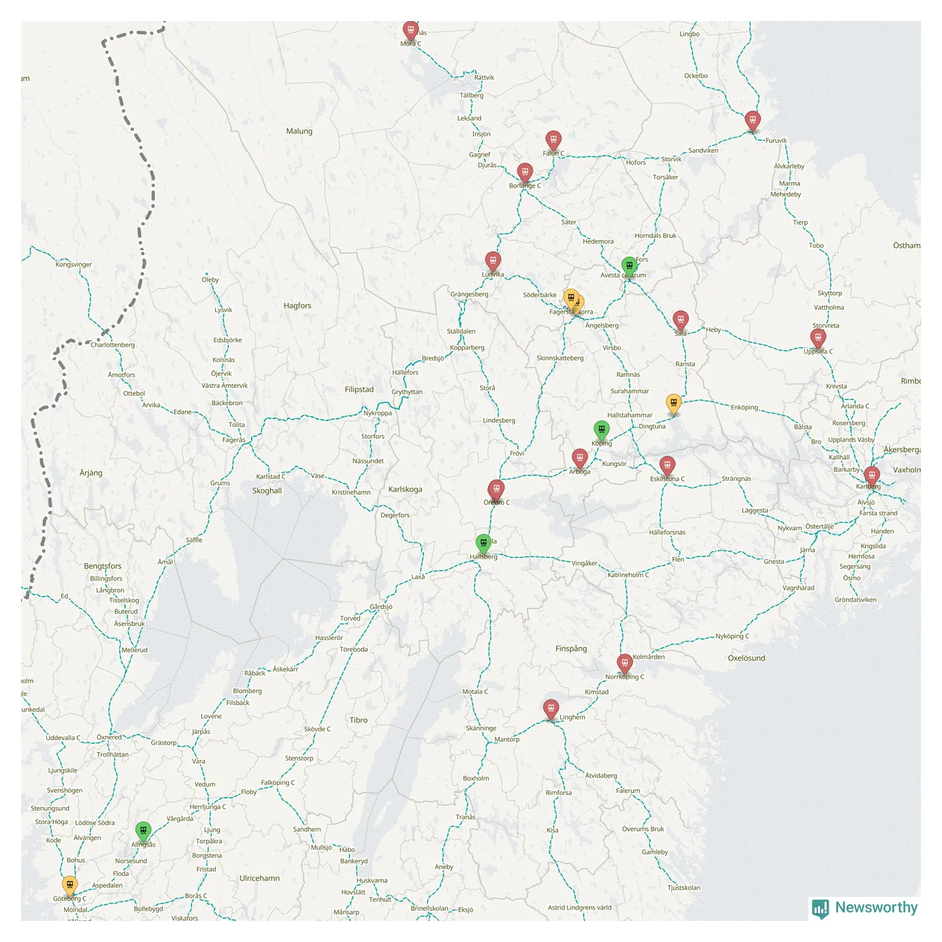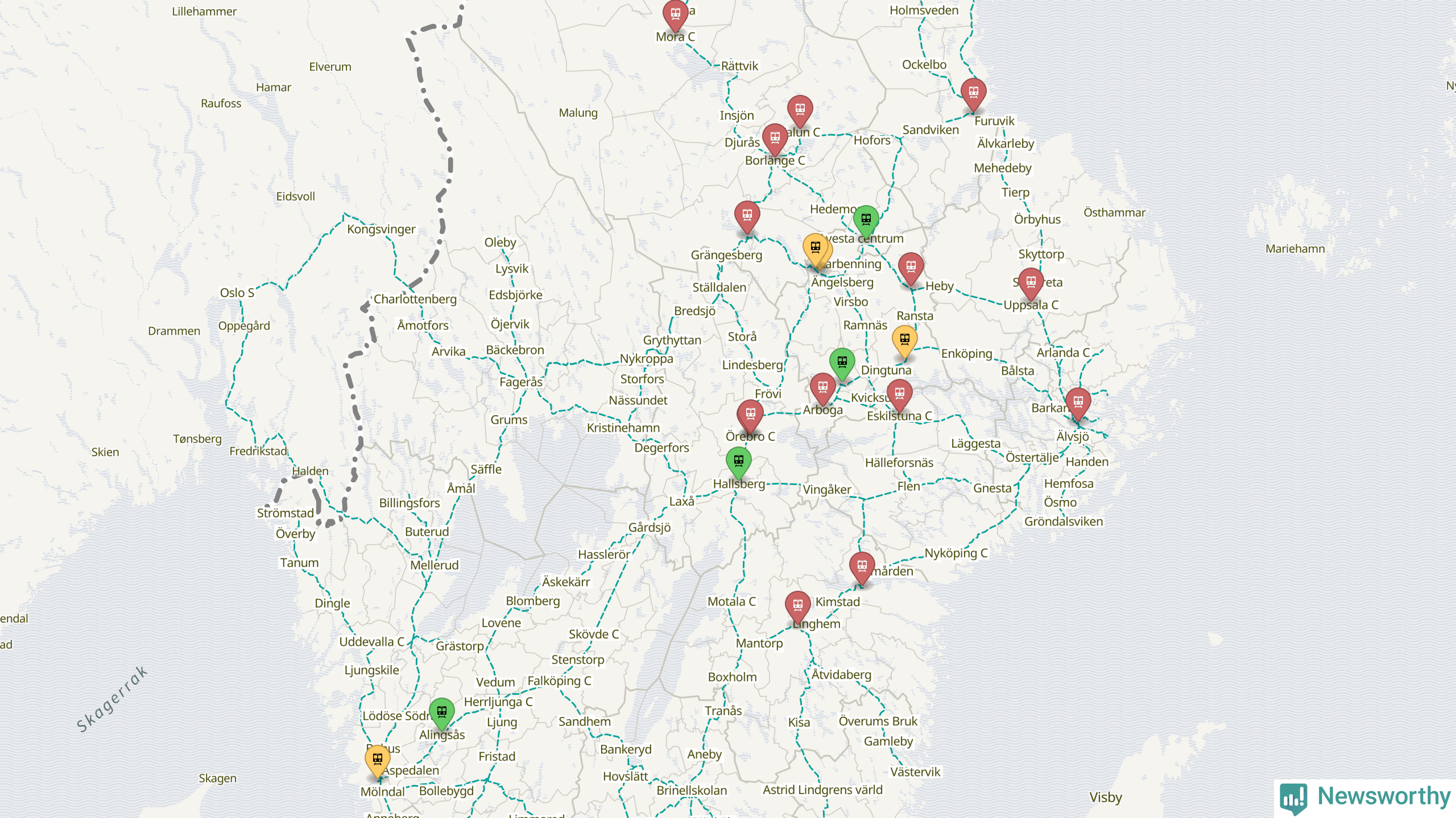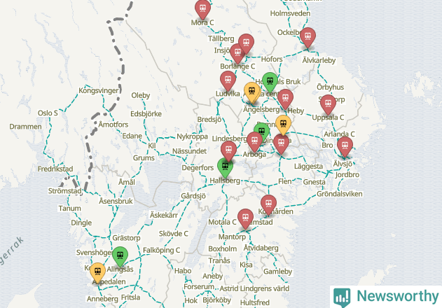 Kartdata från Mapbox, Newsworthy, OpenStreetMap och Trafikverket. Uppgifter om sträckor med passagerartrafik från jarnvag.net.