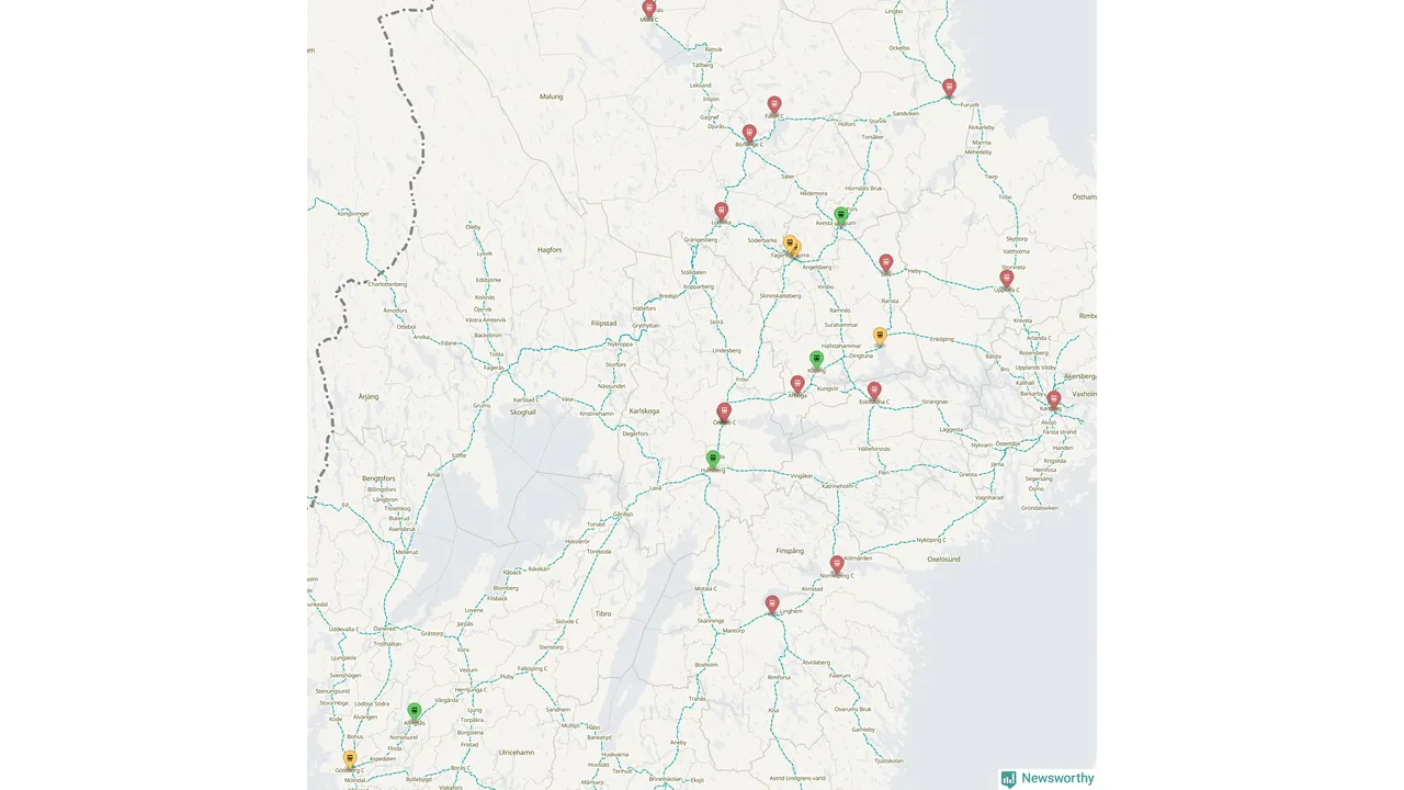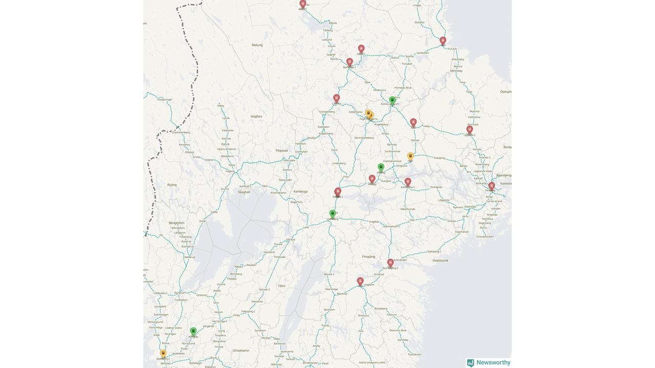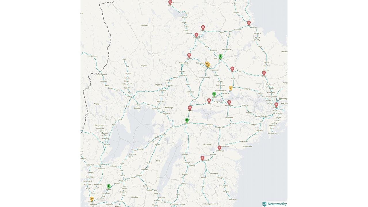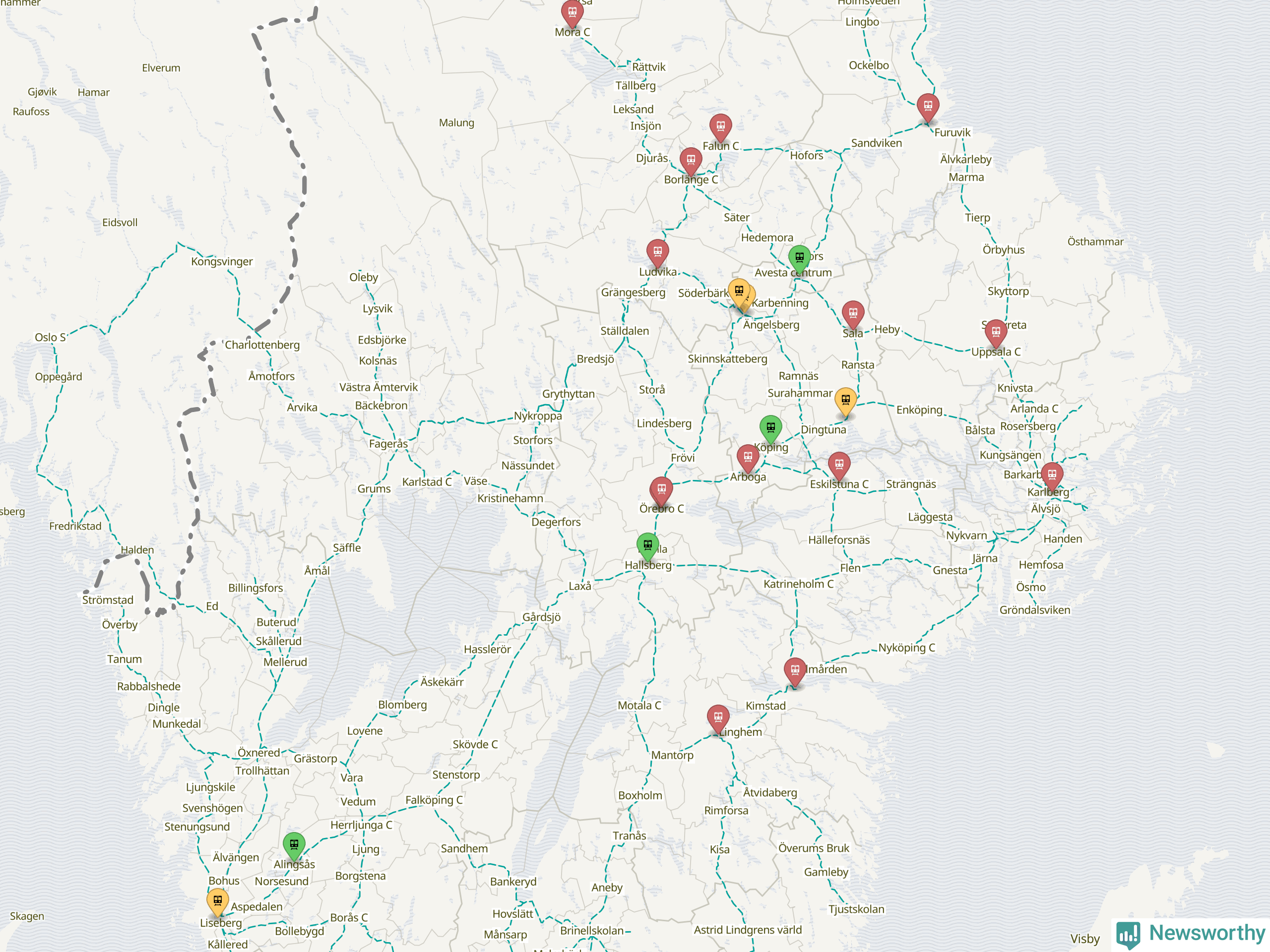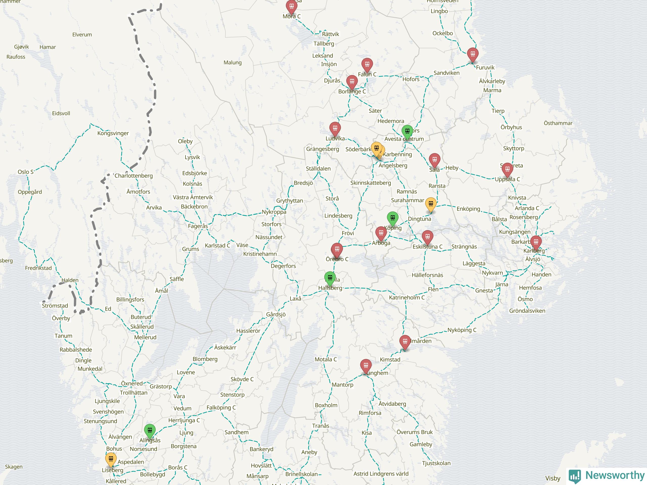 Kartdata från Mapbox, Newsworthy, OpenStreetMap och Trafikverket. Uppgifter om sträckor med passagerartrafik från jarnvag.net.
