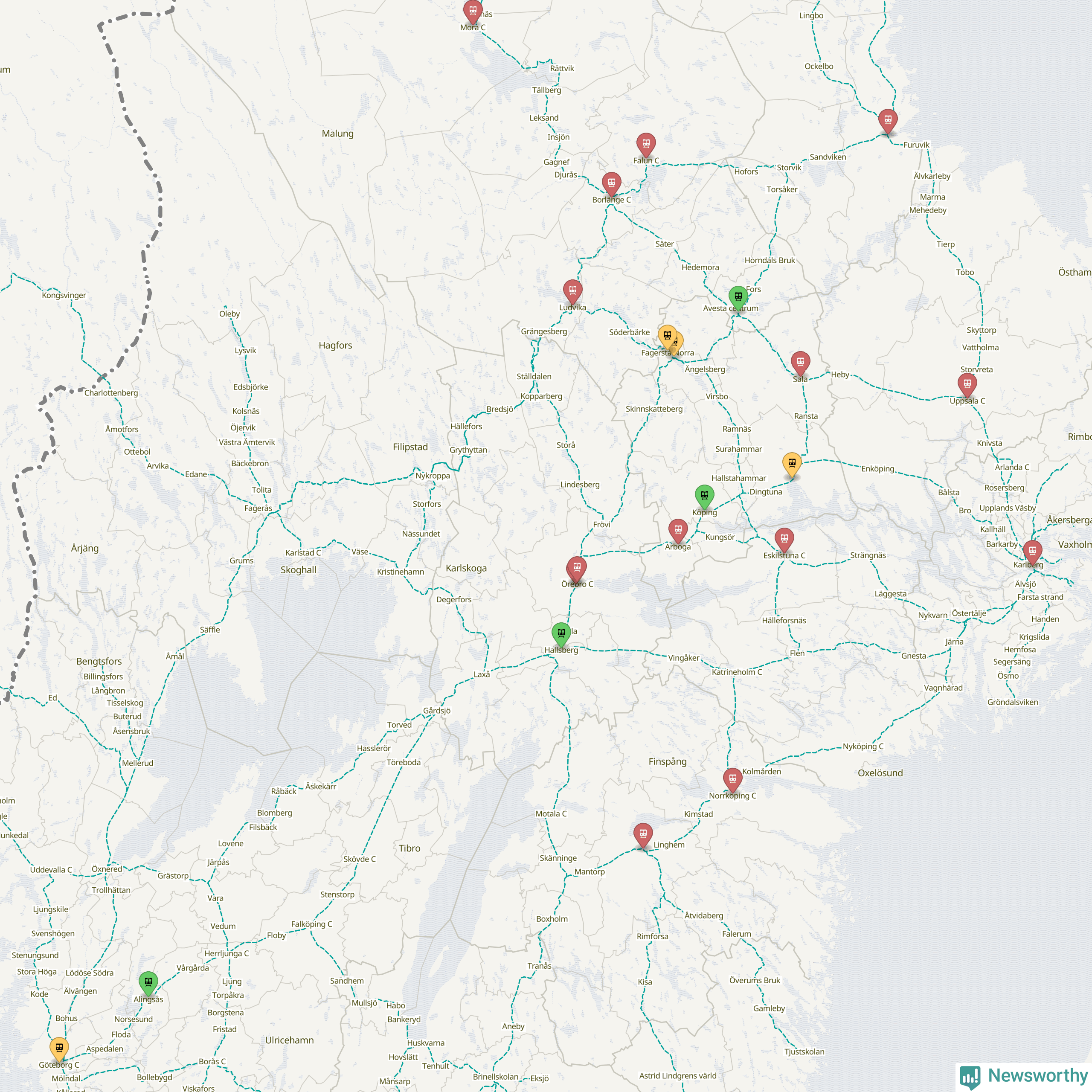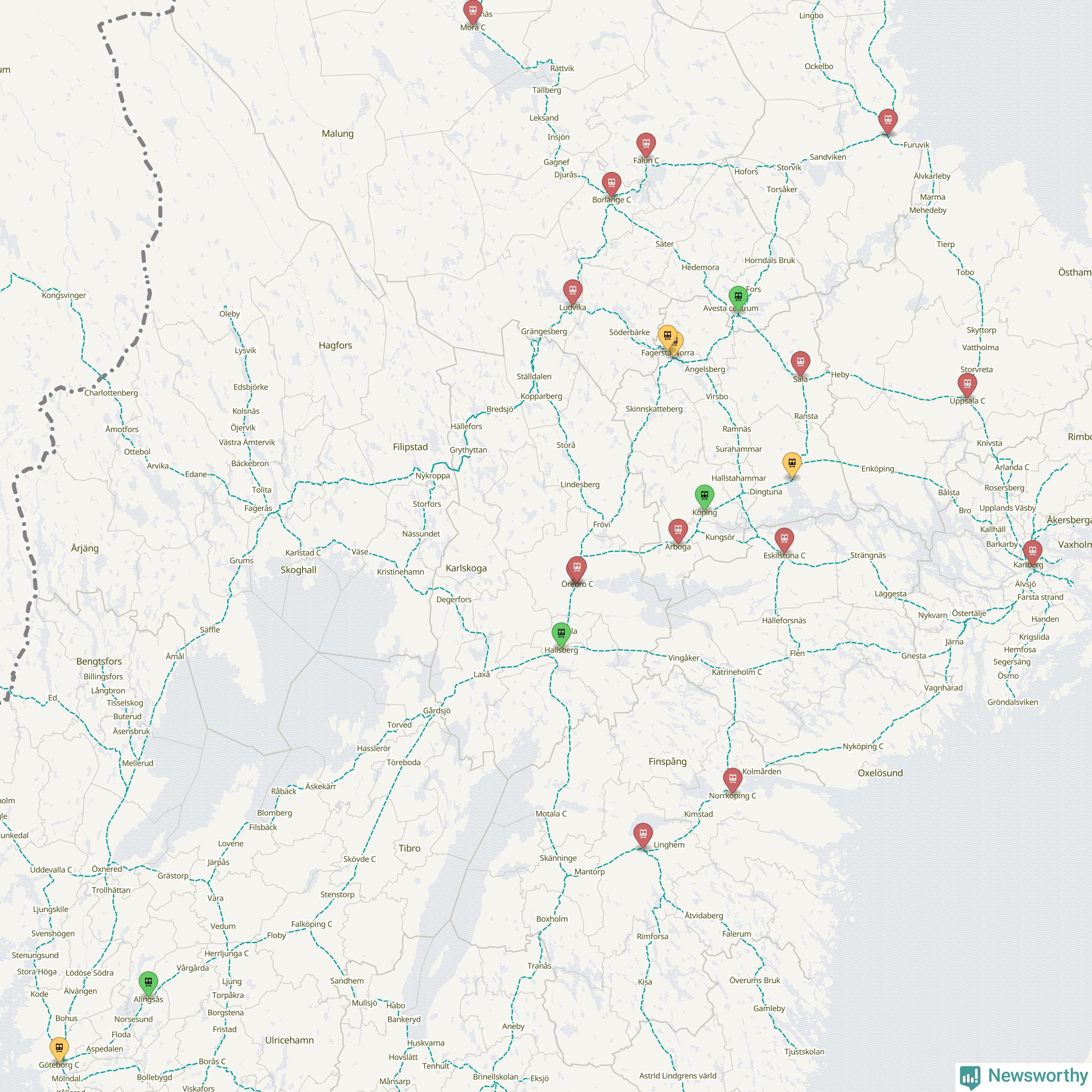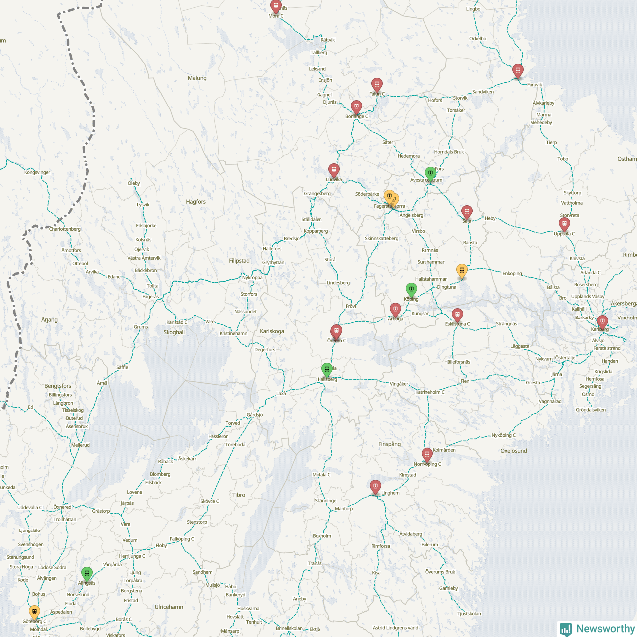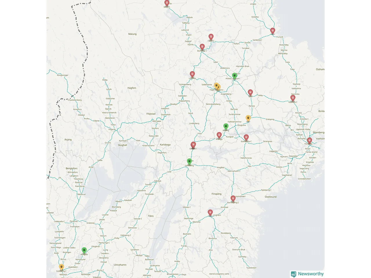 Kartdata från Mapbox, Newsworthy, OpenStreetMap och Trafikverket. Uppgifter om sträckor med passagerartrafik från jarnvag.net.