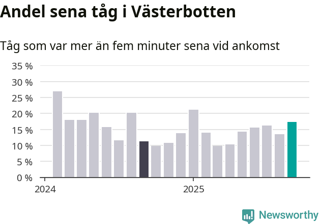 17 procent kan jämföras med 14 procent månaden innan, och elva procent i september 2024. Siffrorna bygger på realtidsinformation om tågavgångar och ankomster från Trafikverket, som Newsworthy löpande samlar in.