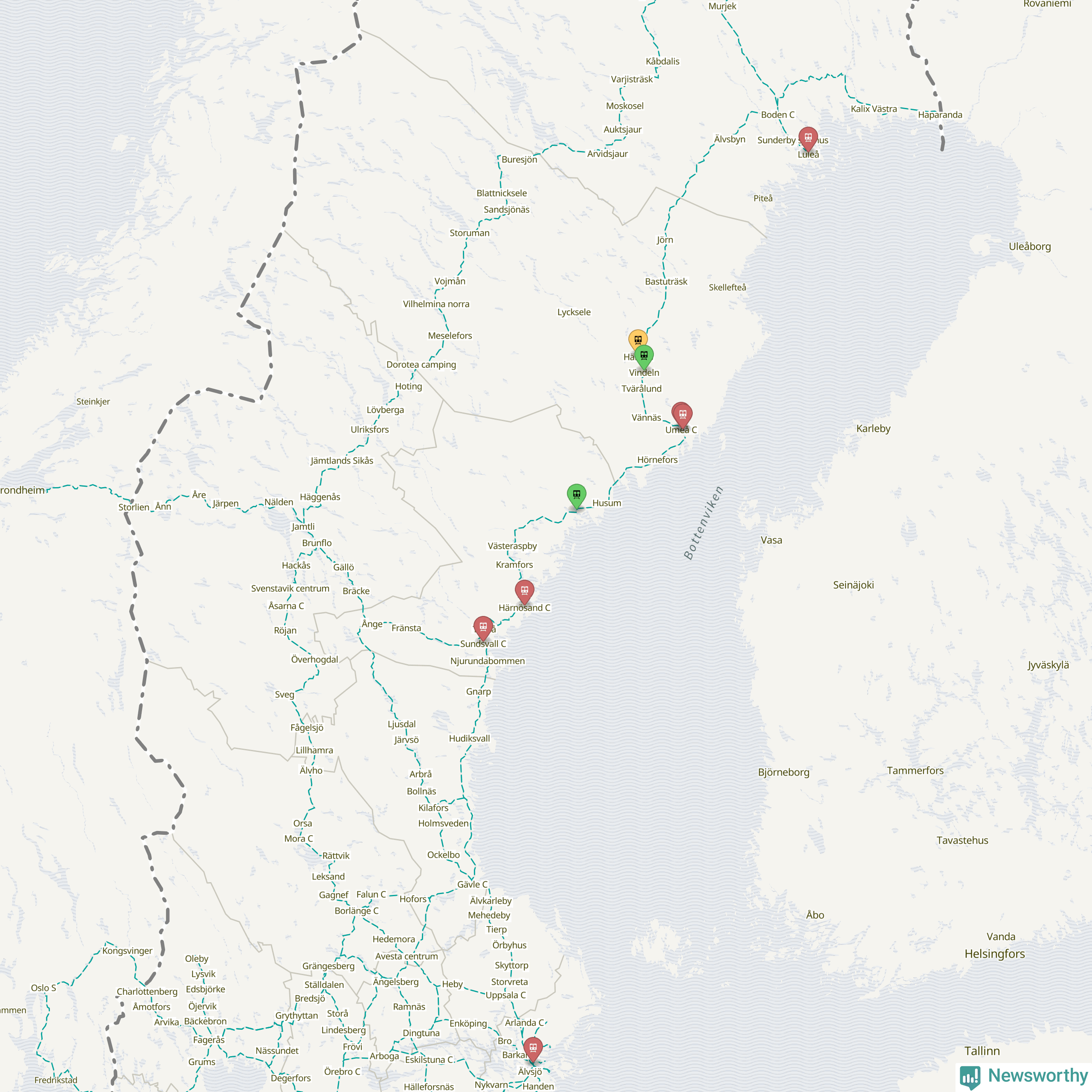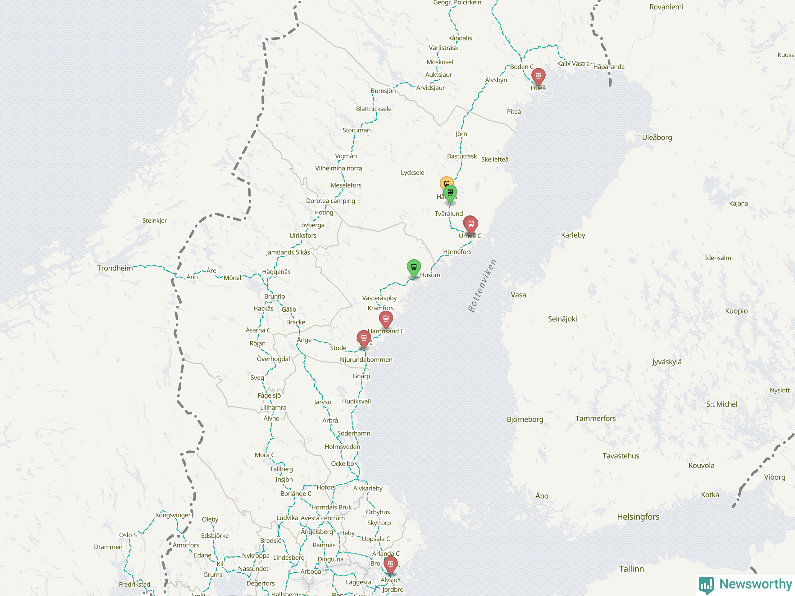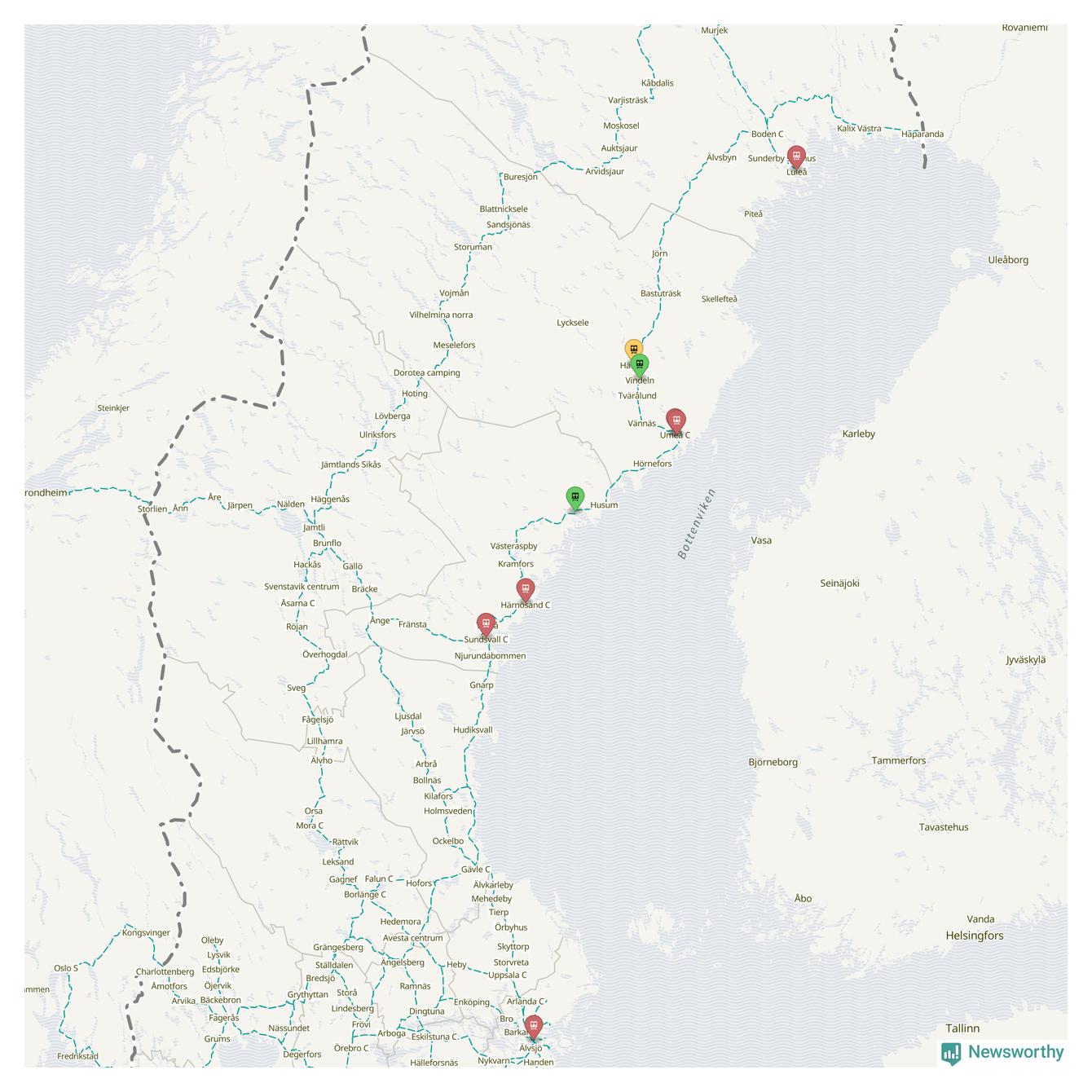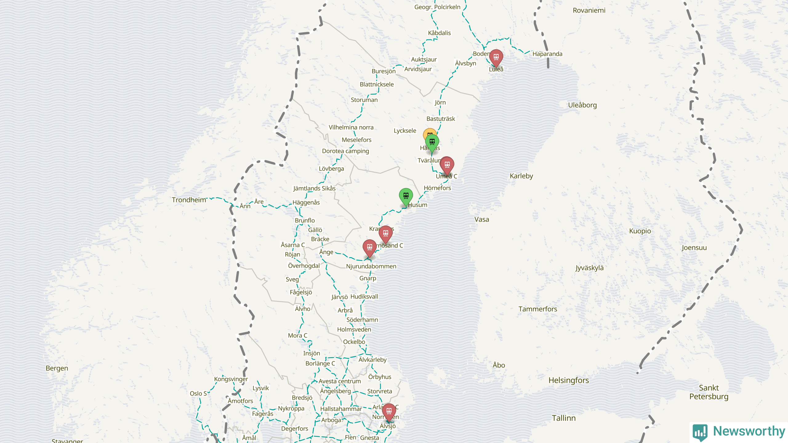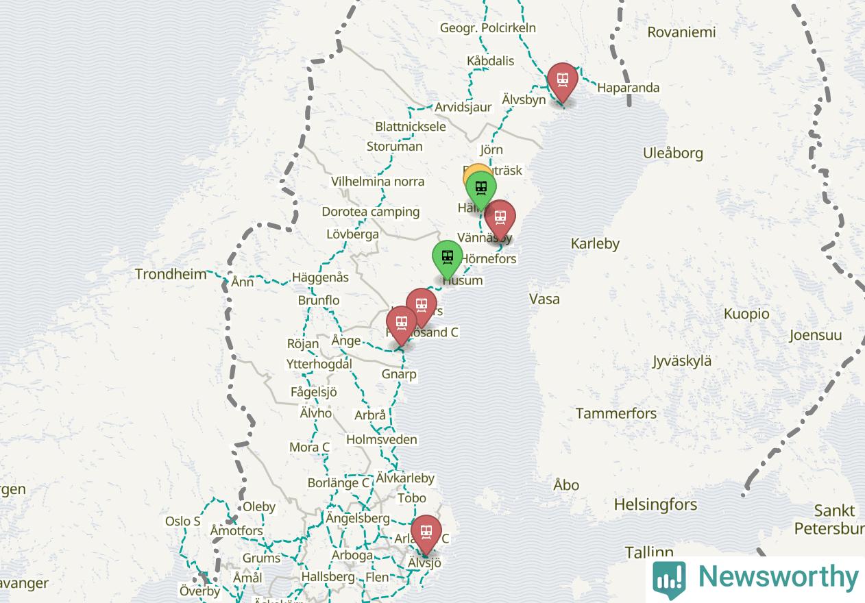 Kartdata från Mapbox, Newsworthy, OpenStreetMap och Trafikverket. Uppgifter om sträckor med passagerartrafik från jarnvag.net.