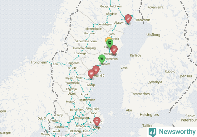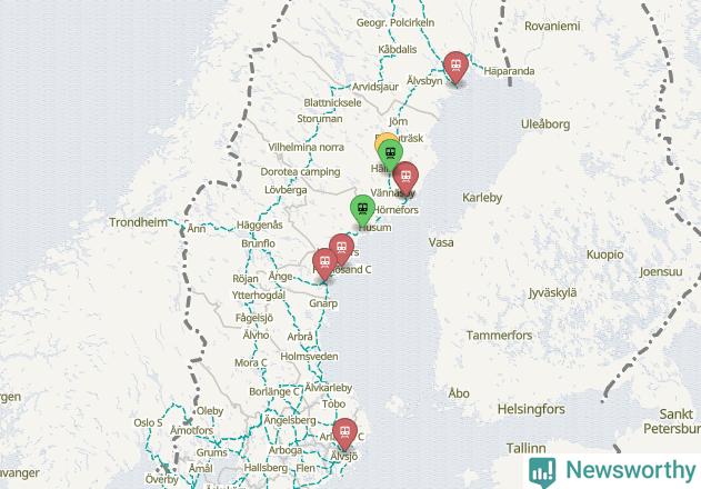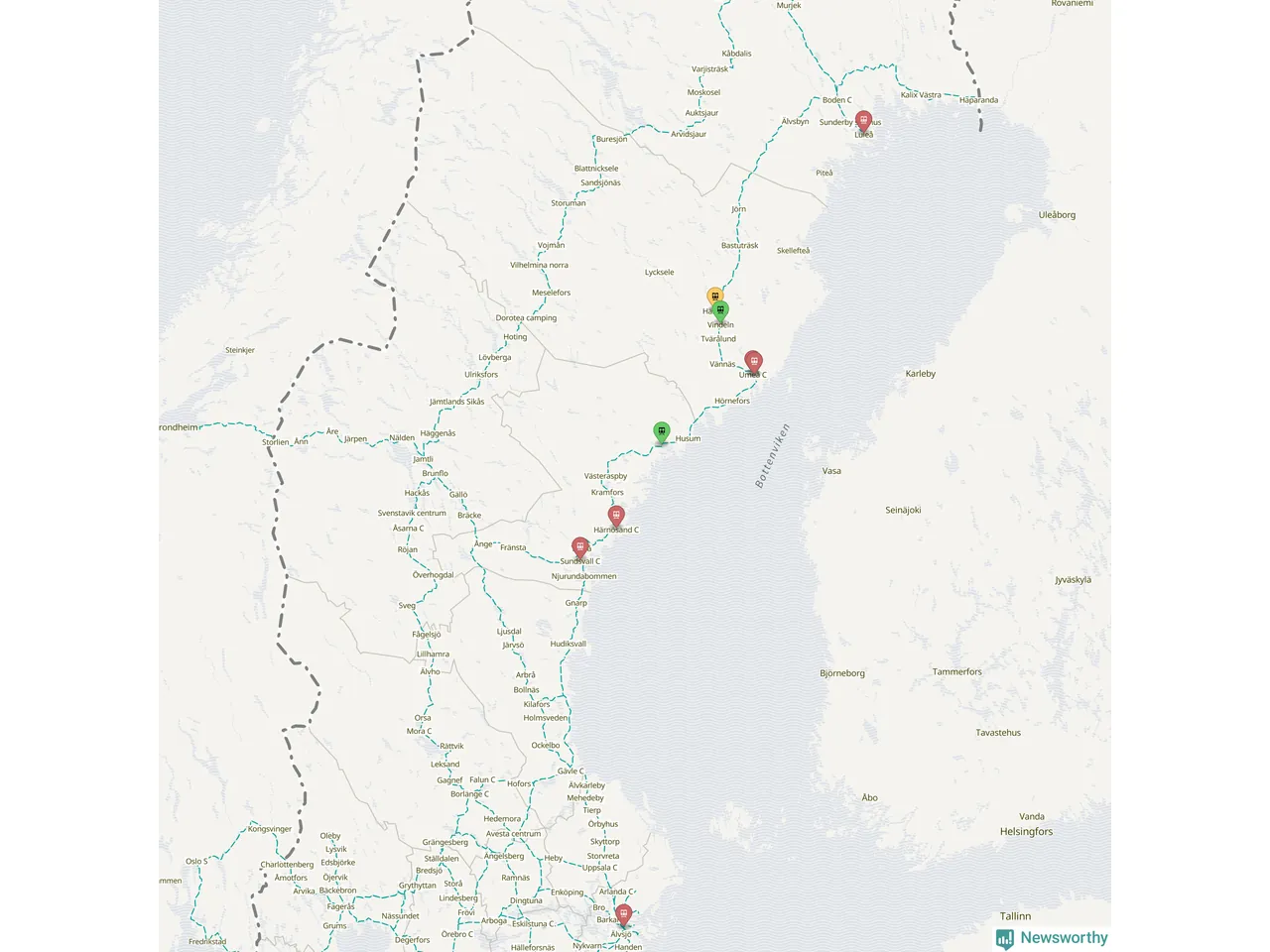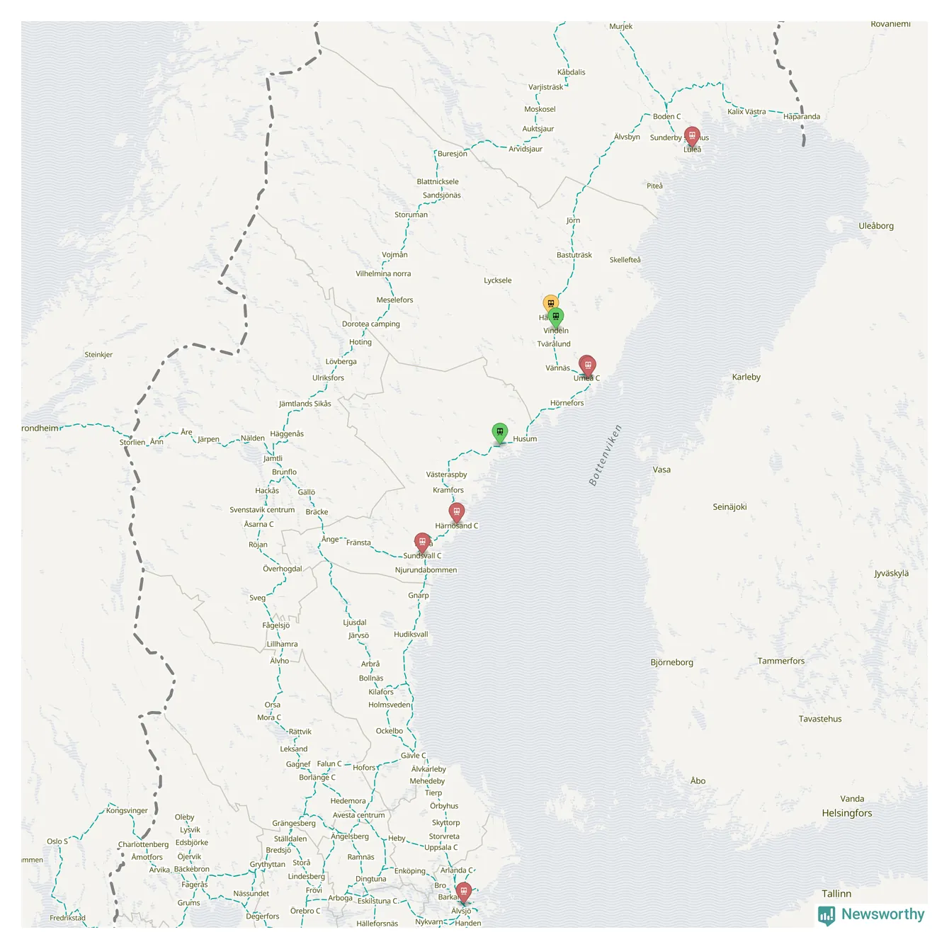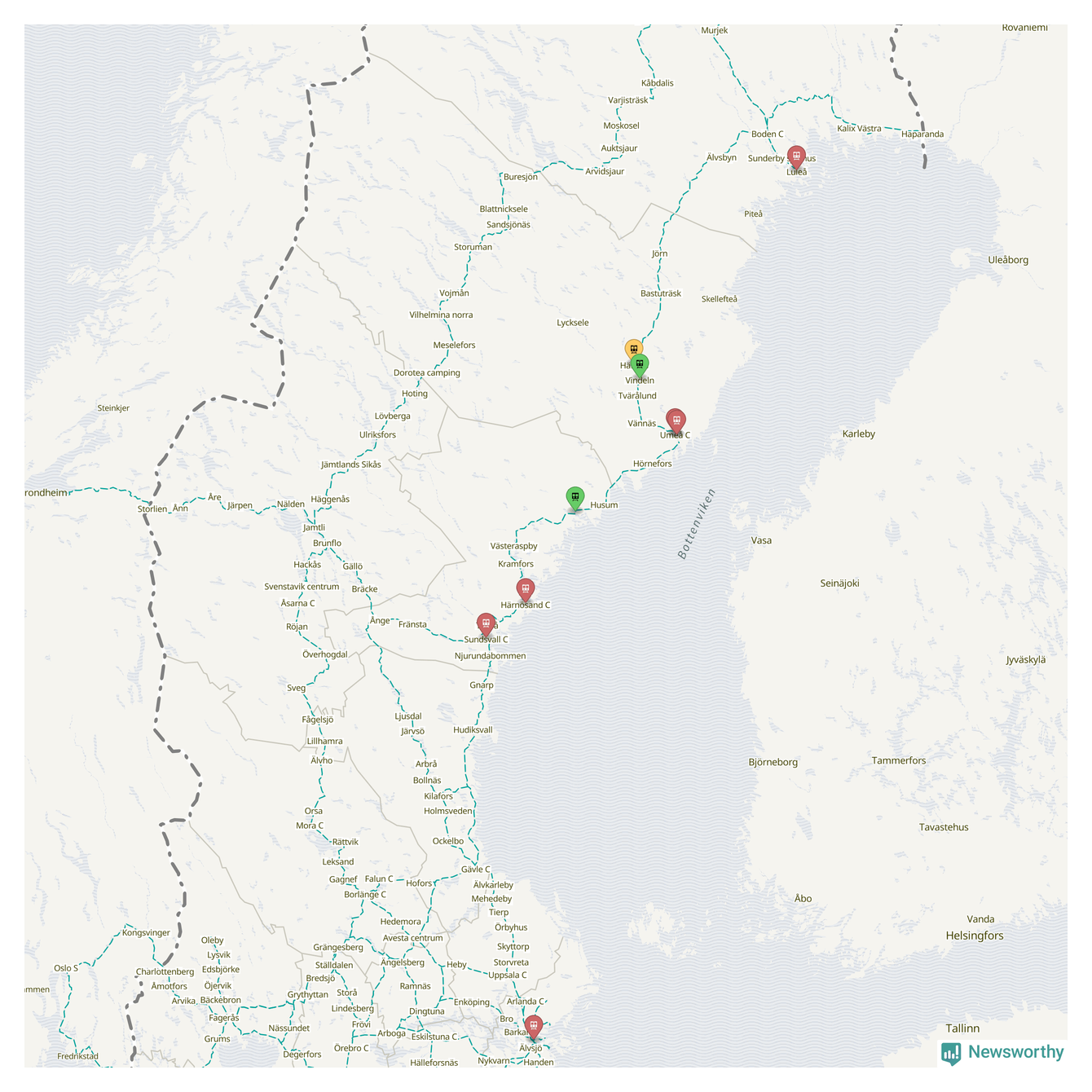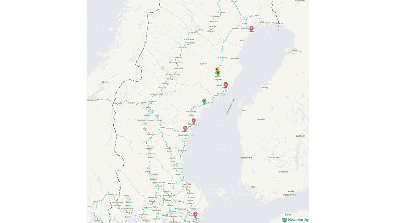 Kartdata från Mapbox, Newsworthy, OpenStreetMap och Trafikverket. Uppgifter om sträckor med passagerartrafik från jarnvag.net.
