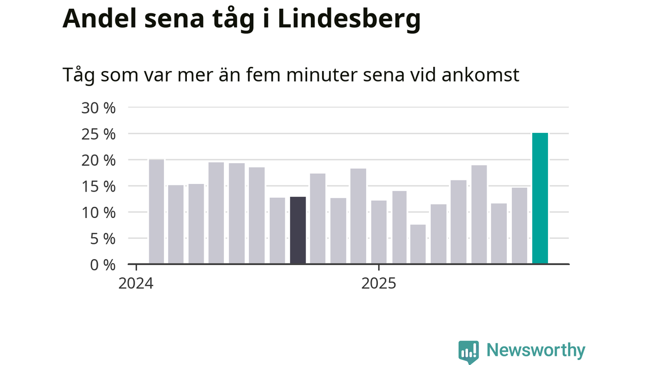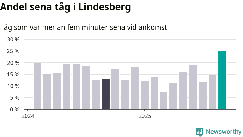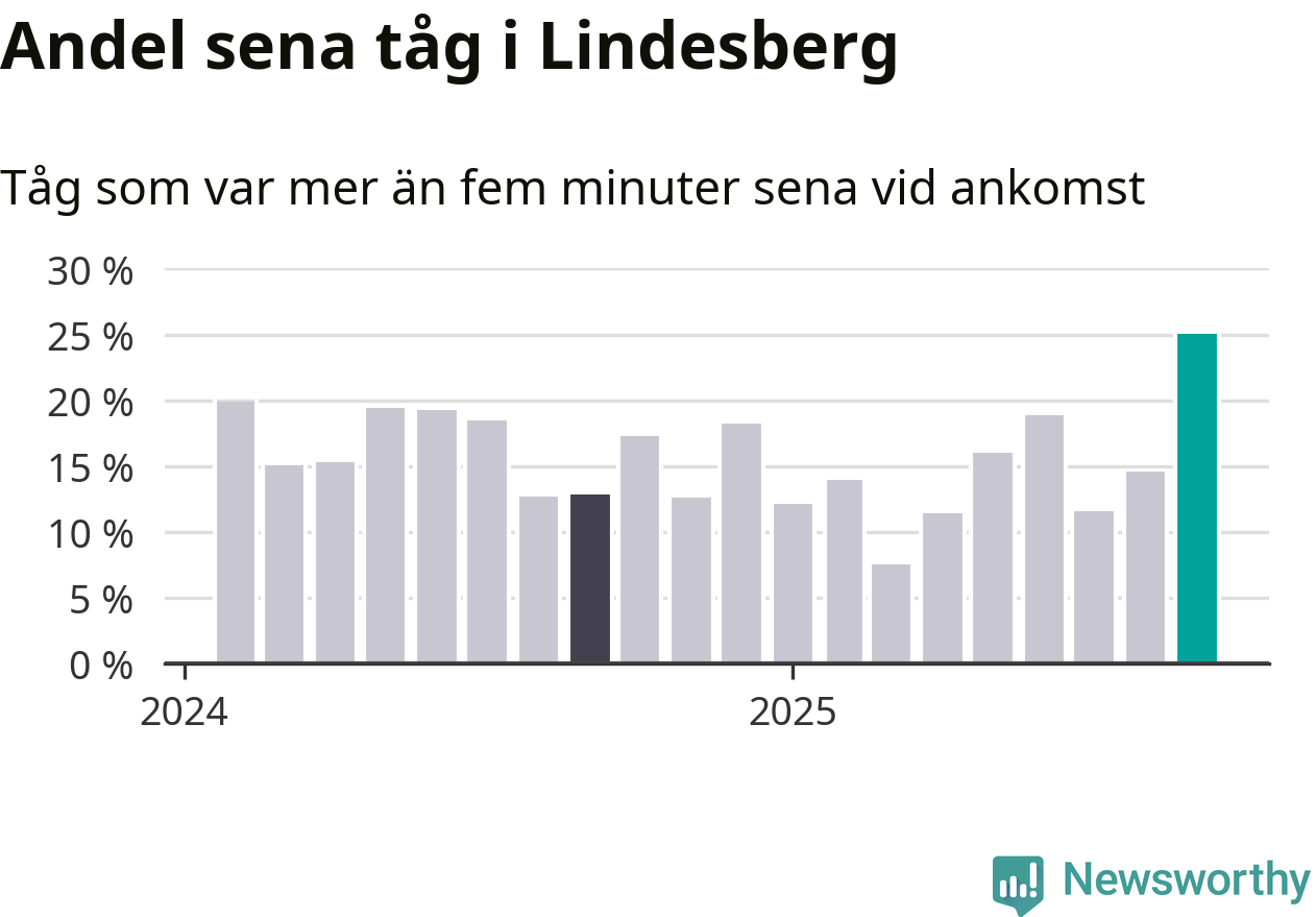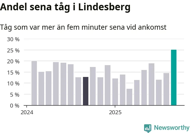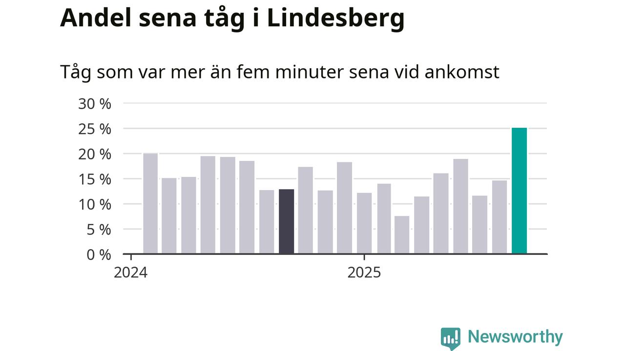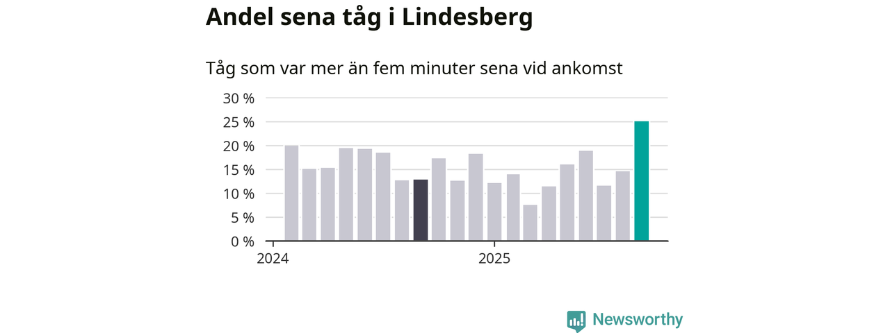 25 procent är den högsta andelen sena tåg sedan åtminstone den hårt förseningsdrabbade vintern 2023/24. Siffrorna bygger på realtidsinformation om tågavgångar och ankomster från Trafikverket, som Newsworthy löpande samlar in.