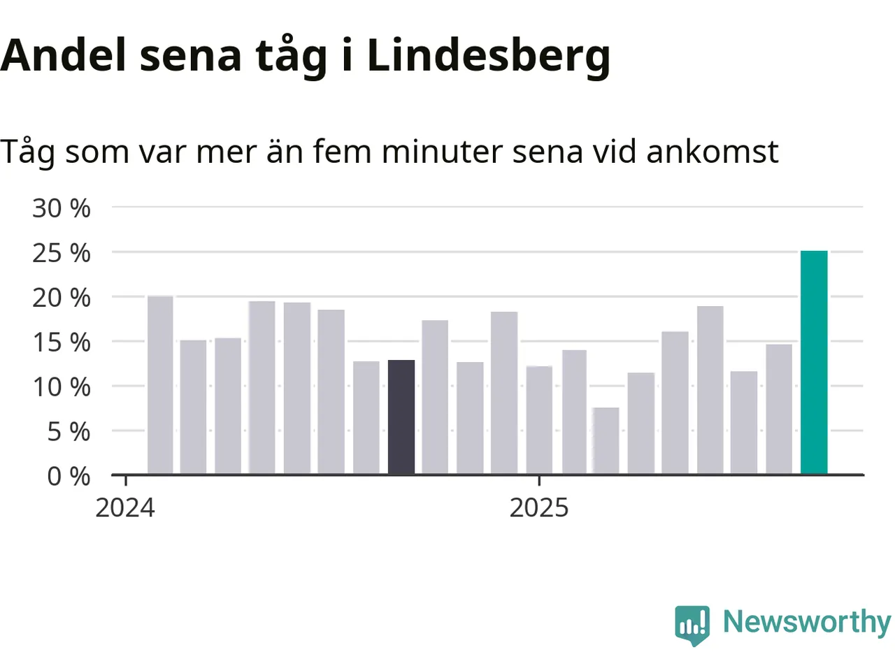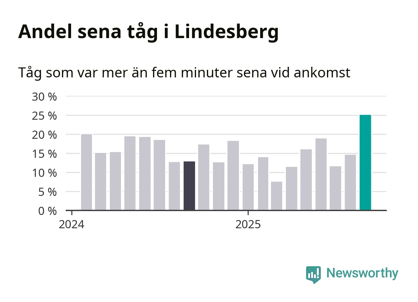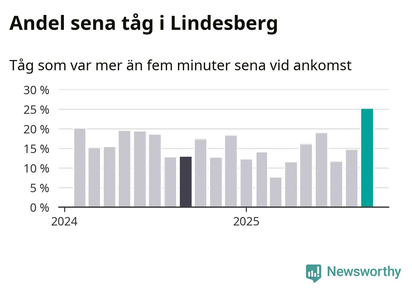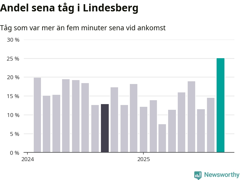 25 procent är den högsta andelen sena tåg sedan åtminstone den hårt förseningsdrabbade vintern 2023/24. Siffrorna bygger på realtidsinformation om tågavgångar och ankomster från Trafikverket, som Newsworthy löpande samlar in.