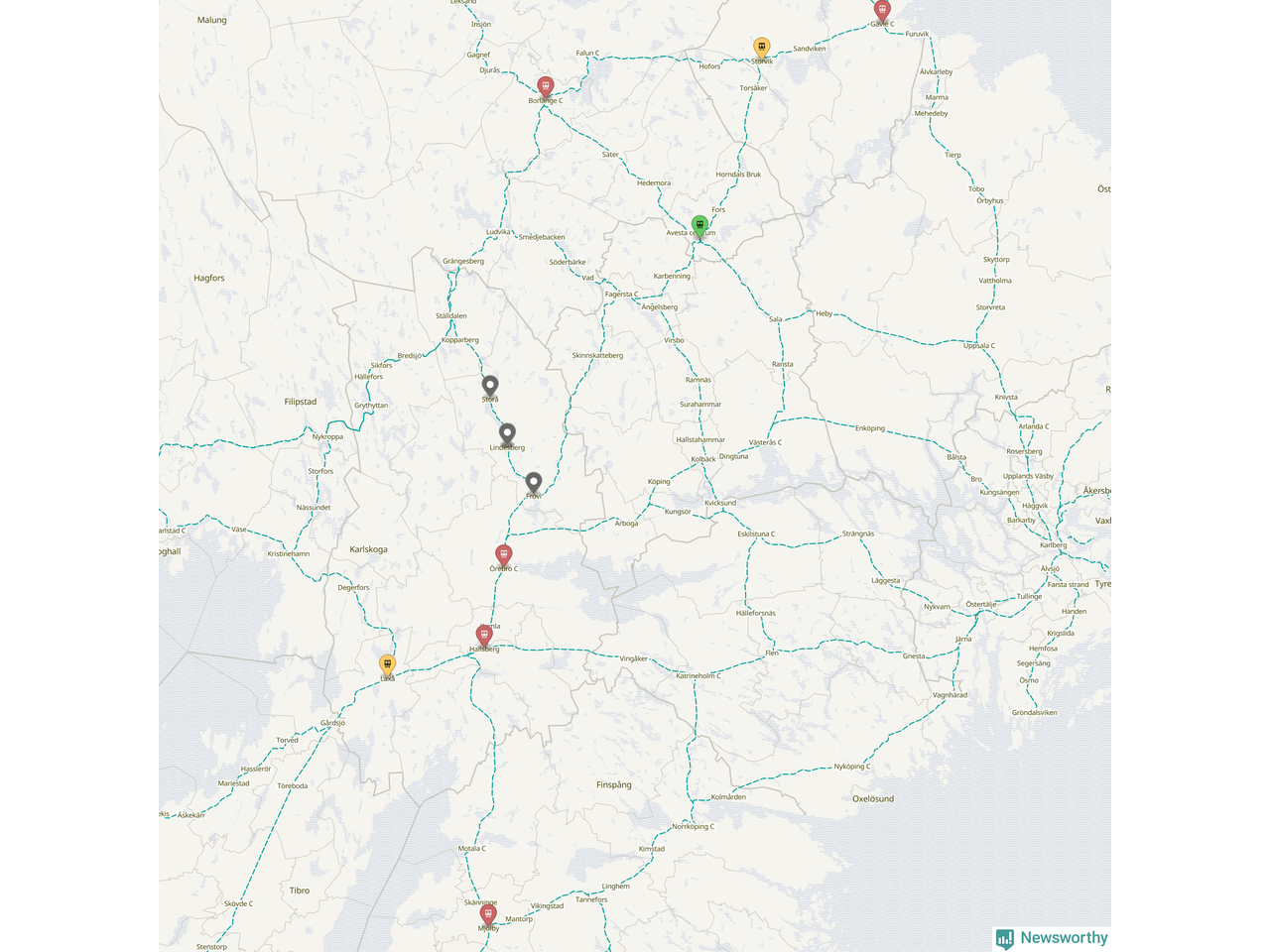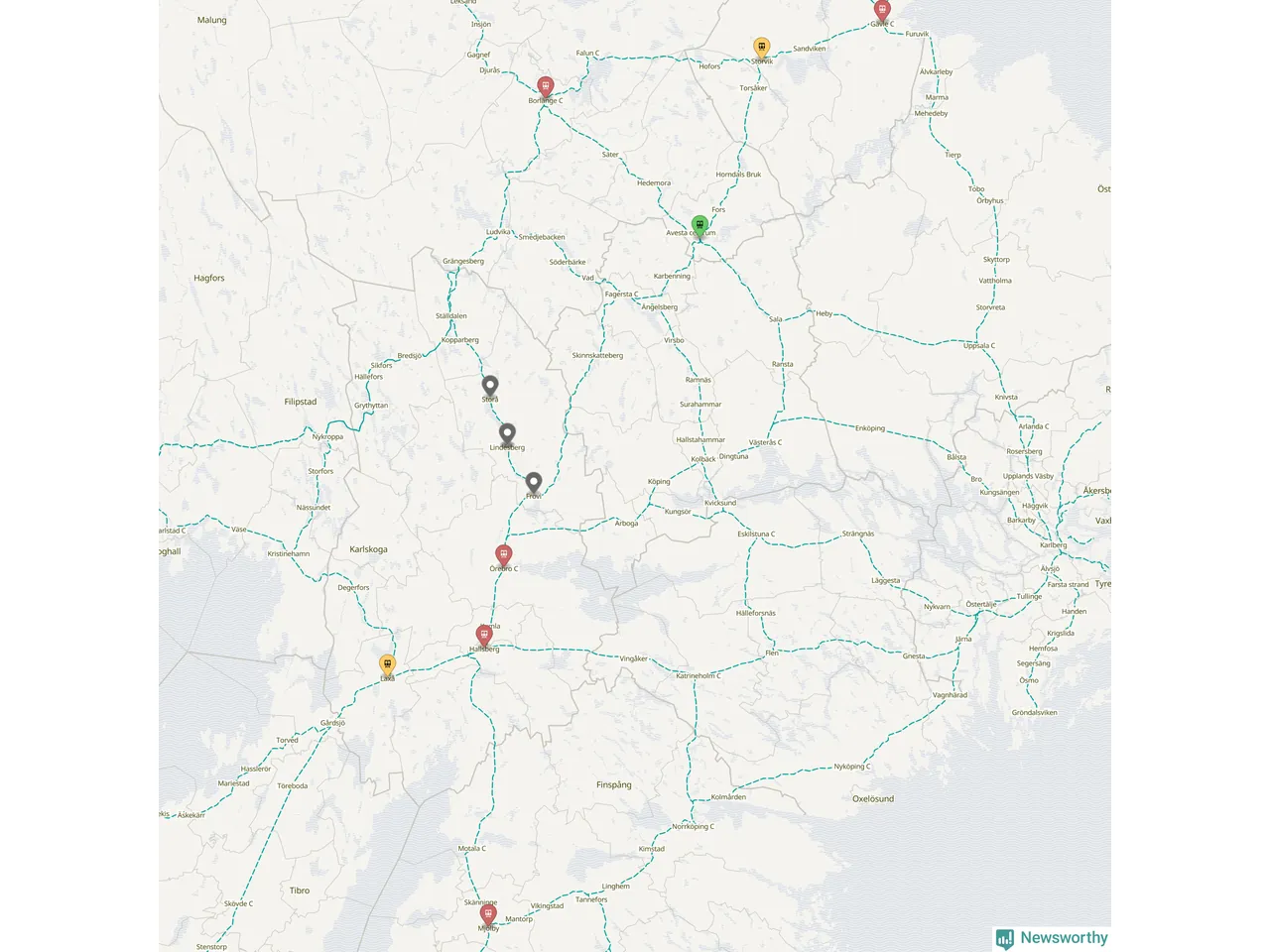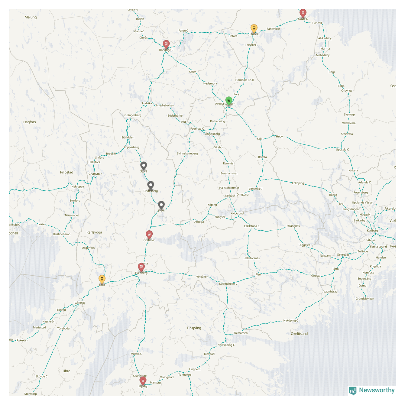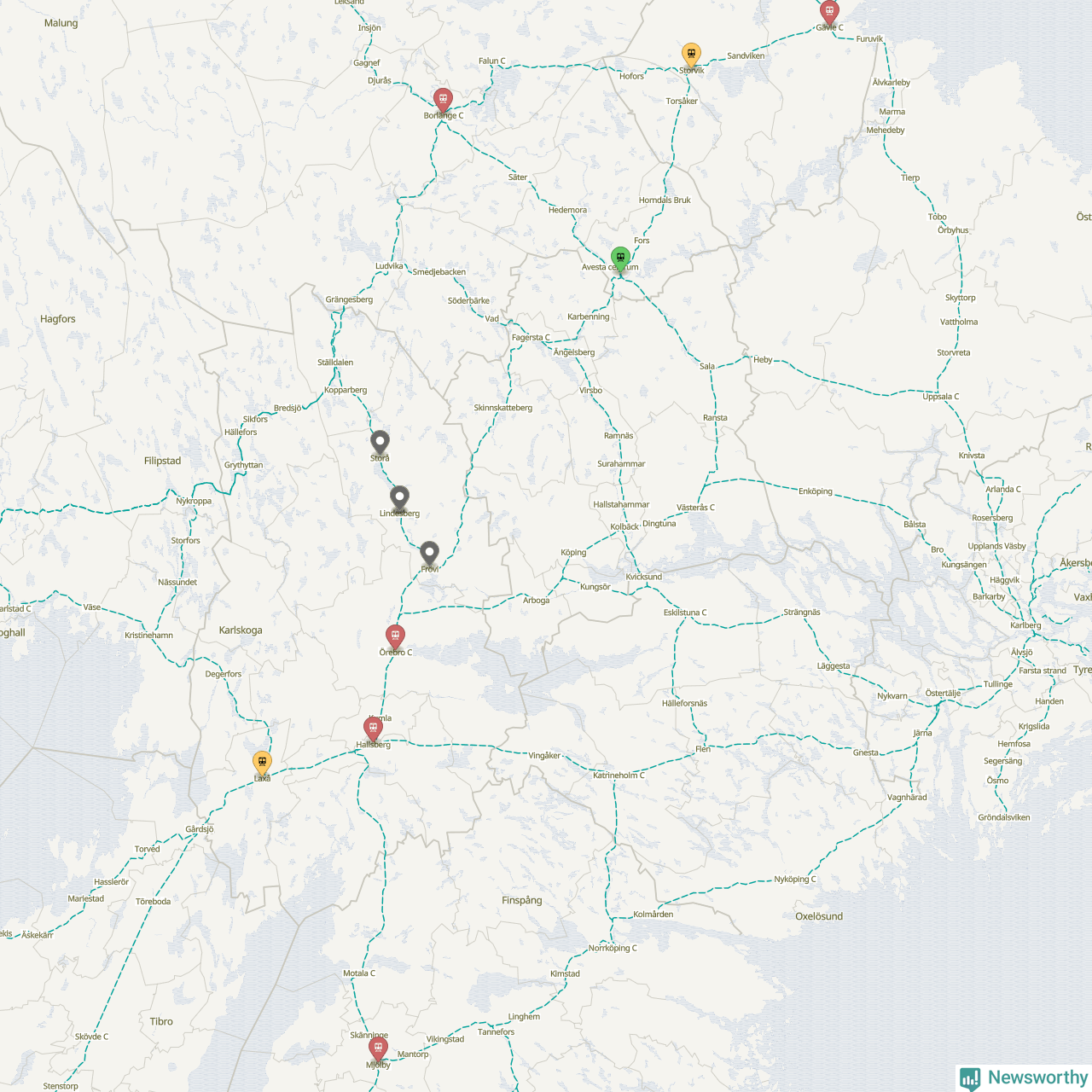 Kartdata från Mapbox, Newsworthy, OpenStreetMap och Trafikverket. Uppgifter om sträckor med passagerartrafik från jarnvag.net.