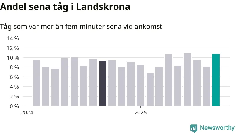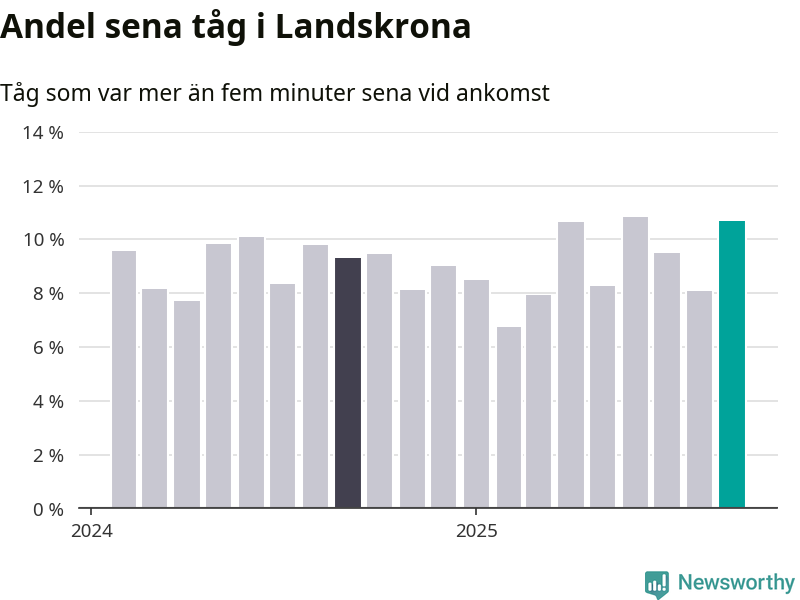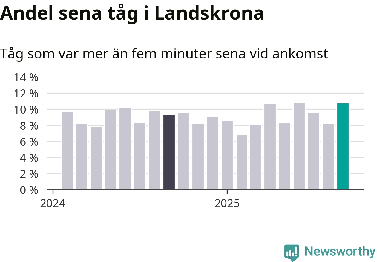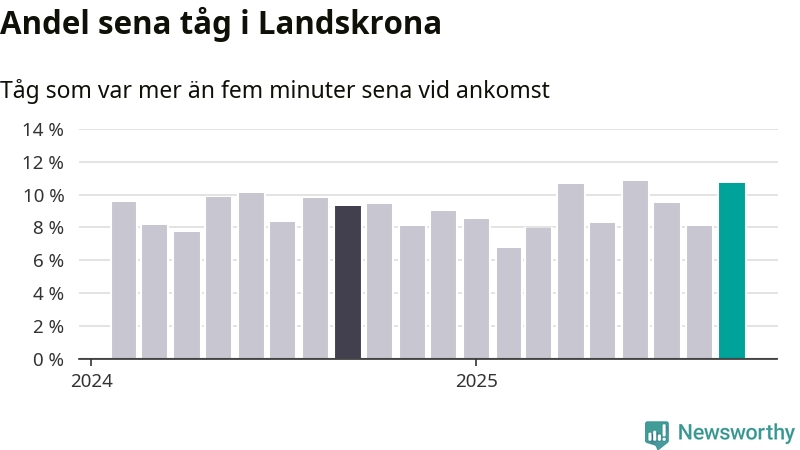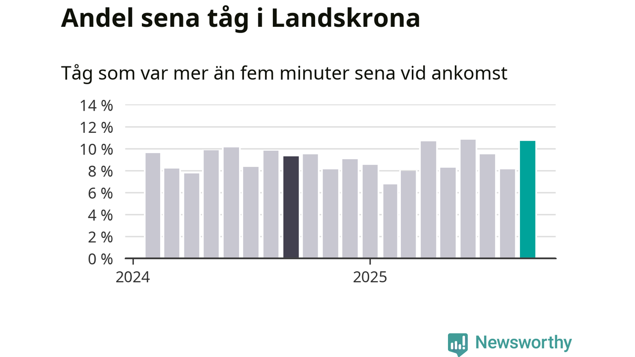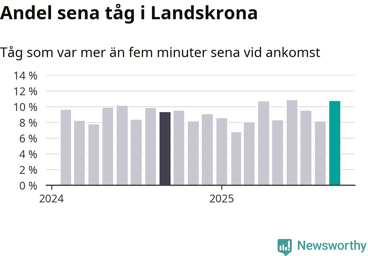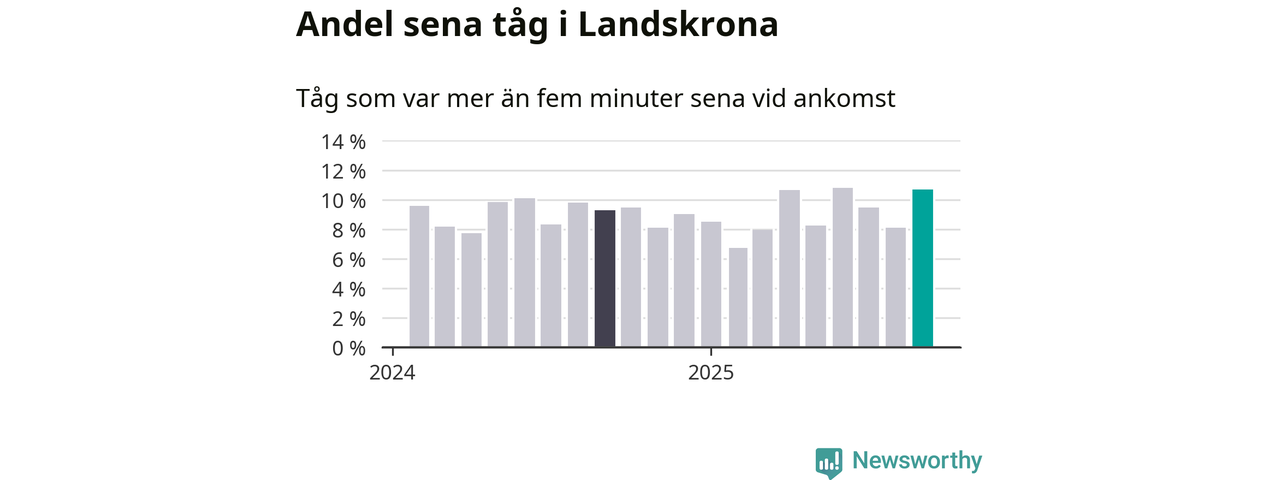 Elva procent kan jämföras med åtta procent månaden innan, och nio procent i september 2024. Siffrorna bygger på realtidsinformation om tågavgångar och ankomster från Trafikverket, som Newsworthy löpande samlar in.