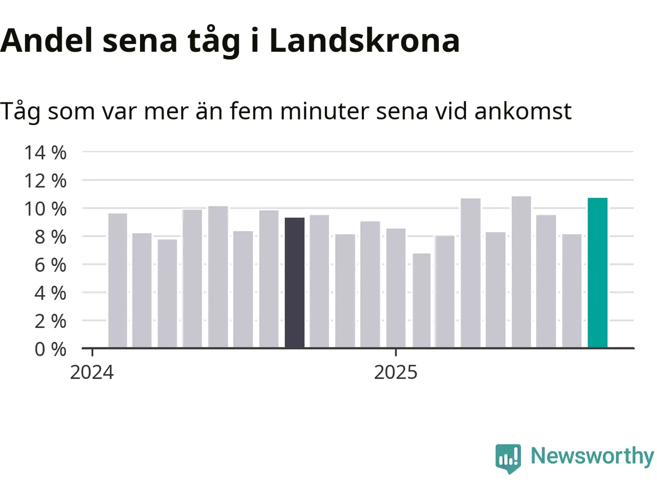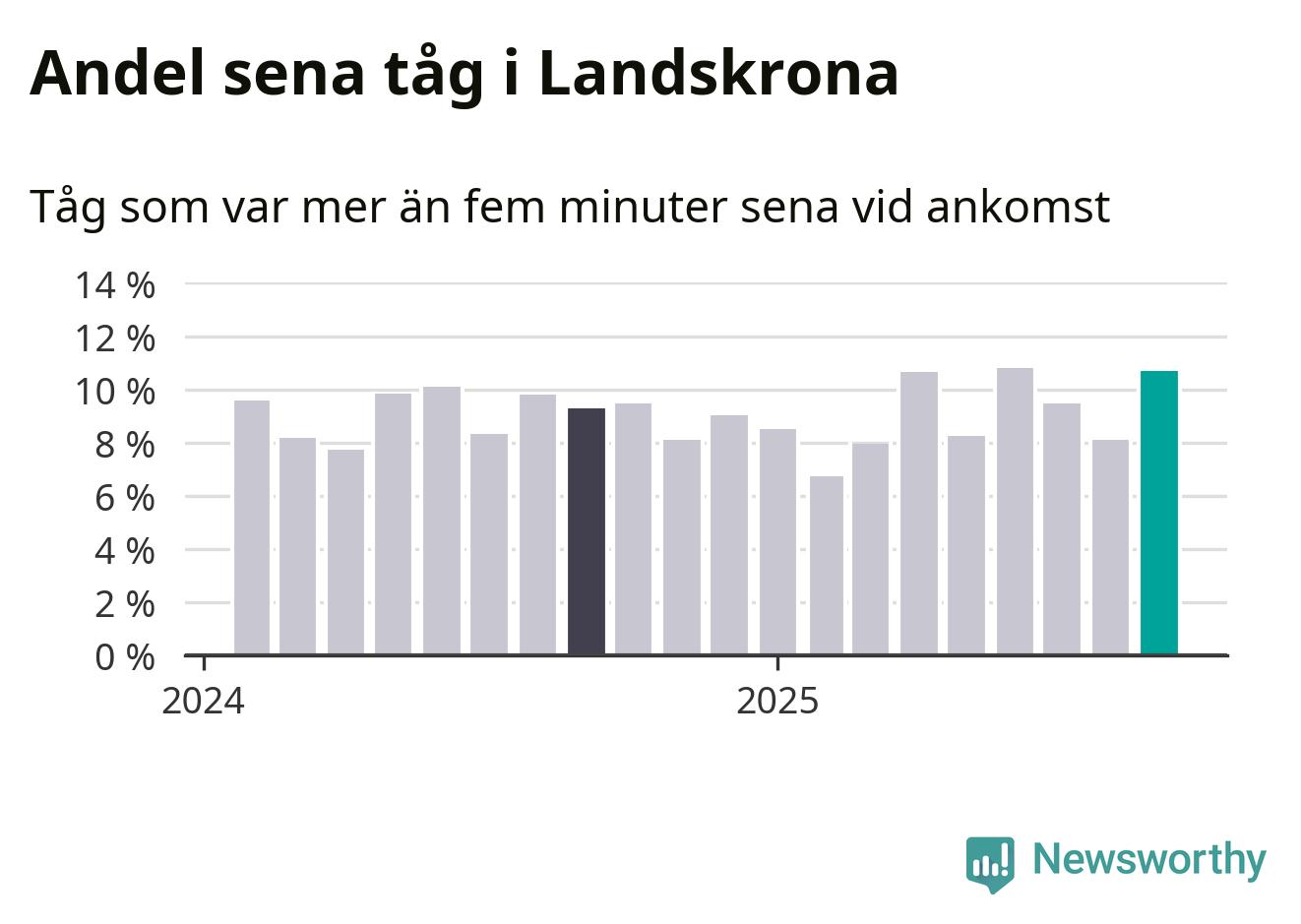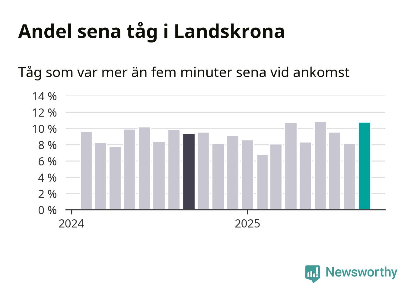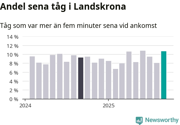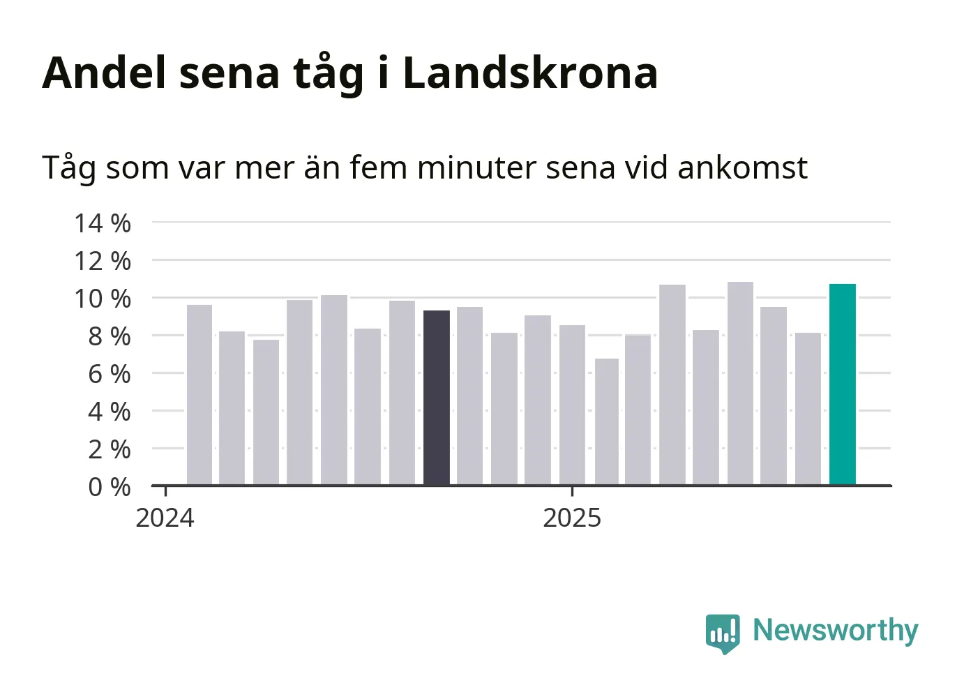 Elva procent kan jämföras med åtta procent månaden innan, och nio procent i september 2024. Siffrorna bygger på realtidsinformation om tågavgångar och ankomster från Trafikverket, som Newsworthy löpande samlar in.