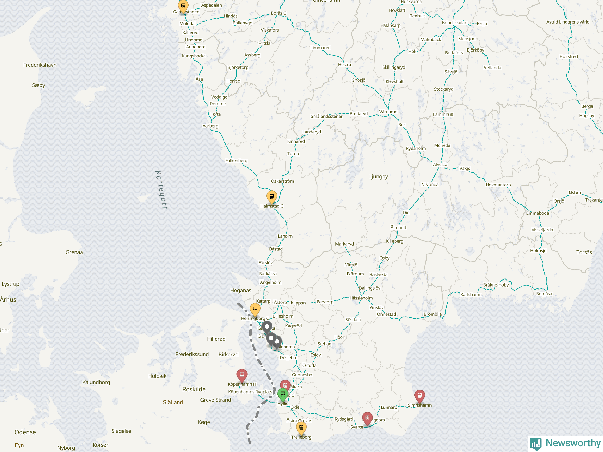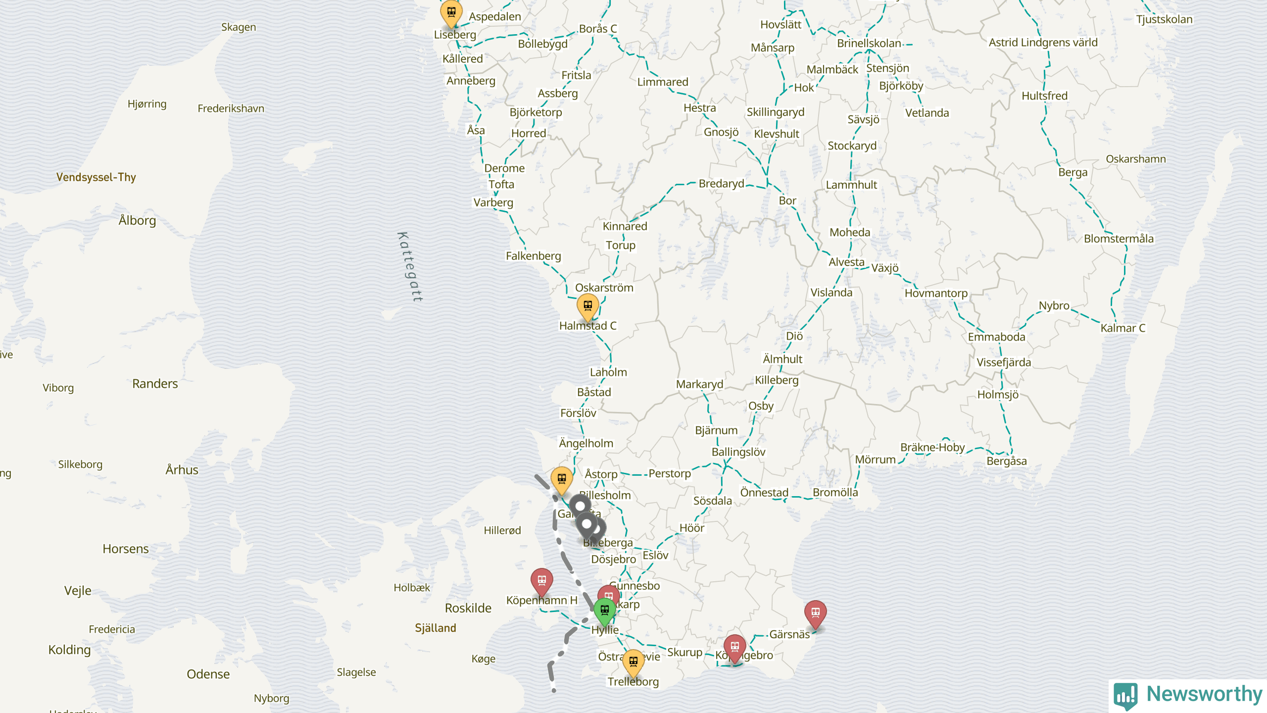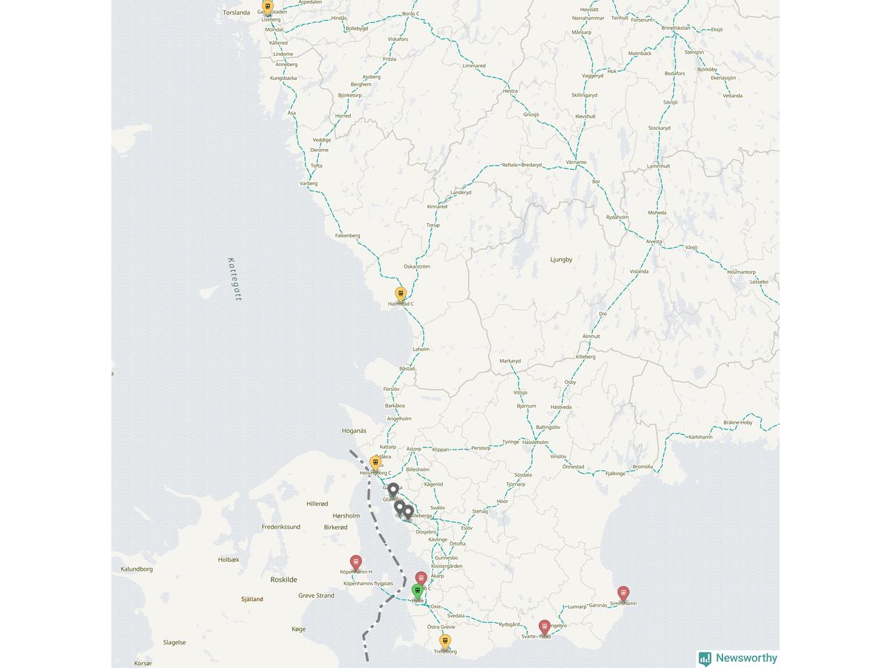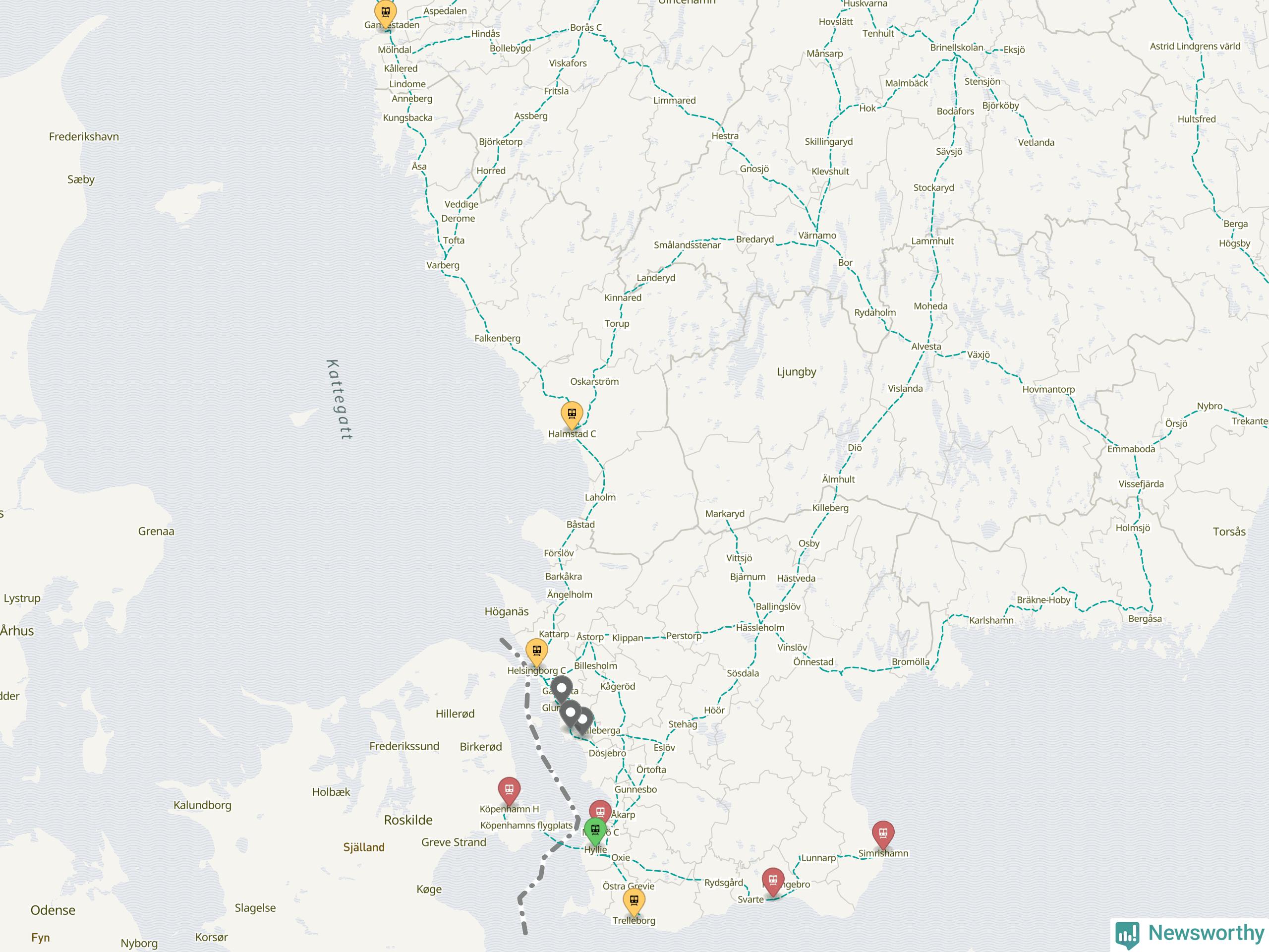 Kartdata från Mapbox, Newsworthy, OpenStreetMap och Trafikverket. Uppgifter om sträckor med passagerartrafik från jarnvag.net.