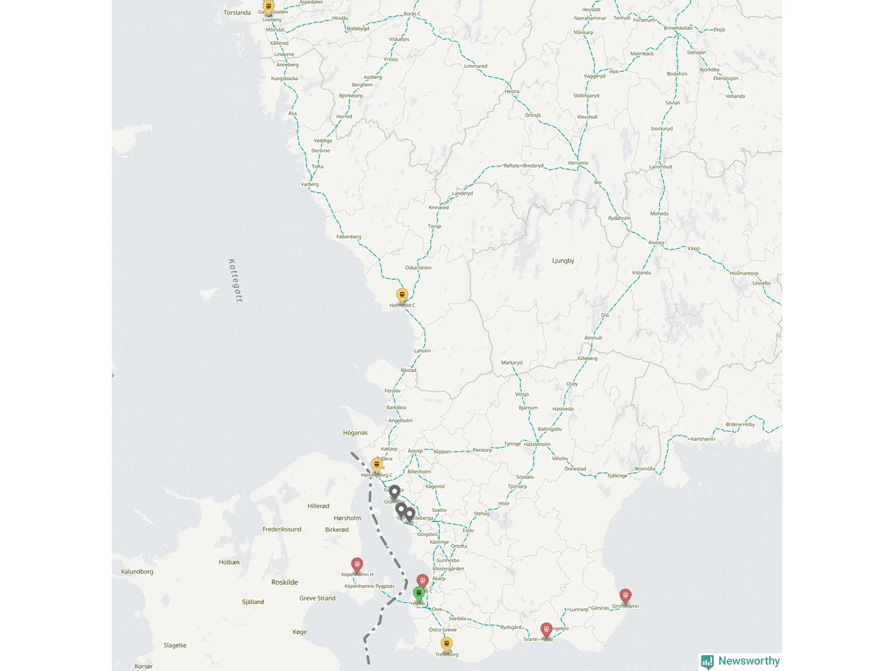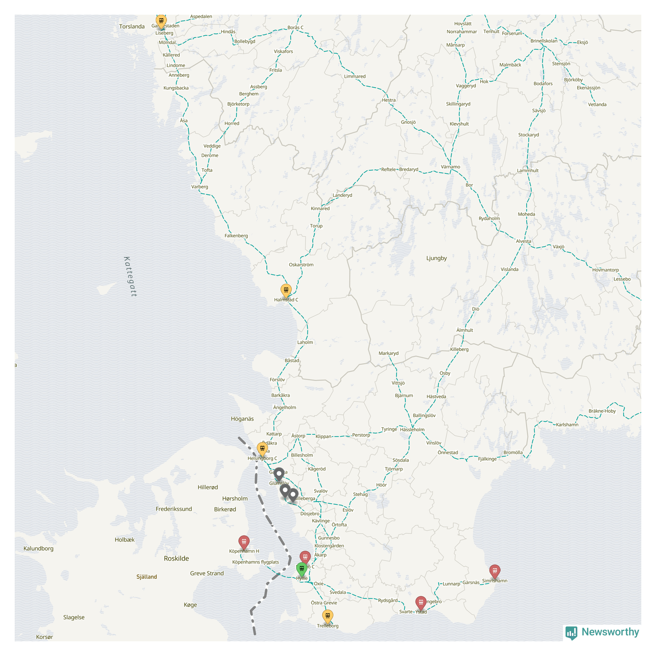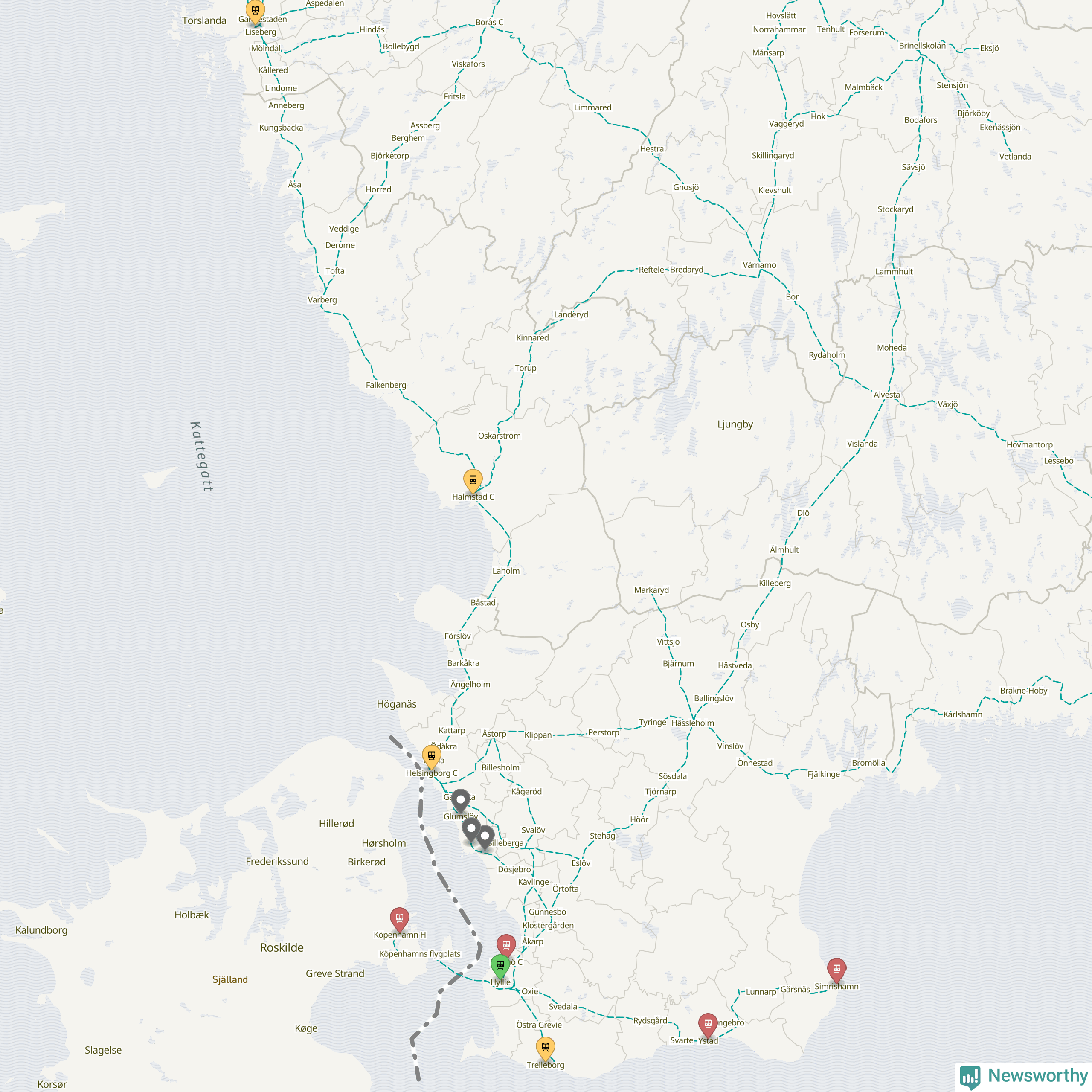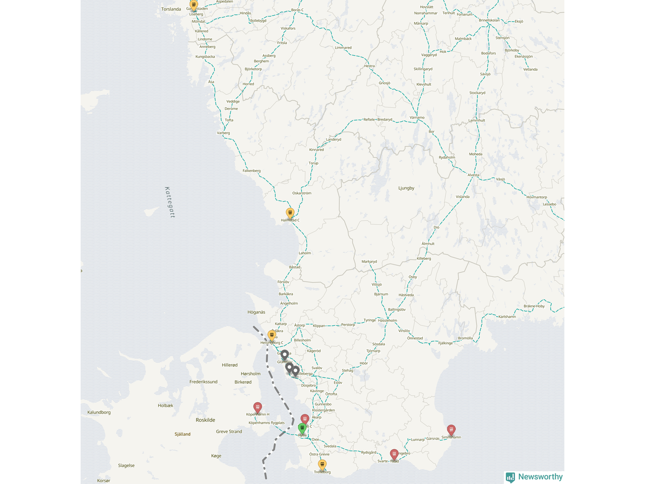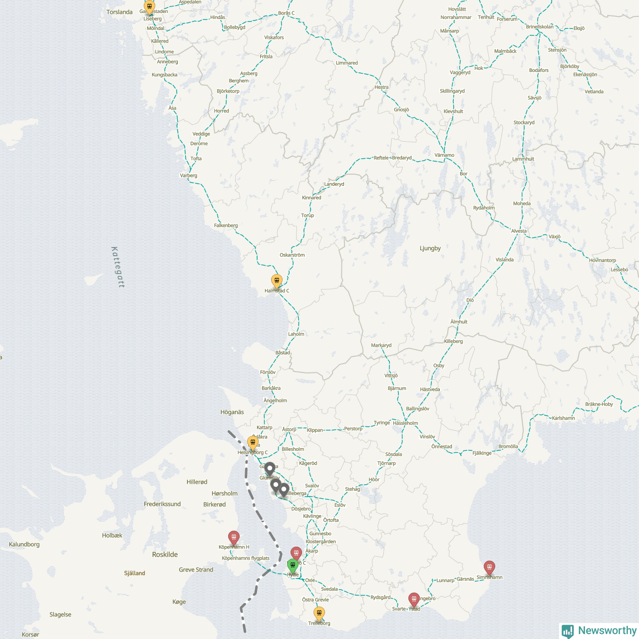 Kartdata från Mapbox, Newsworthy, OpenStreetMap och Trafikverket. Uppgifter om sträckor med passagerartrafik från jarnvag.net.