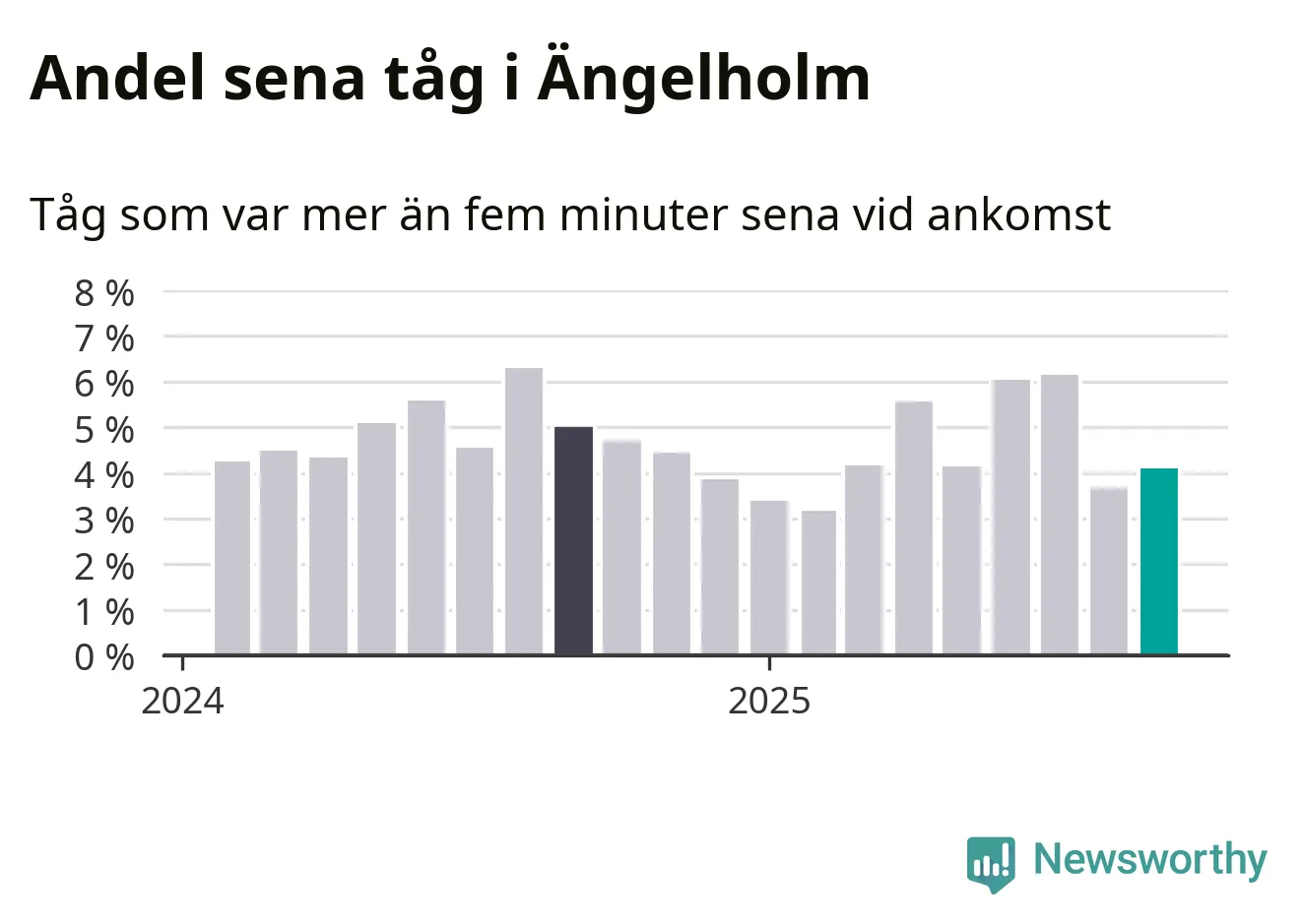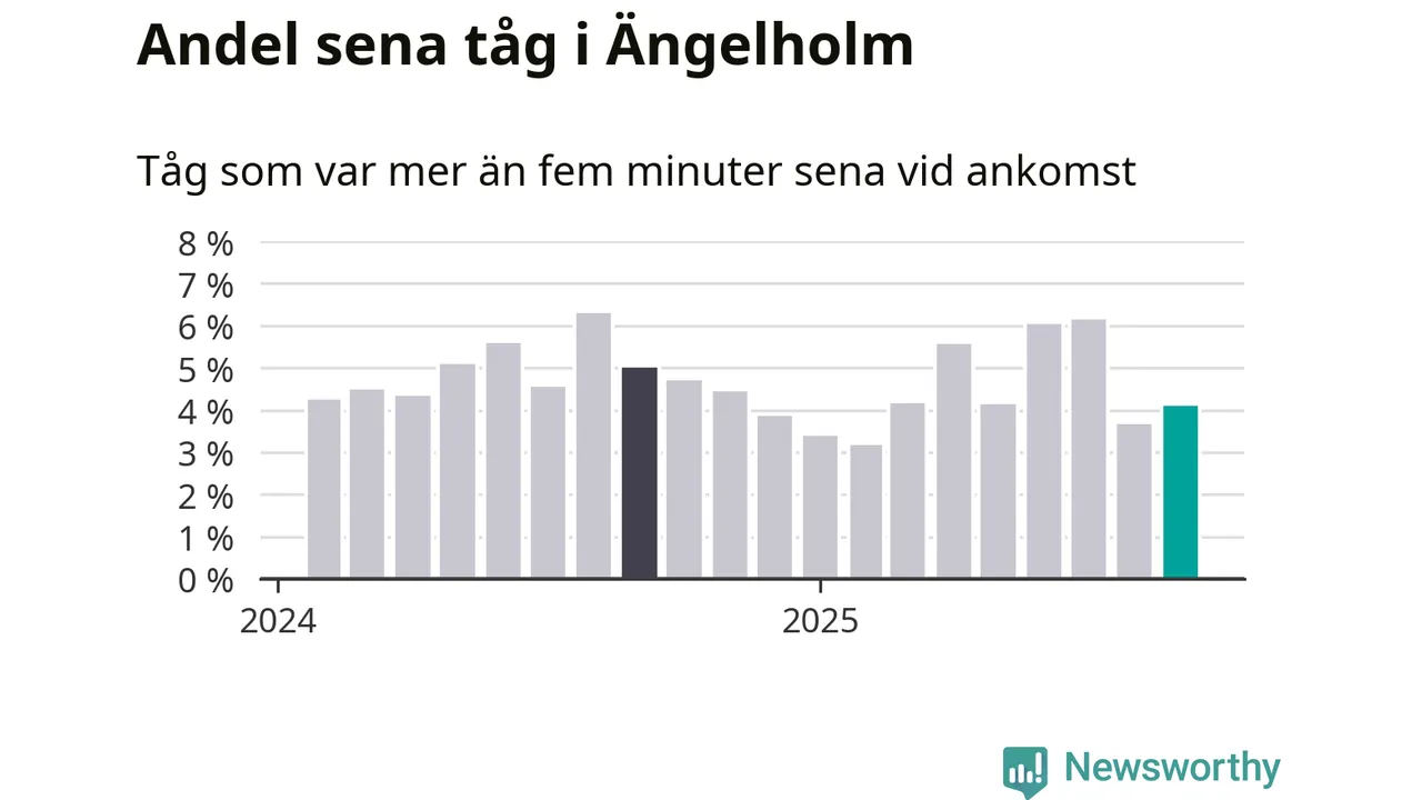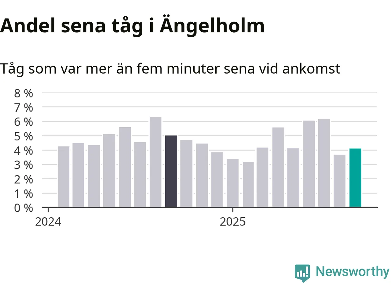 Fyra procent är marginellt mer än månaden innan, och kan jämföras med fem procent i september 2024. Siffrorna bygger på realtidsinformation om tågavgångar och ankomster från Trafikverket, som Newsworthy löpande samlar in.
