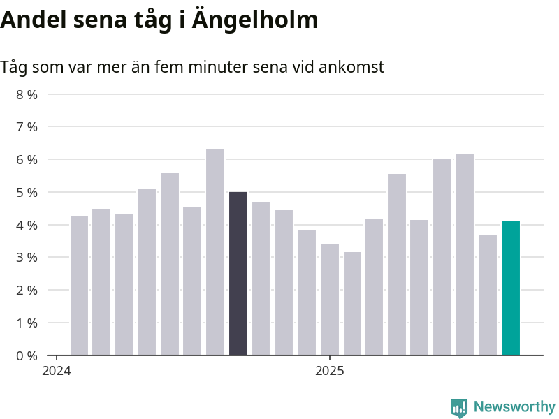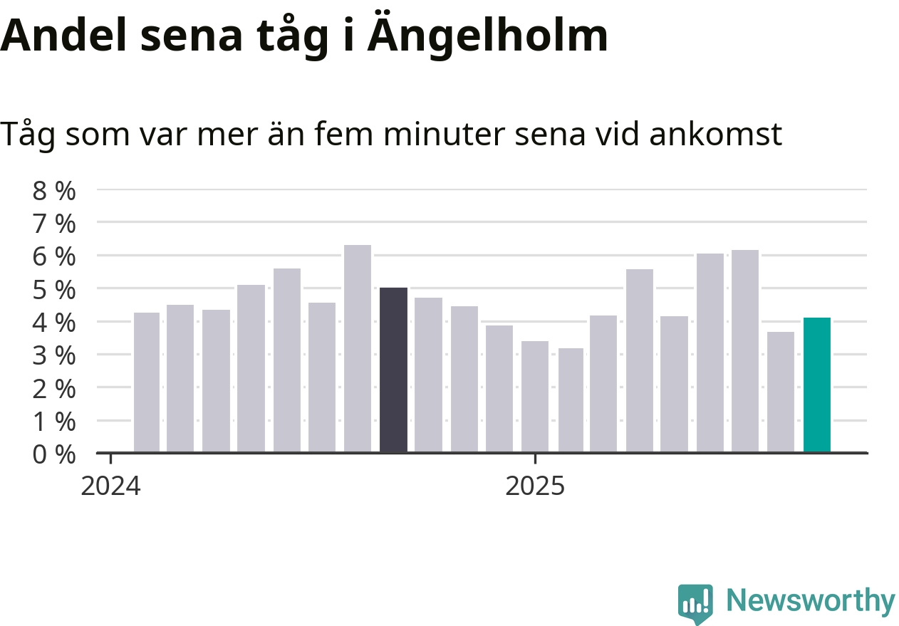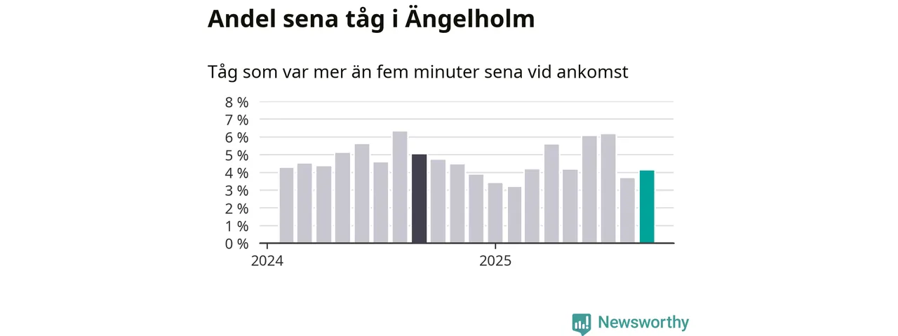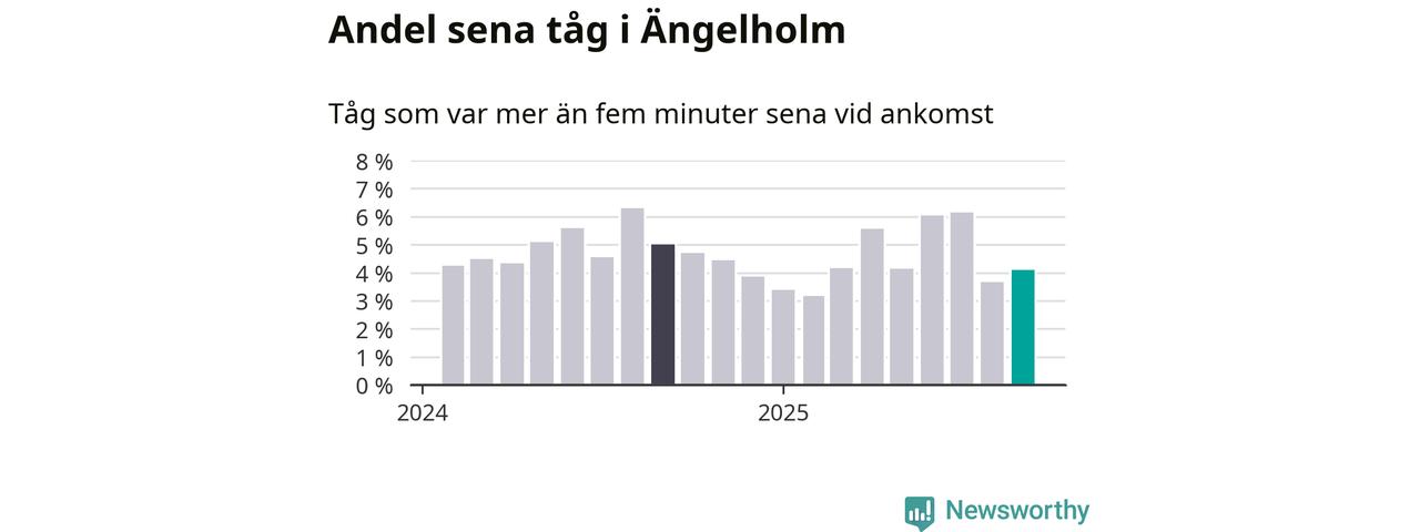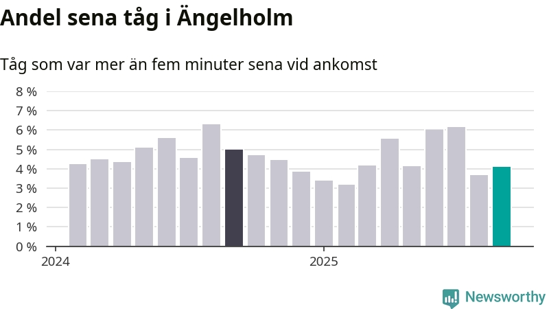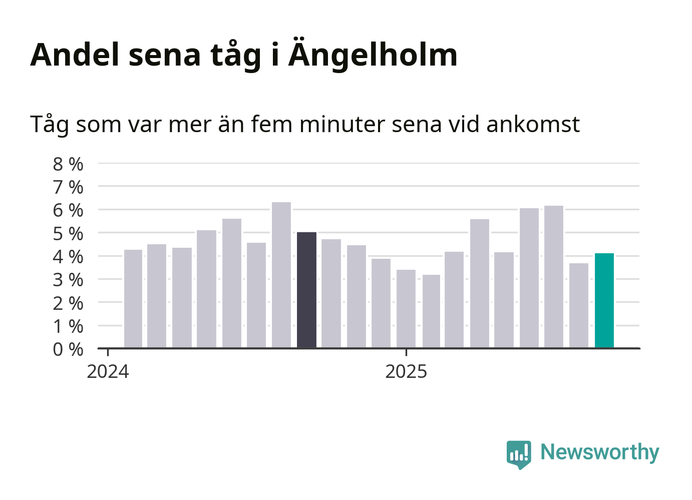 Fyra procent är marginellt mer än månaden innan, och kan jämföras med fem procent i september 2024. Siffrorna bygger på realtidsinformation om tågavgångar och ankomster från Trafikverket, som Newsworthy löpande samlar in.