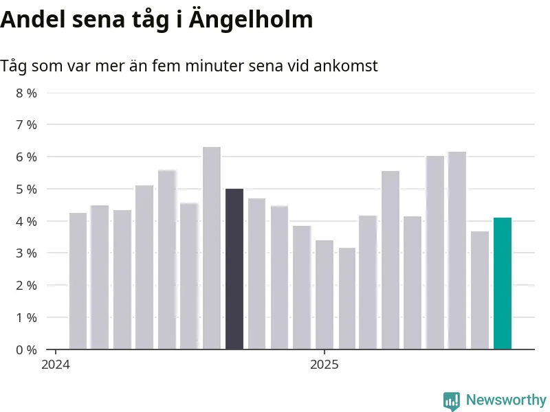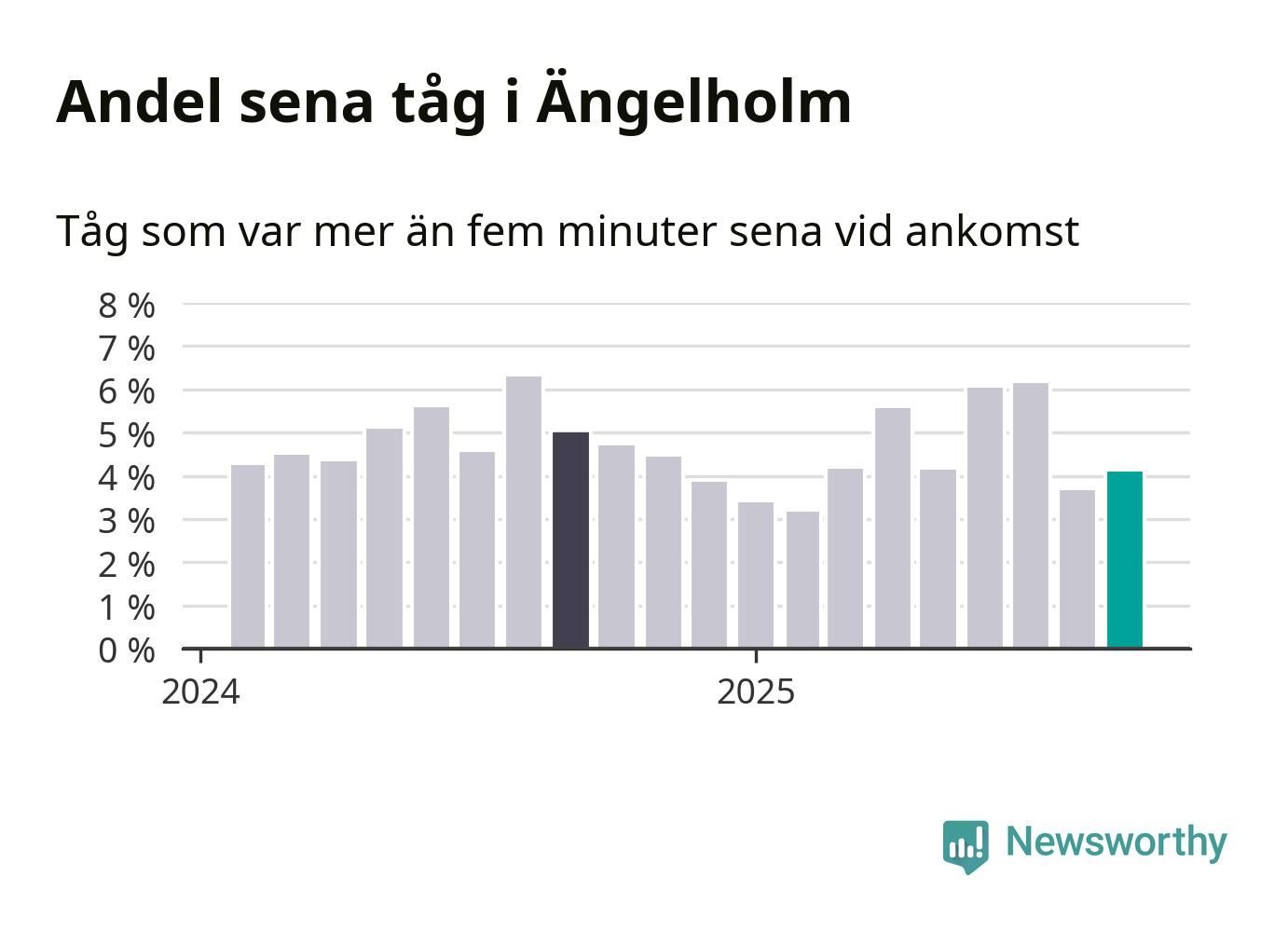 Nittiosex av etthundra tåg i Ängelholm var pendeltåg, och bland dem var fyra procent mer än fem minuter sena.