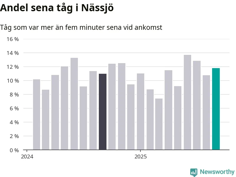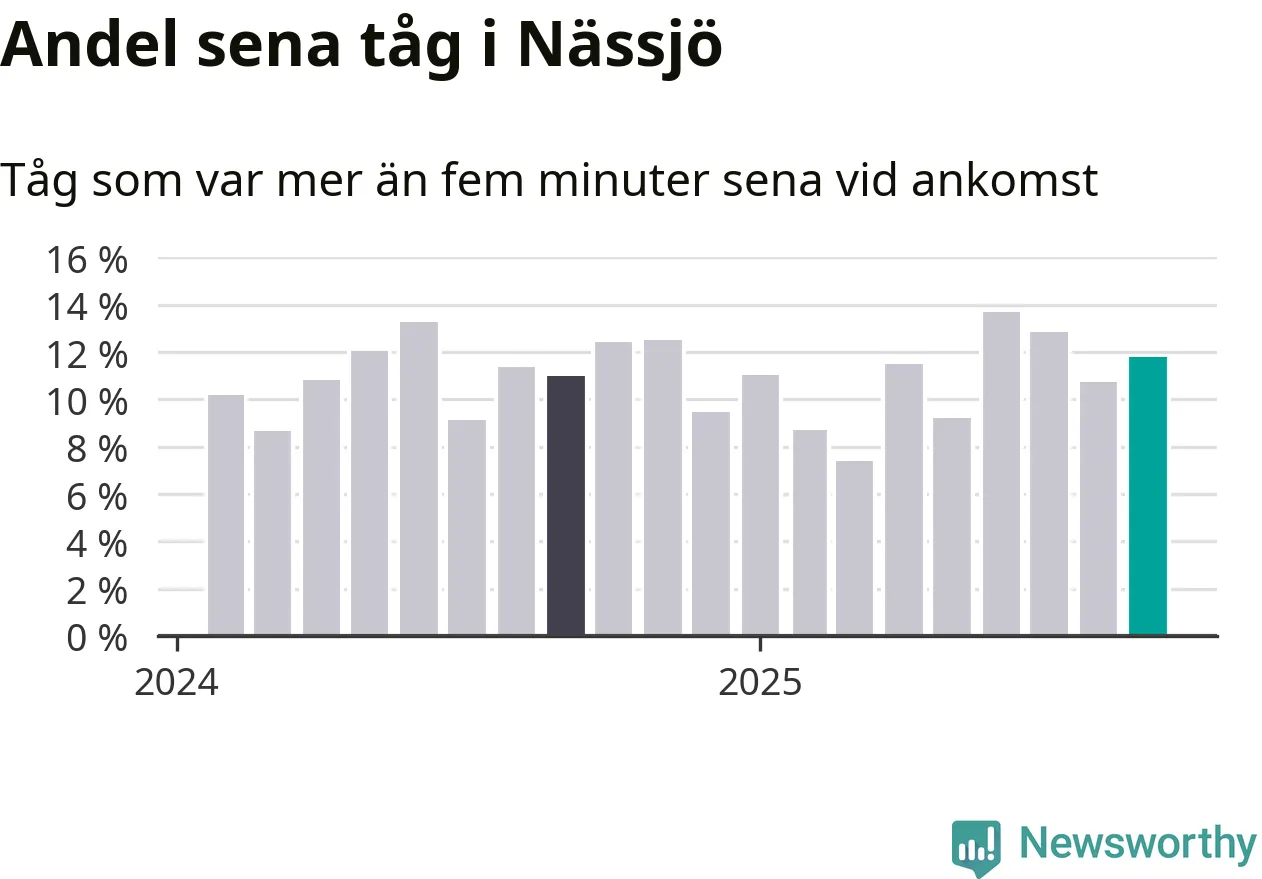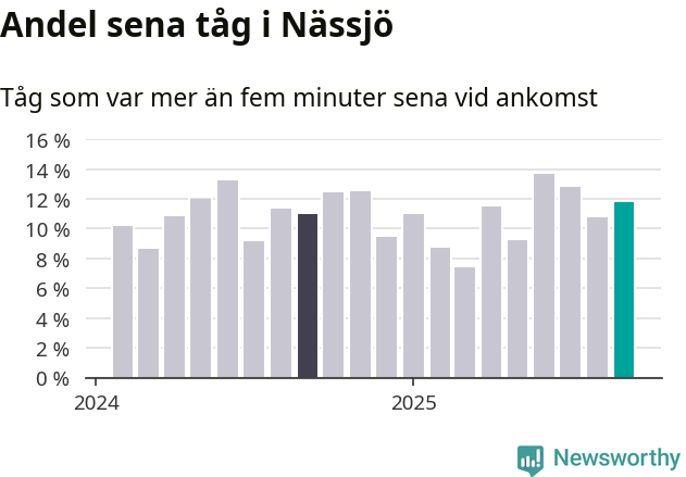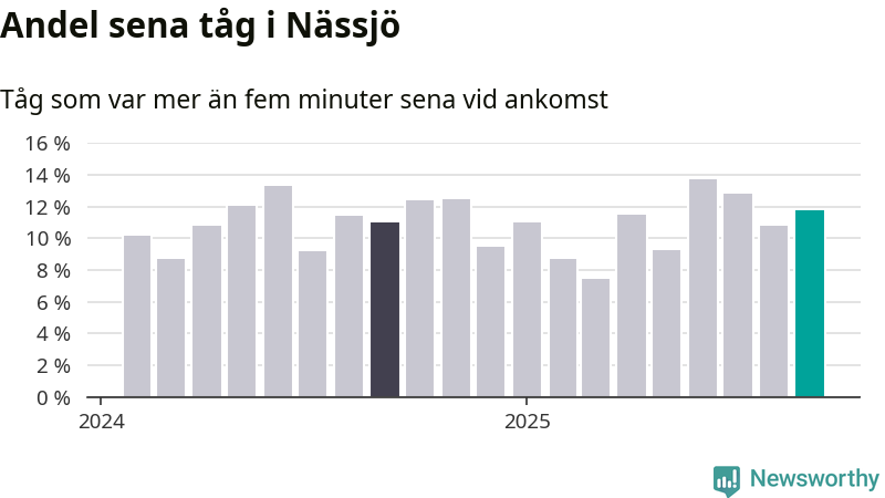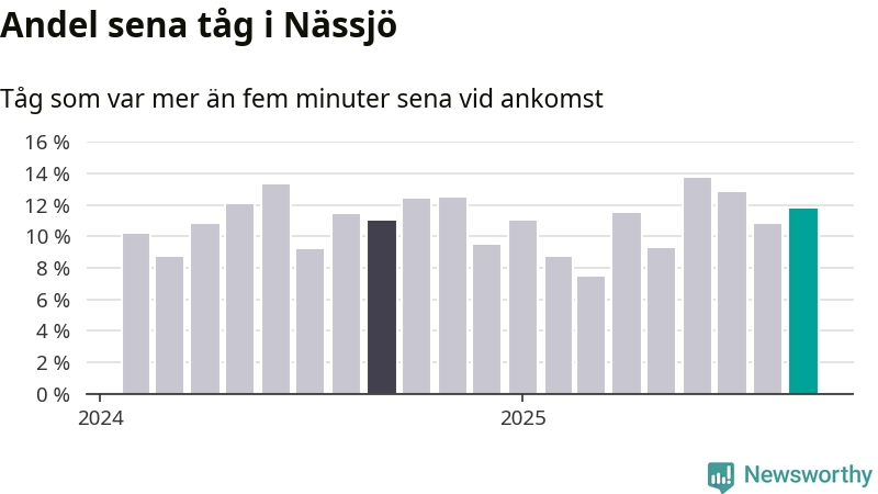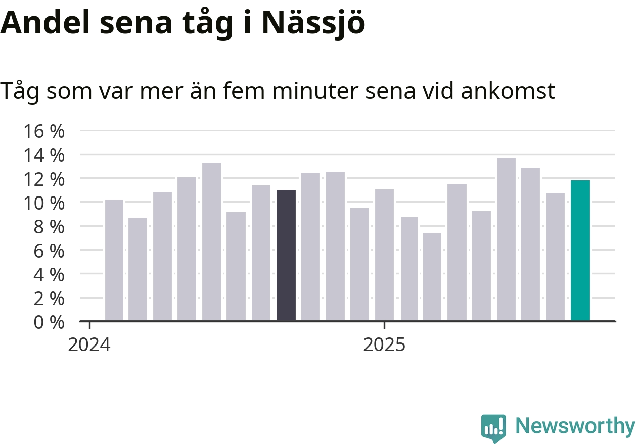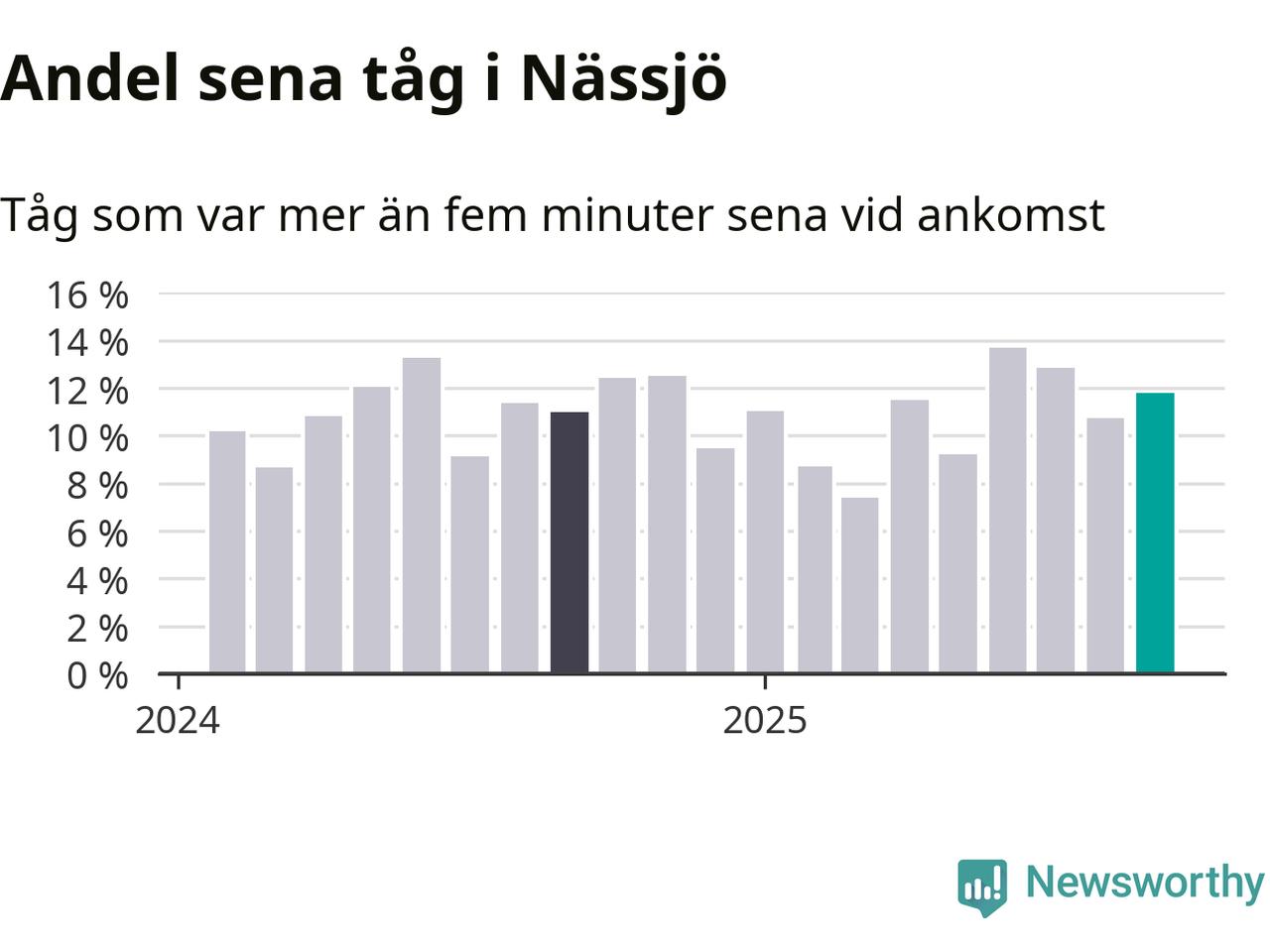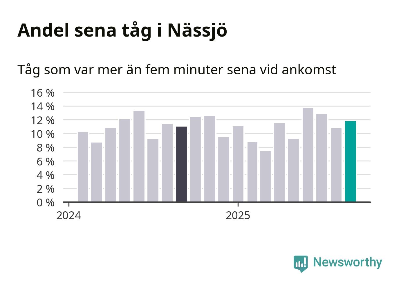 Tolv procent kan jämföras med elva procent månaden innan, och elva procent i september 2024. Siffrorna bygger på realtidsinformation om tågavgångar och ankomster från Trafikverket, som Newsworthy löpande samlar in.