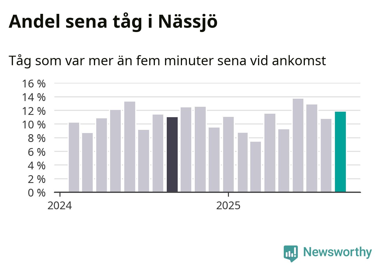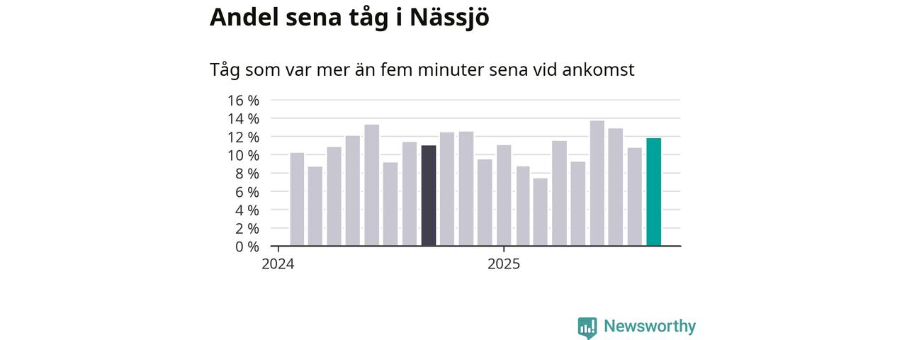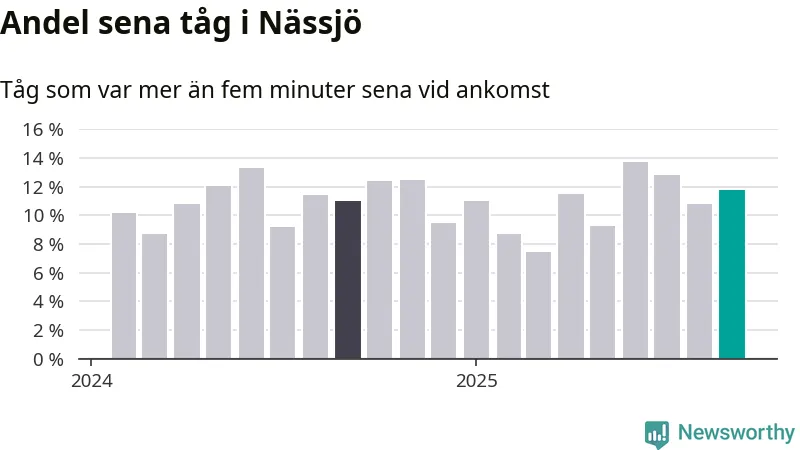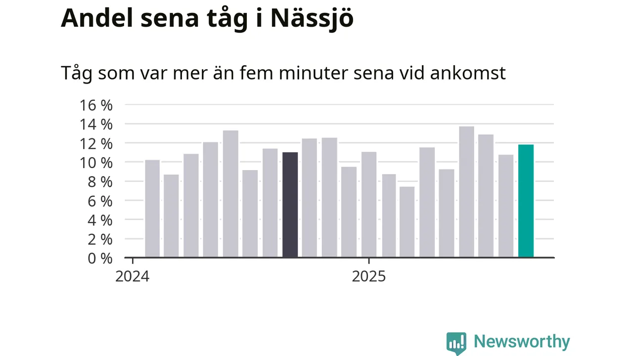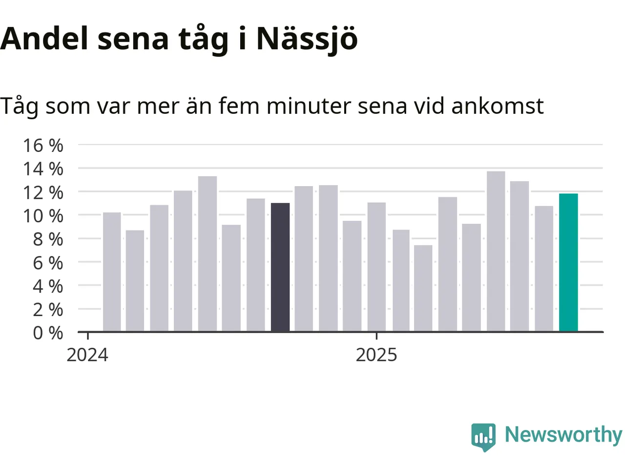 Av omkring 4 000 tåg som passerade någon av stationerna i Nässjö kommun i september var 475 mer än fem minuter sena. Det motsvarar 12 procent, en bit över den nationella målsättningen som säger att inte mer än fem procent av tågen ska vara sena.