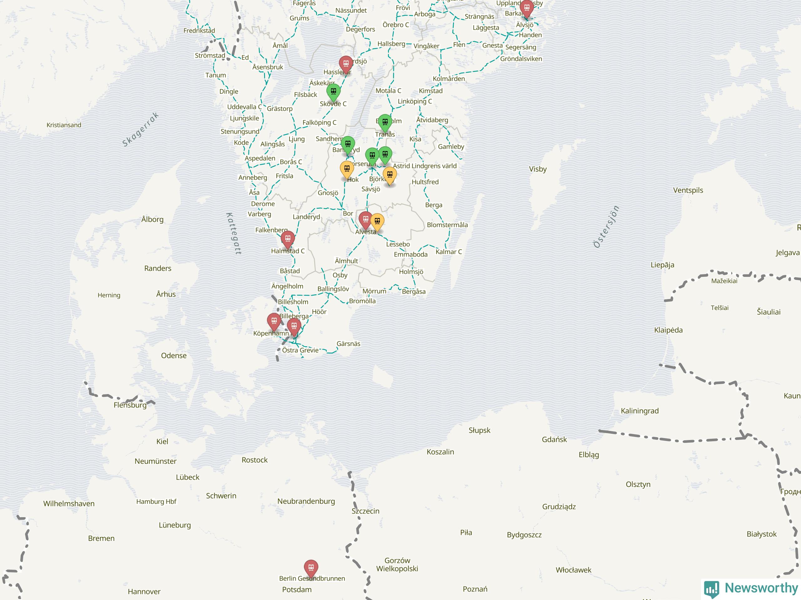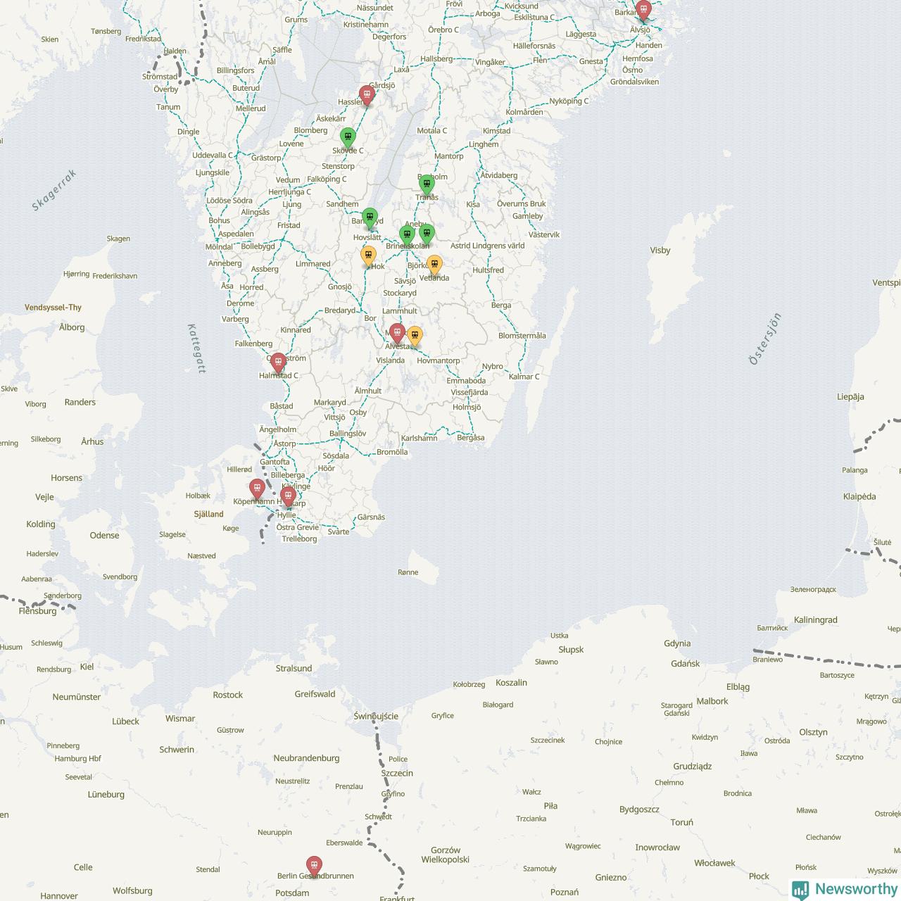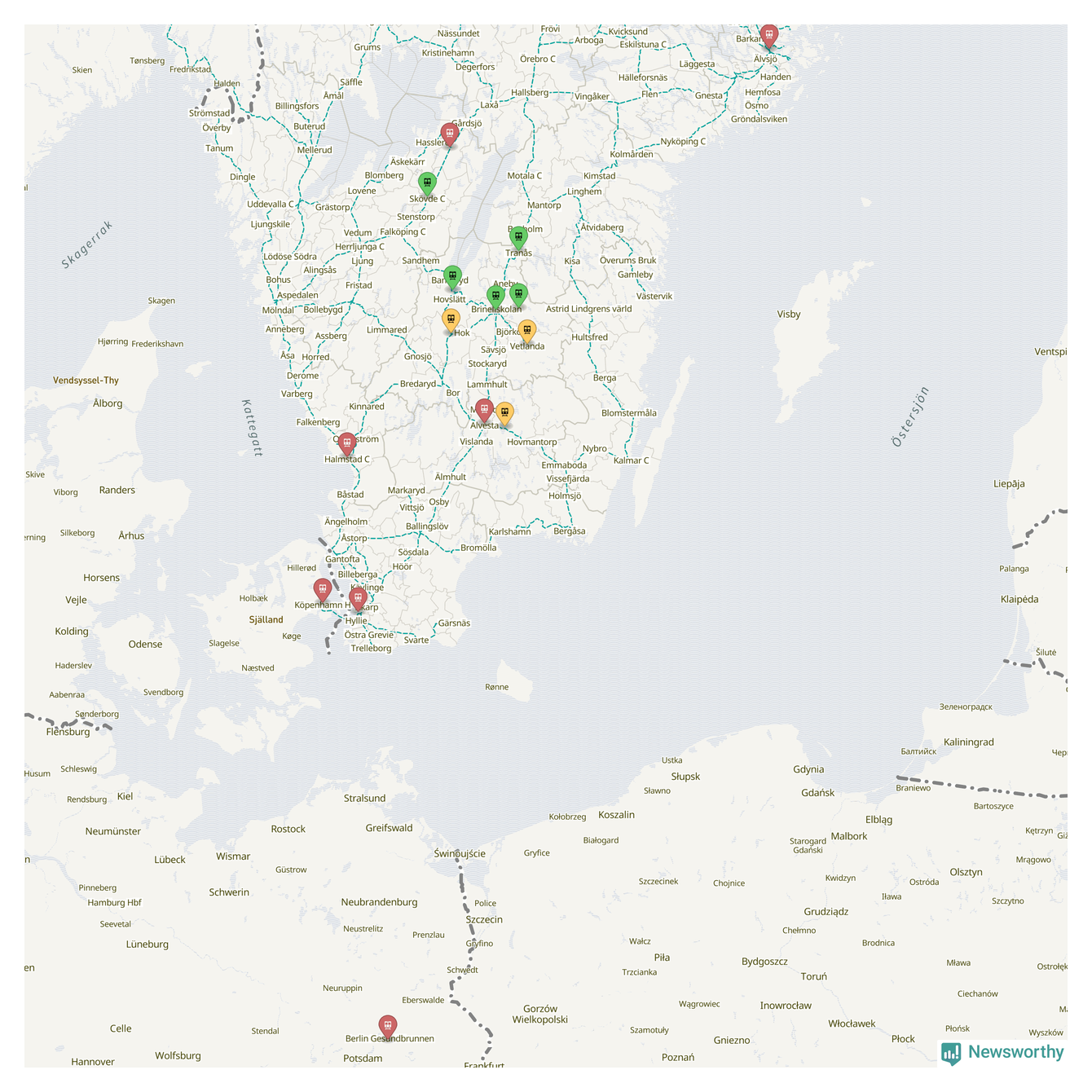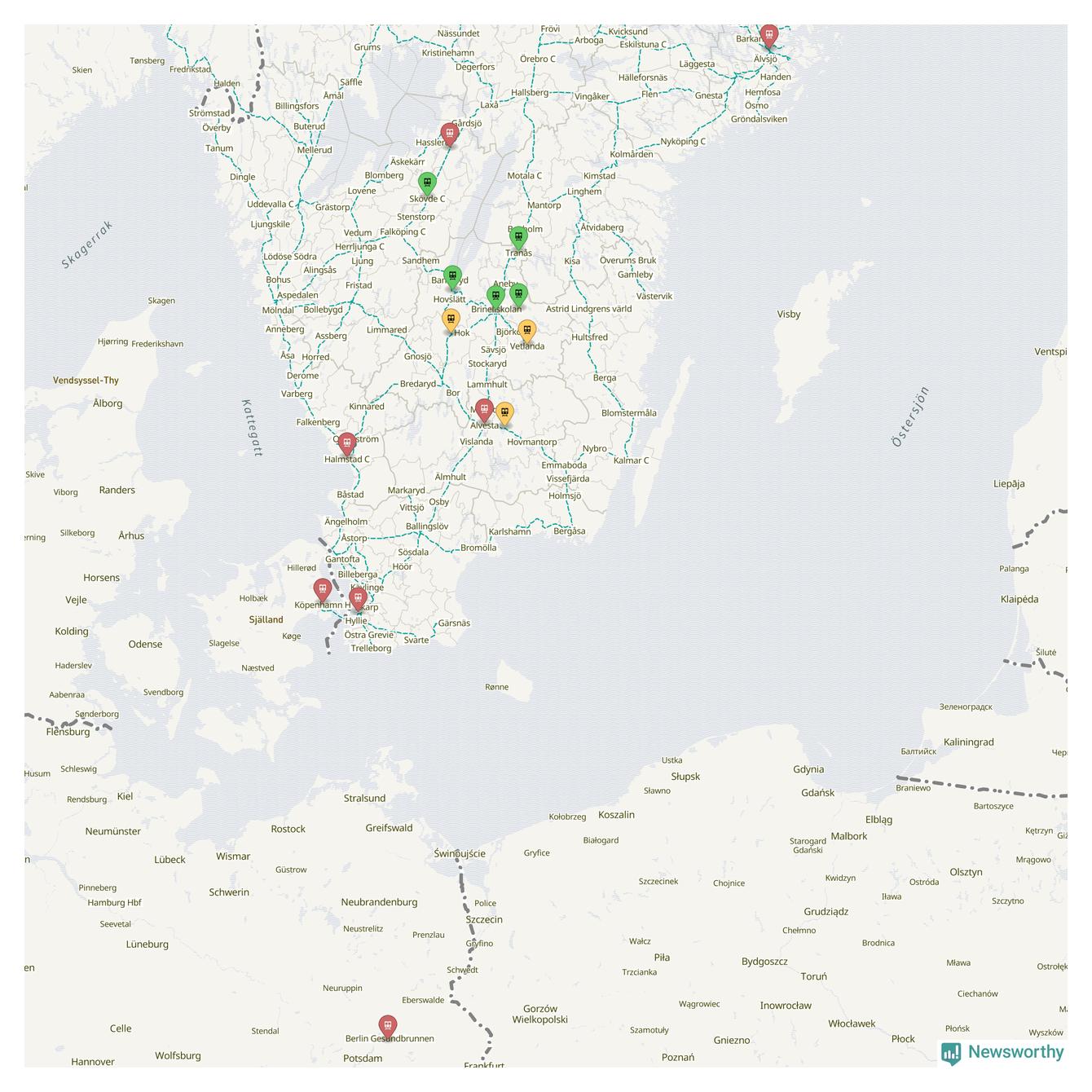 Kartdata från Mapbox, Newsworthy, OpenStreetMap och Trafikverket. Uppgifter om sträckor med passagerartrafik från jarnvag.net.