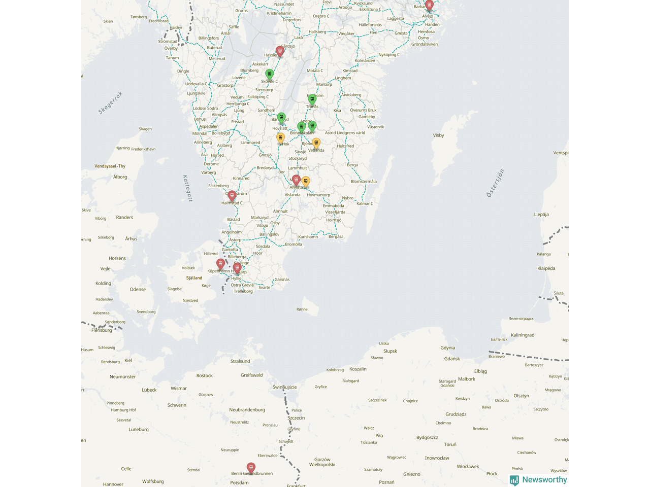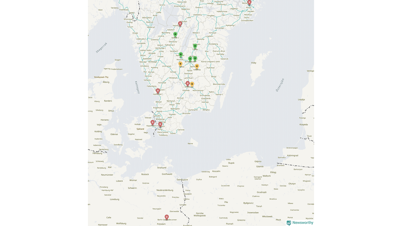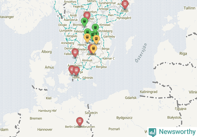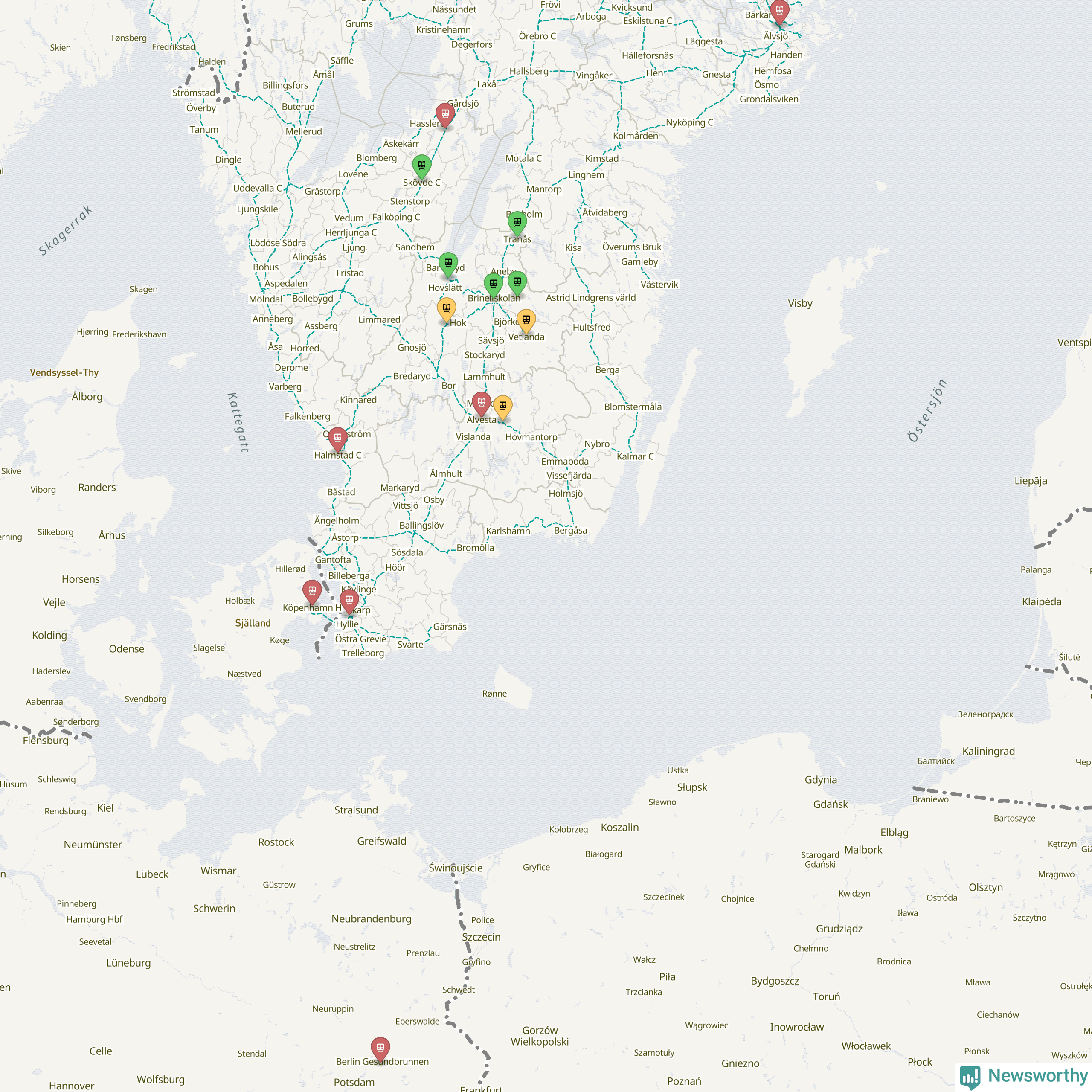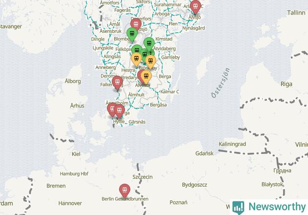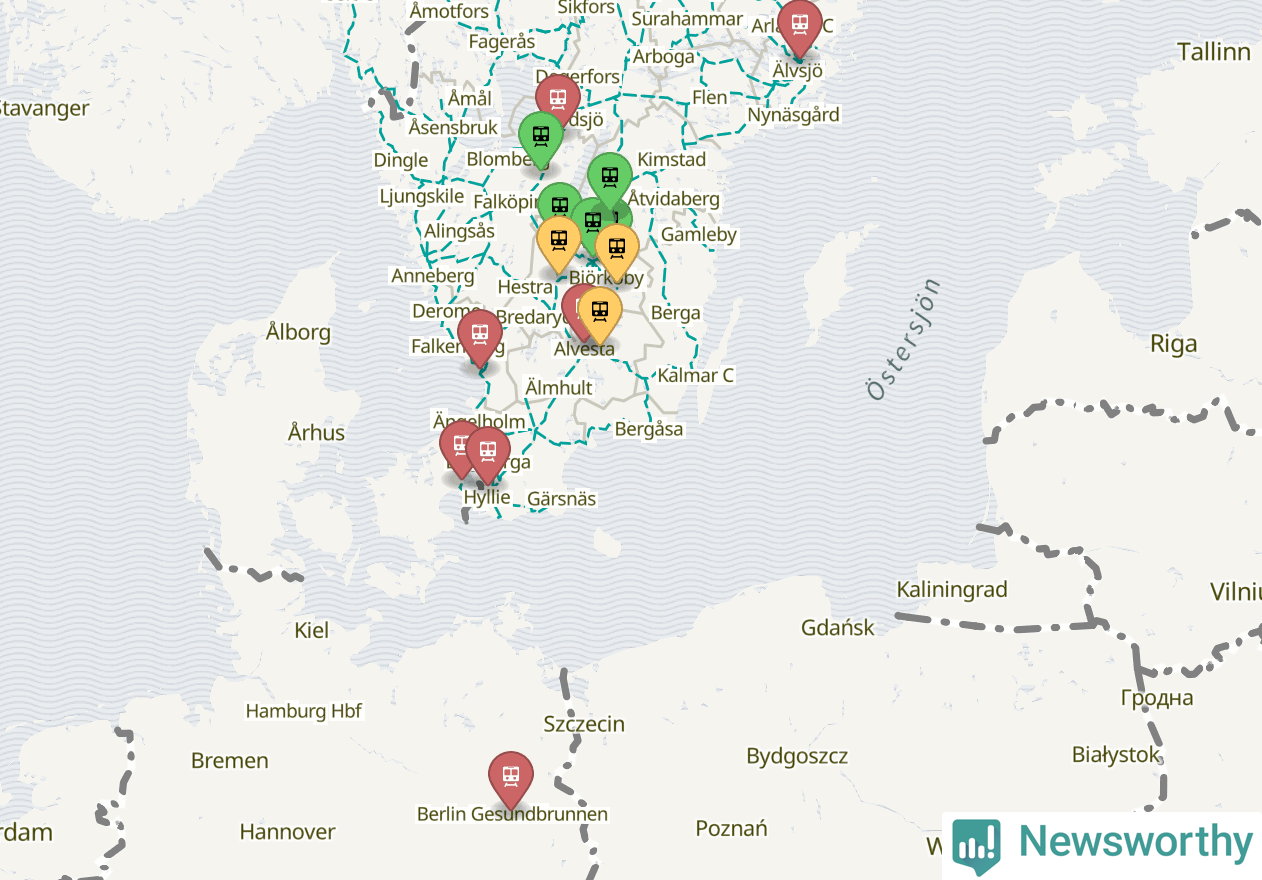 Kartdata från Mapbox, Newsworthy, OpenStreetMap och Trafikverket. Uppgifter om sträckor med passagerartrafik från jarnvag.net.