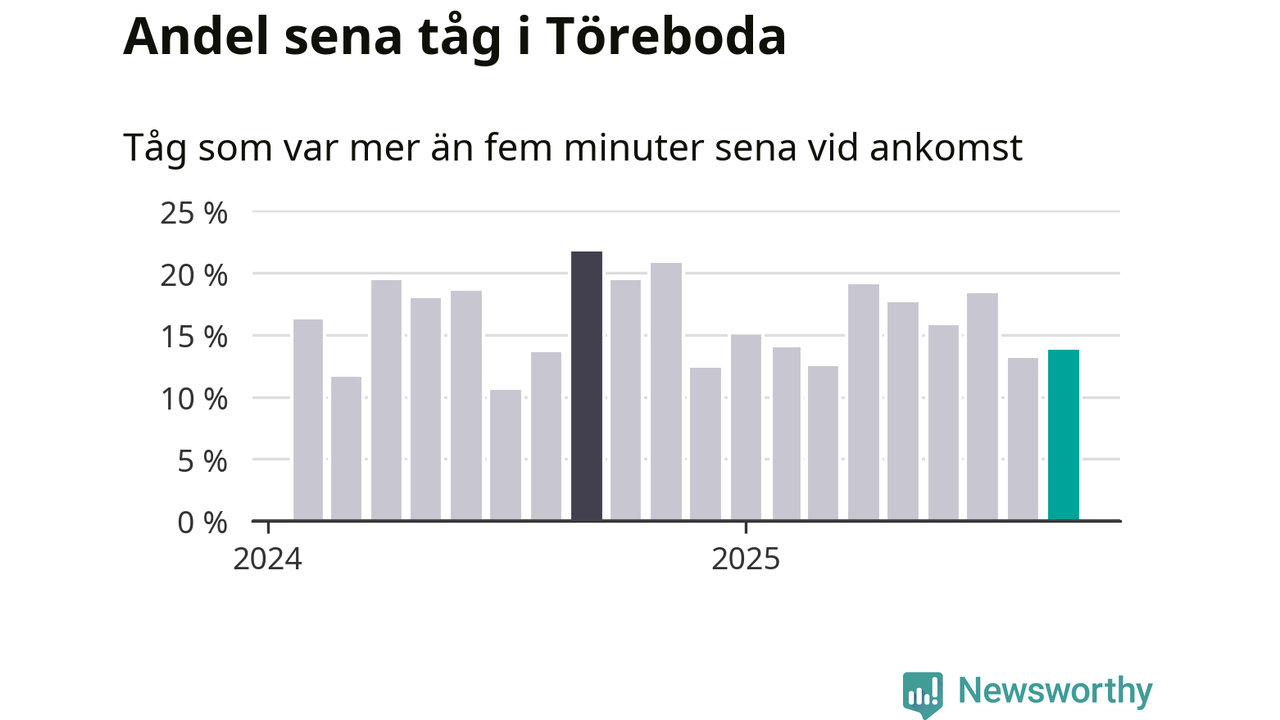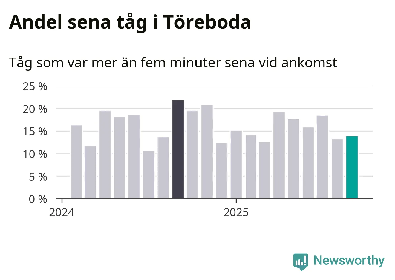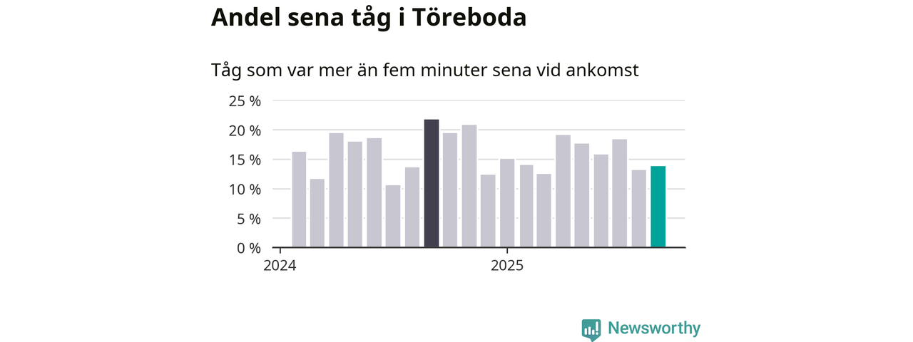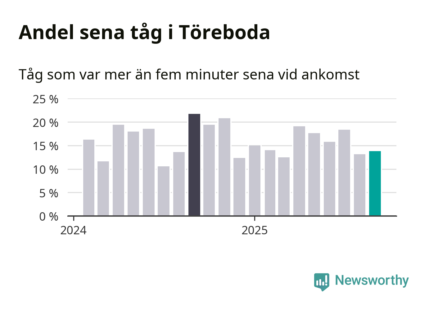 14 procent kan jämföras med 13 procent månaden innan, och 22 procent i september 2024. Siffrorna bygger på realtidsinformation om tågavgångar och ankomster från Trafikverket, som Newsworthy löpande samlar in.
