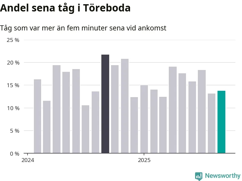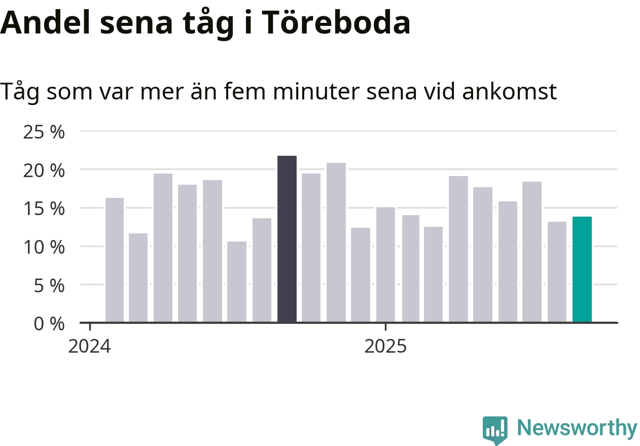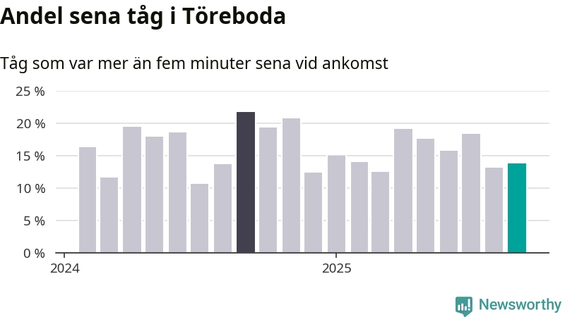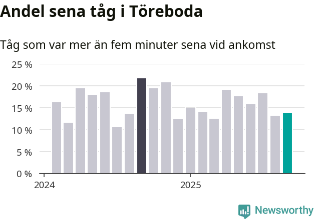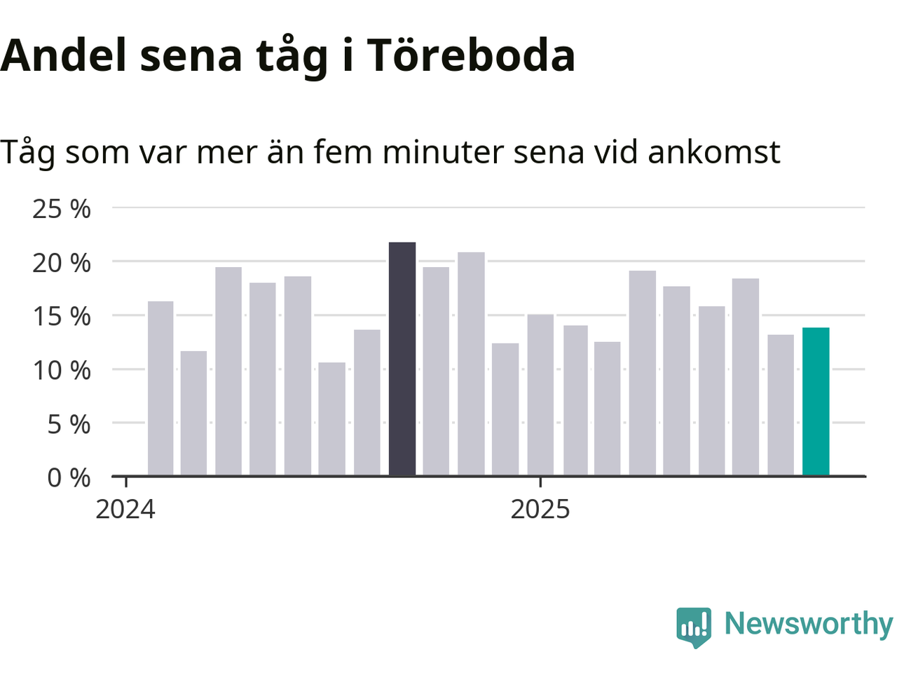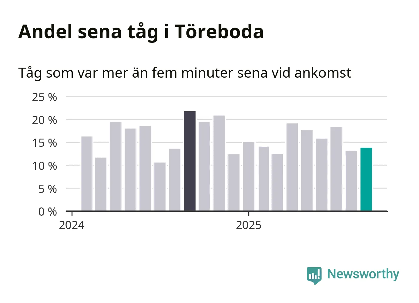 14 procent kan jämföras med 13 procent månaden innan, och 22 procent i september 2024. Siffrorna bygger på realtidsinformation om tågavgångar och ankomster från Trafikverket, som Newsworthy löpande samlar in.