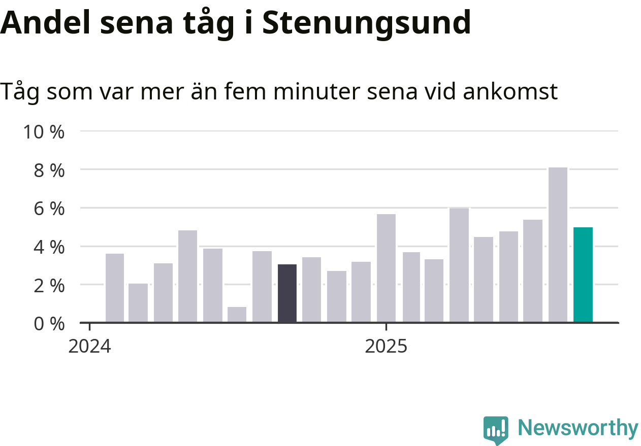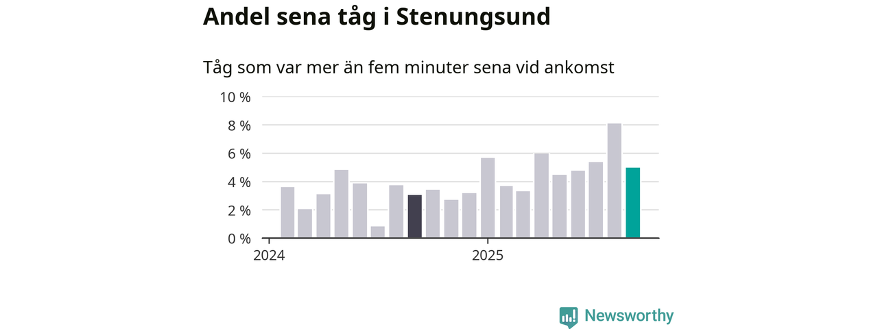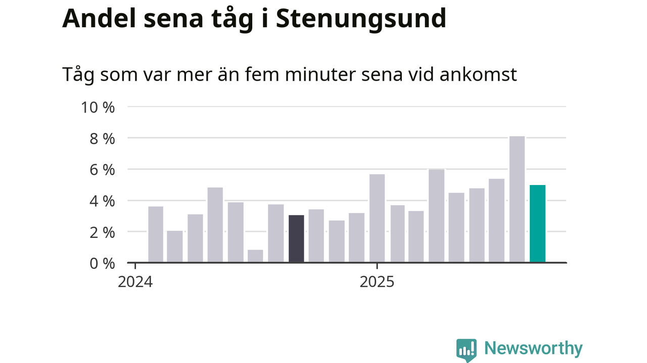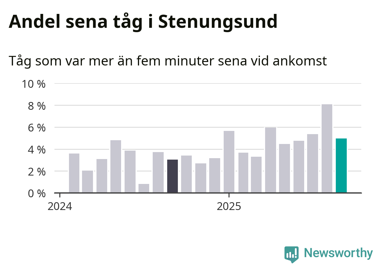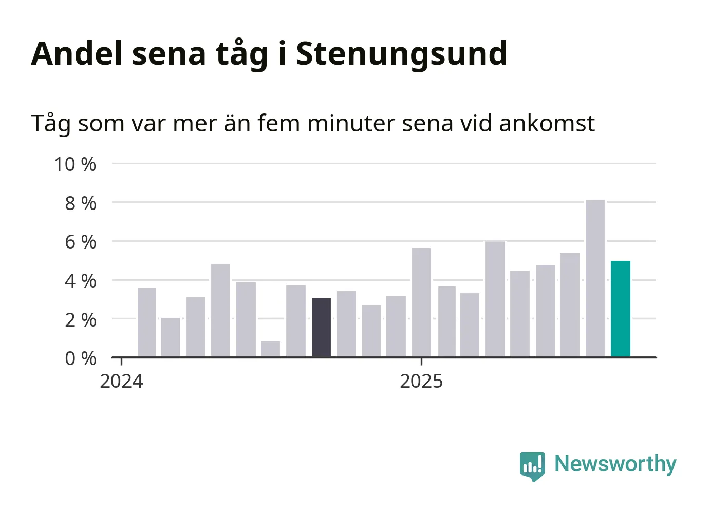Fem procent kan jämföras med åtta procent månaden innan, och tre procent i september 2024. Siffrorna bygger på realtidsinformation om tågavgångar och ankomster från Trafikverket, som Newsworthy löpande samlar in.