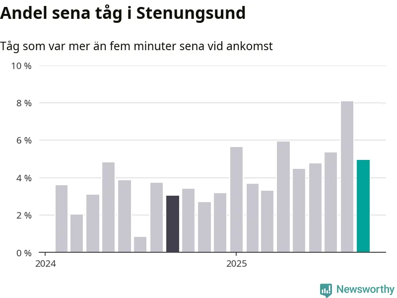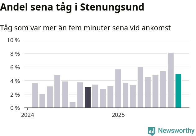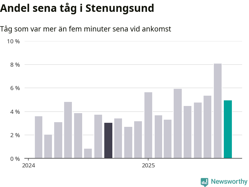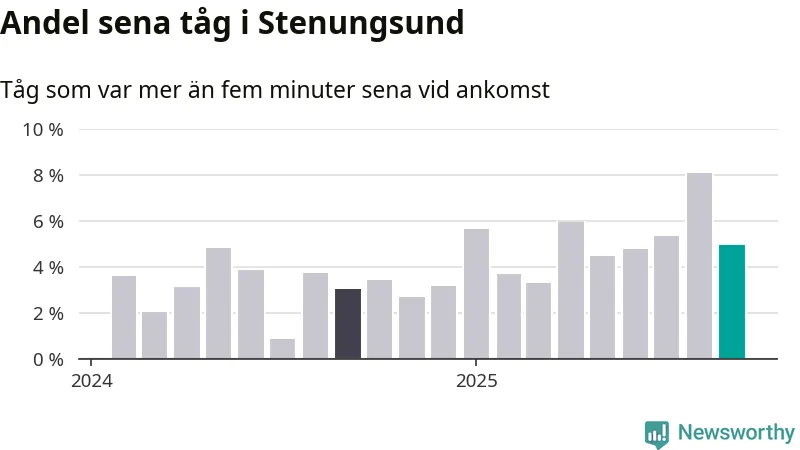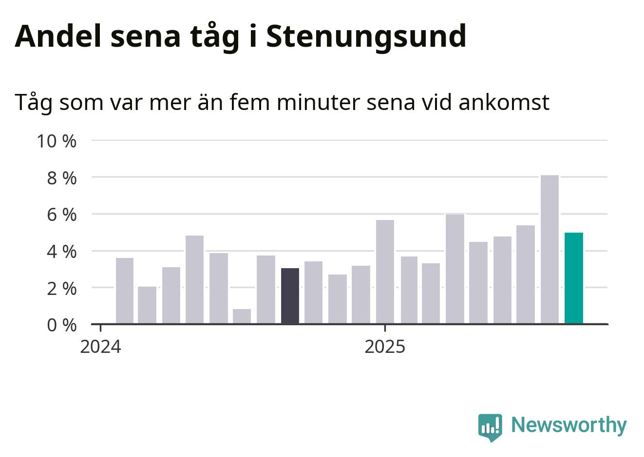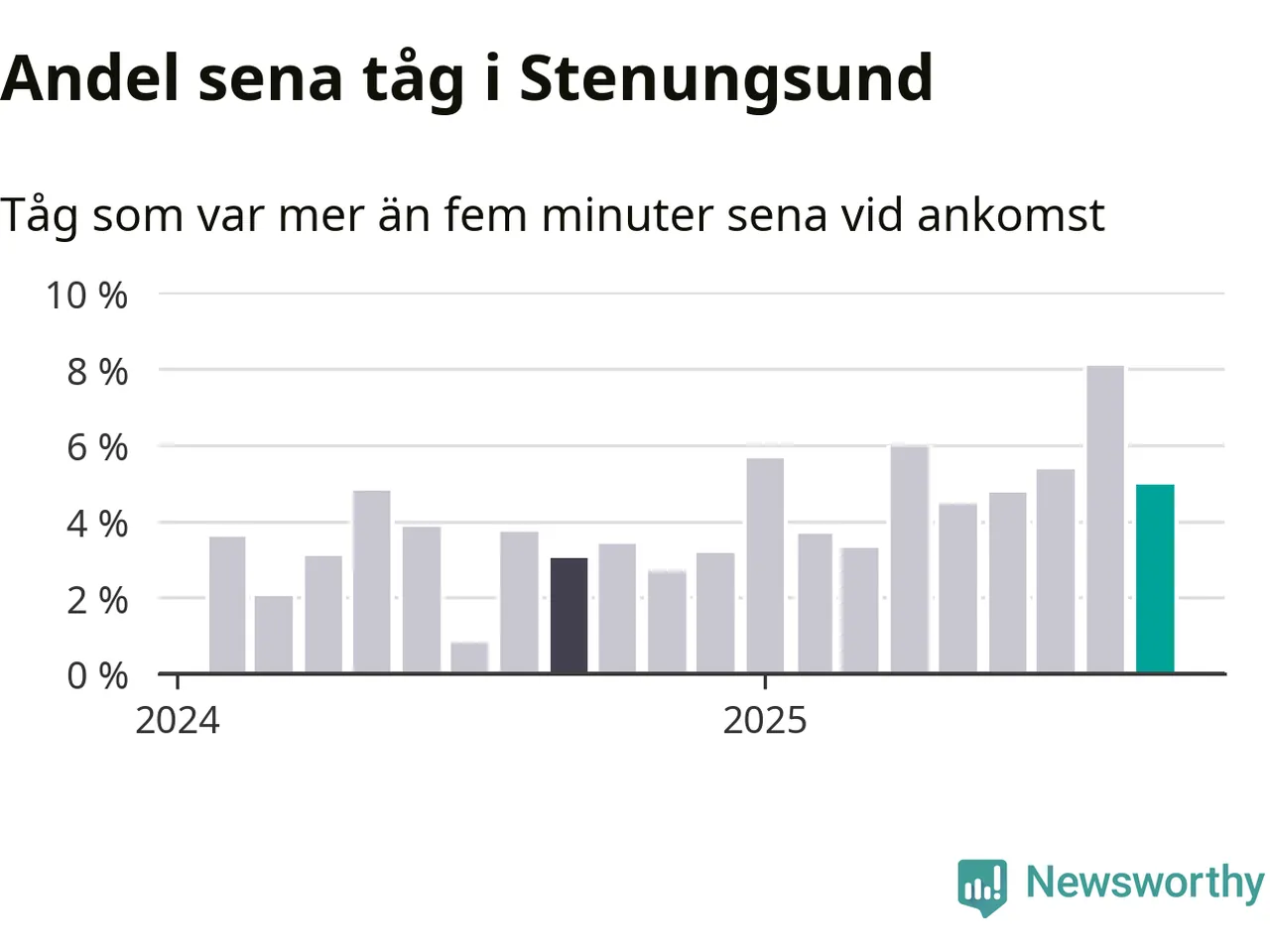 Fem procent kan jämföras med åtta procent månaden innan, och tre procent i september 2024. Siffrorna bygger på realtidsinformation om tågavgångar och ankomster från Trafikverket, som Newsworthy löpande samlar in.