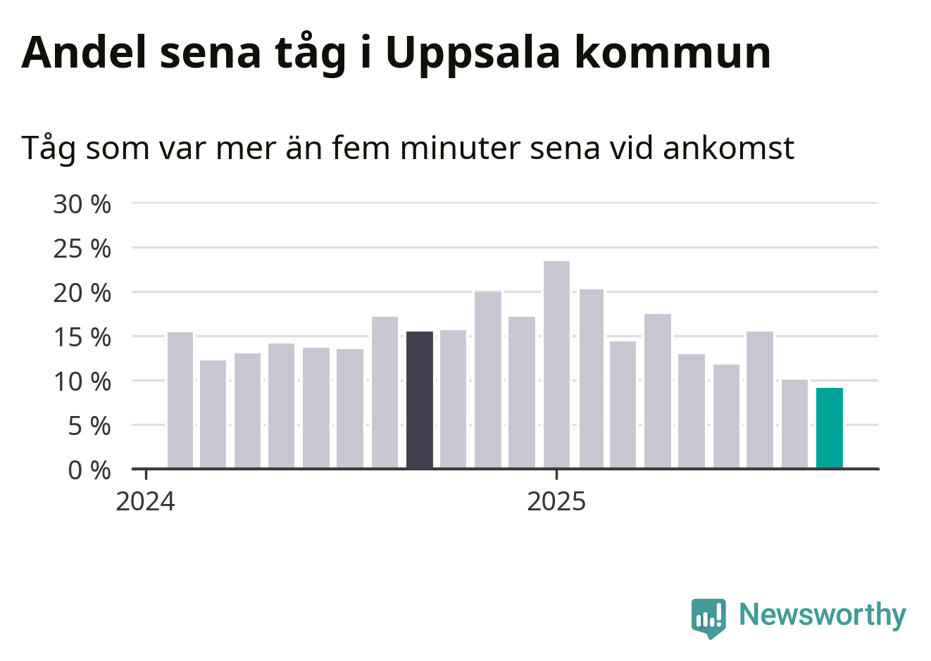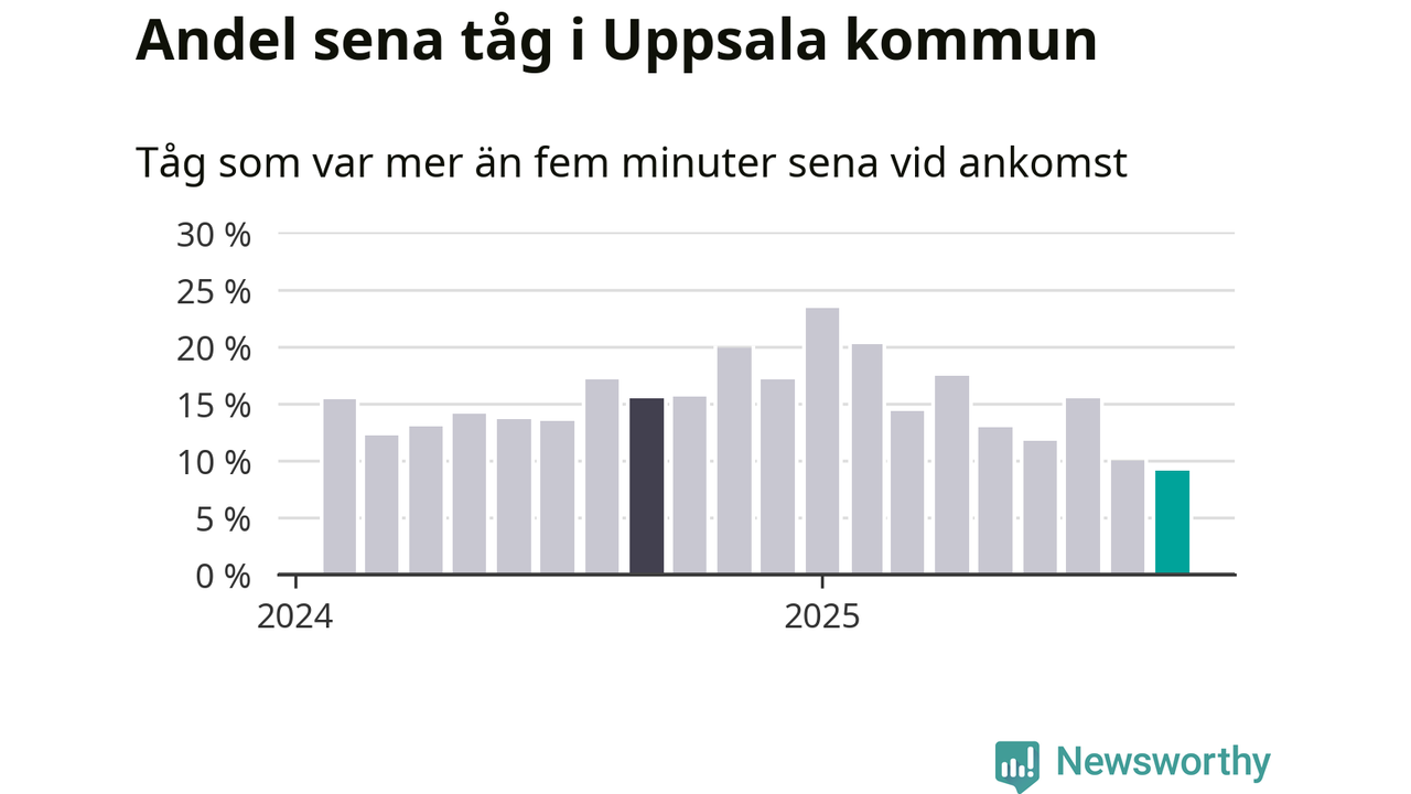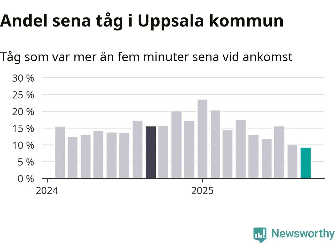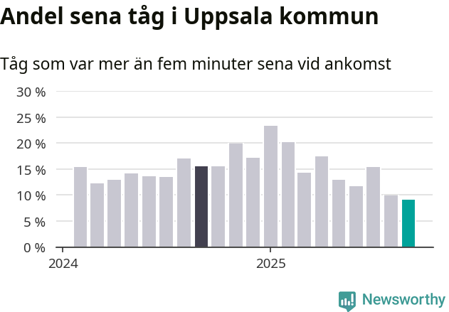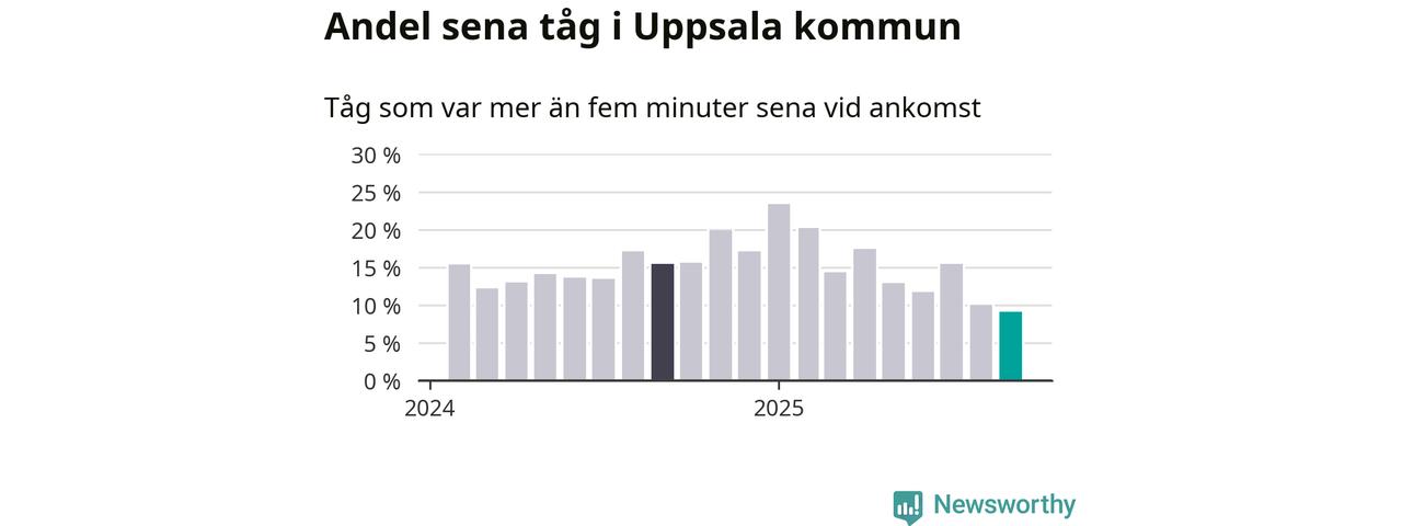 Nio procent är den lägsta andelen sena tåg sedan Newsworthy började mäta lokala förseningar i början av 2024. Siffrorna bygger på realtidsinformation om tågavgångar och ankomster från Trafikverket, som Newsworthy löpande samlar in.