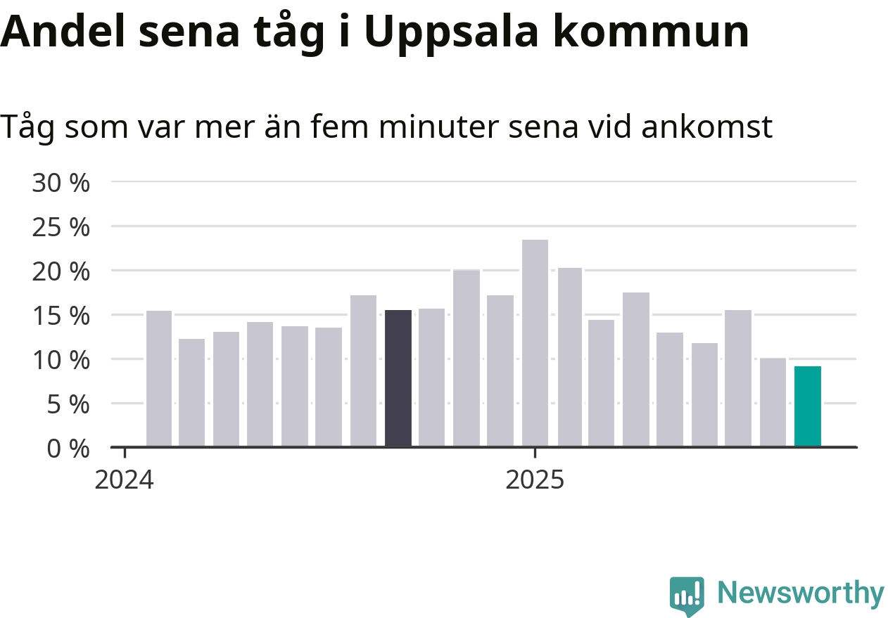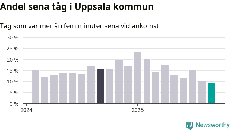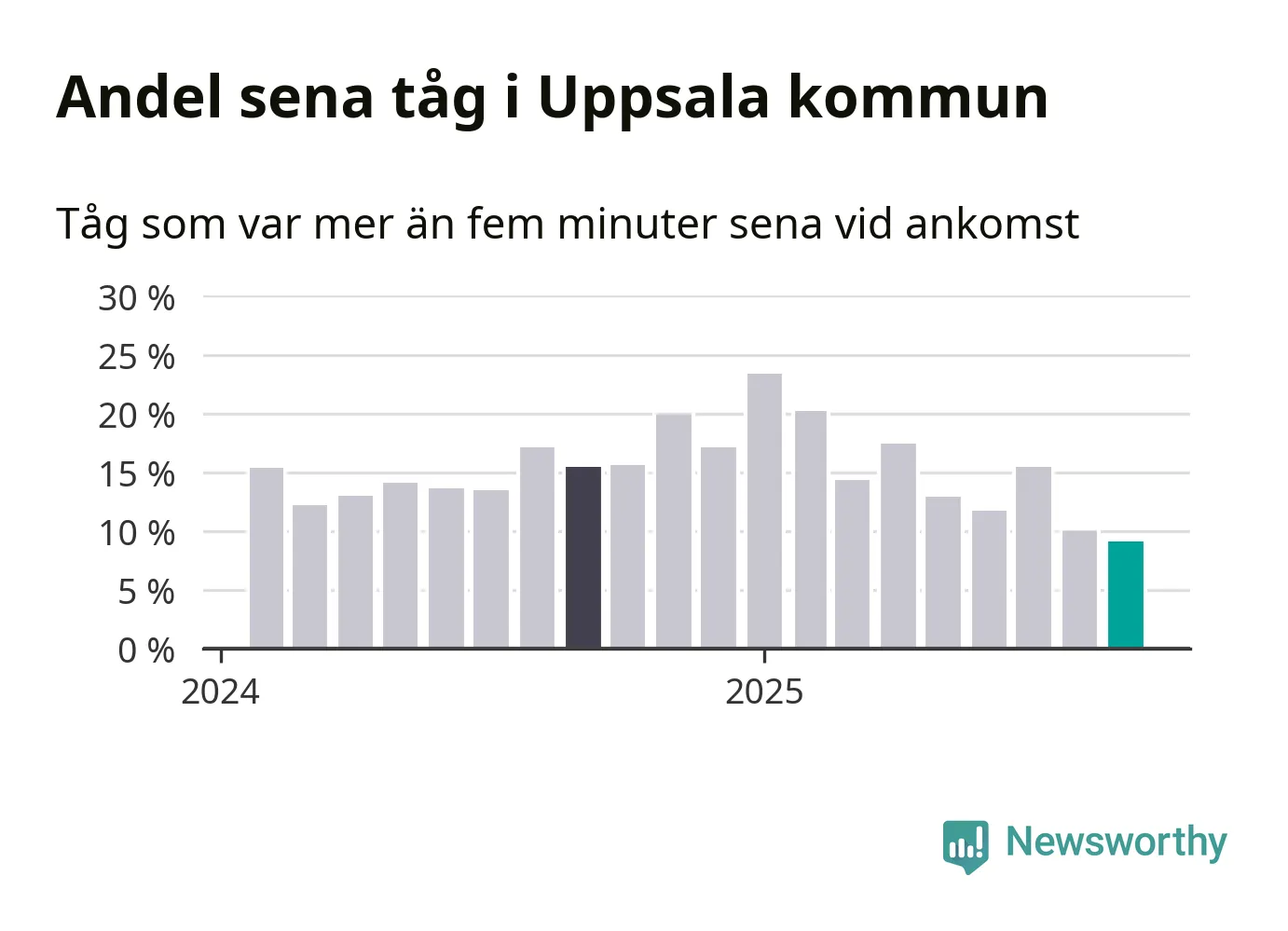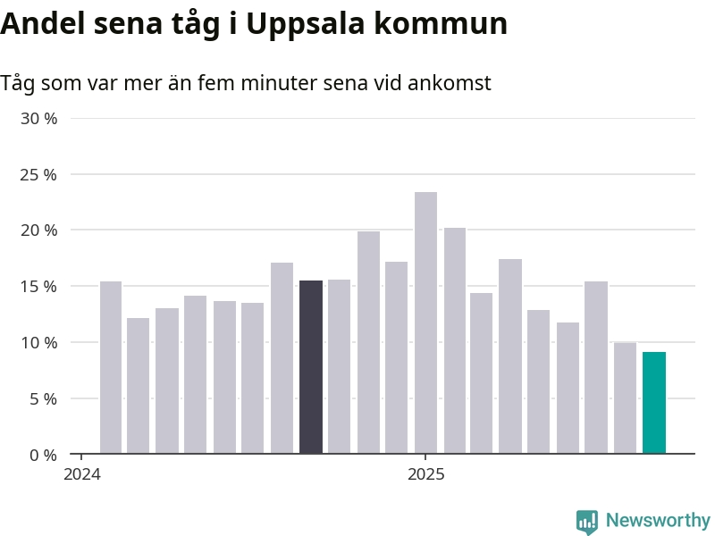 Nio procent är den lägsta andelen sena tåg sedan Newsworthy började mäta lokala förseningar i början av 2024. Siffrorna bygger på realtidsinformation om tågavgångar och ankomster från Trafikverket, som Newsworthy löpande samlar in.