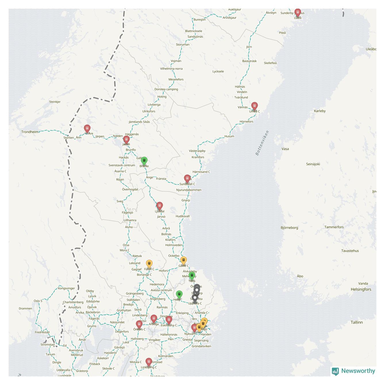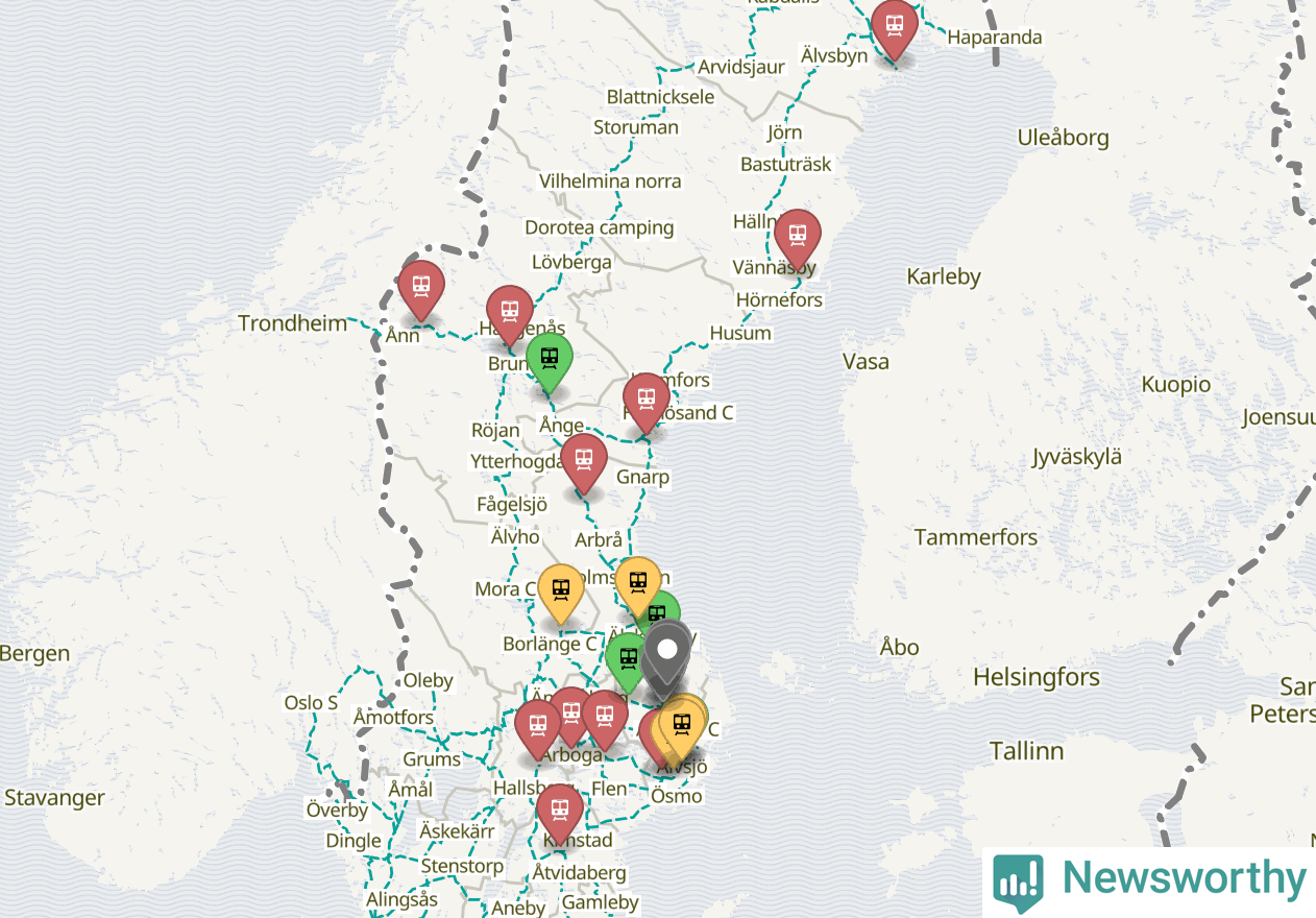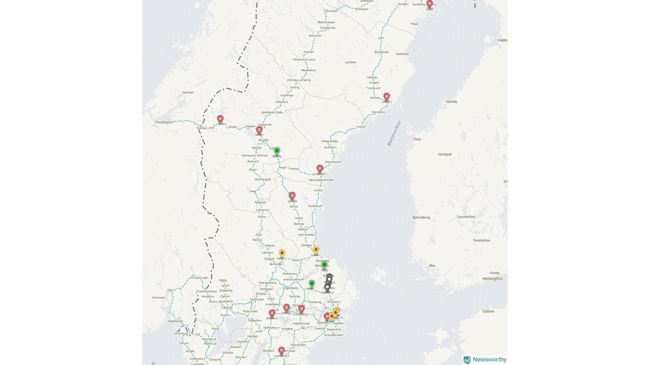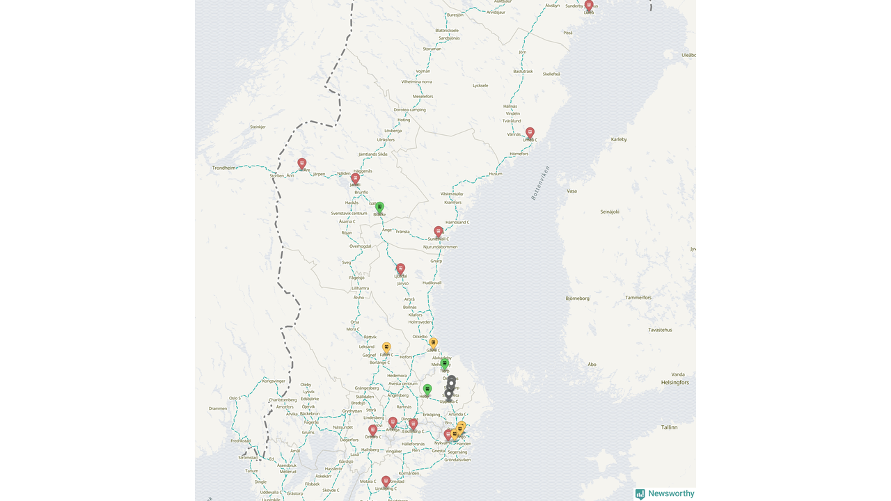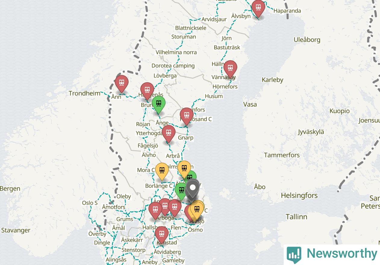 Kartdata från Mapbox, Newsworthy, OpenStreetMap och Trafikverket. Uppgifter om sträckor med passagerartrafik från jarnvag.net.