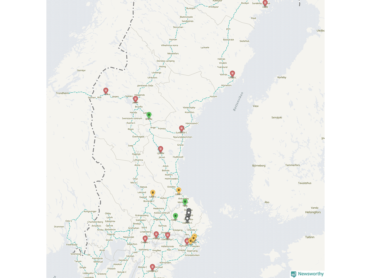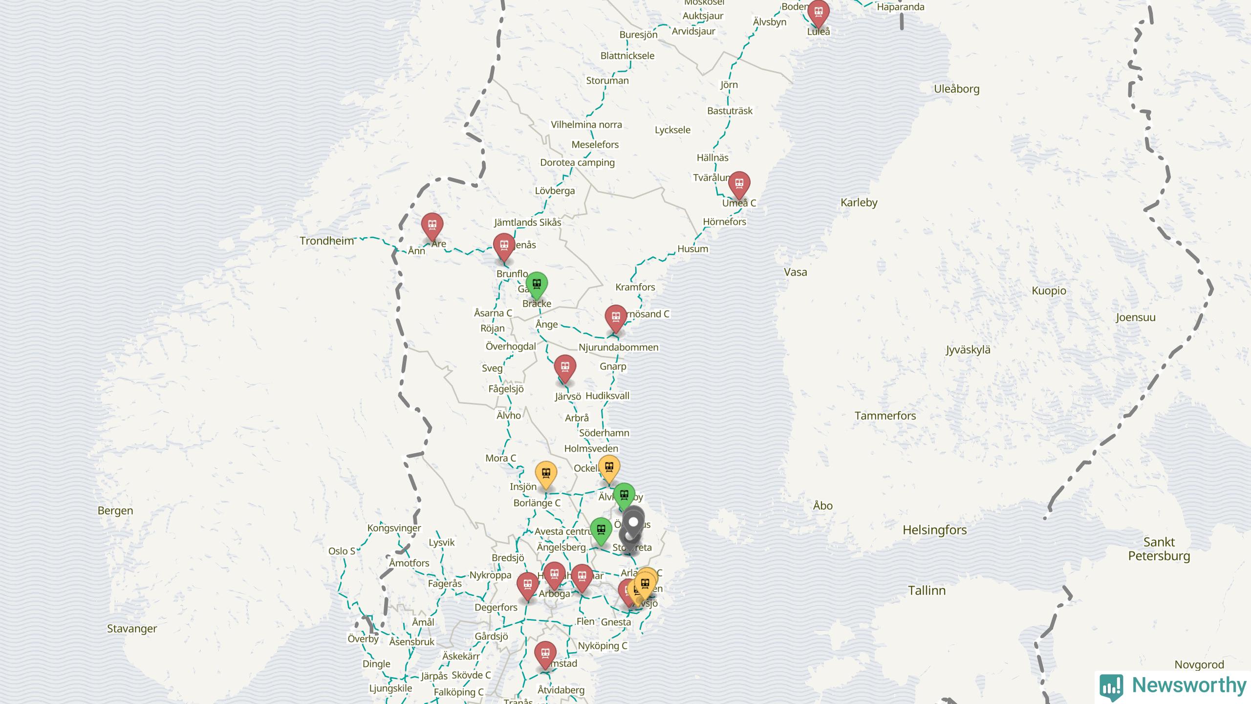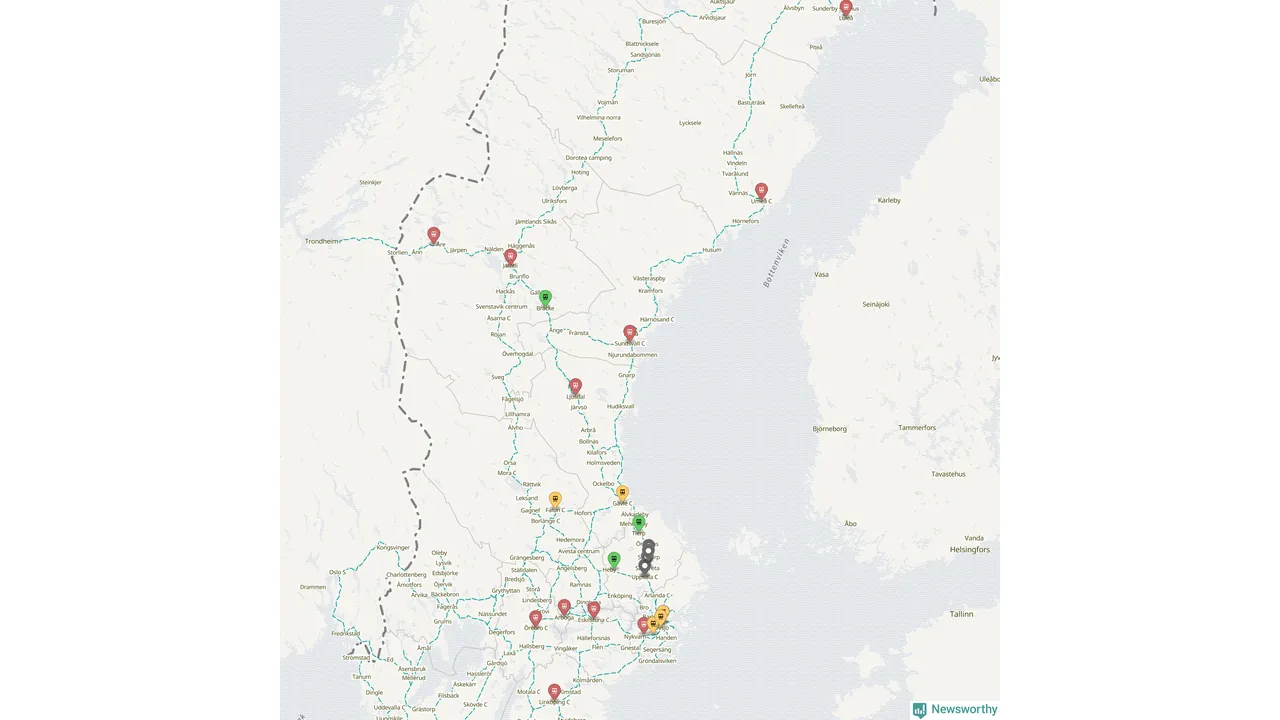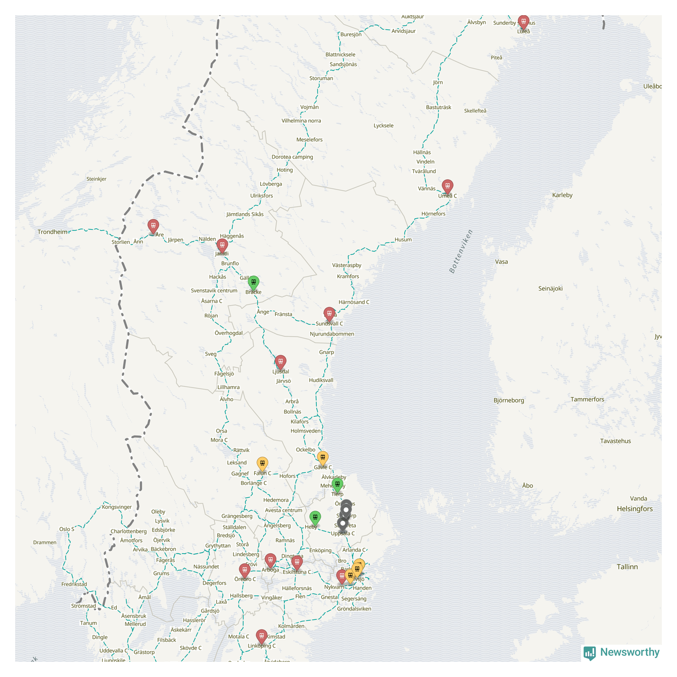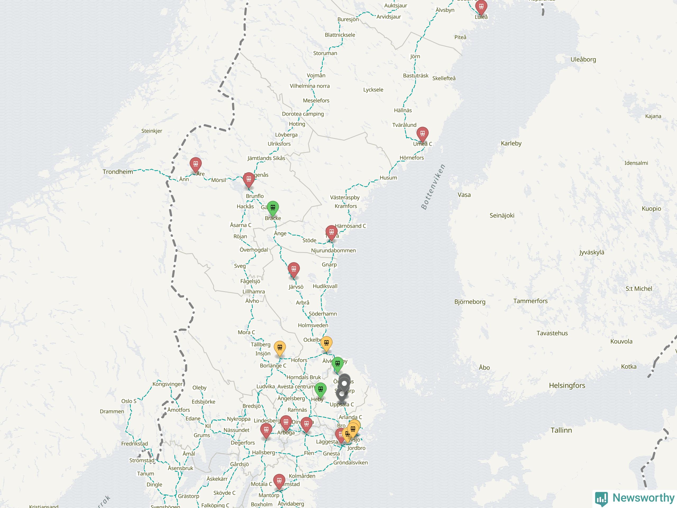 Kartdata från Mapbox, Newsworthy, OpenStreetMap och Trafikverket. Uppgifter om sträckor med passagerartrafik från jarnvag.net.