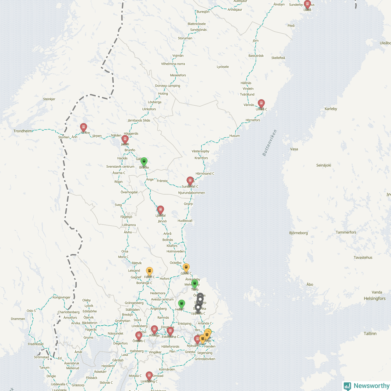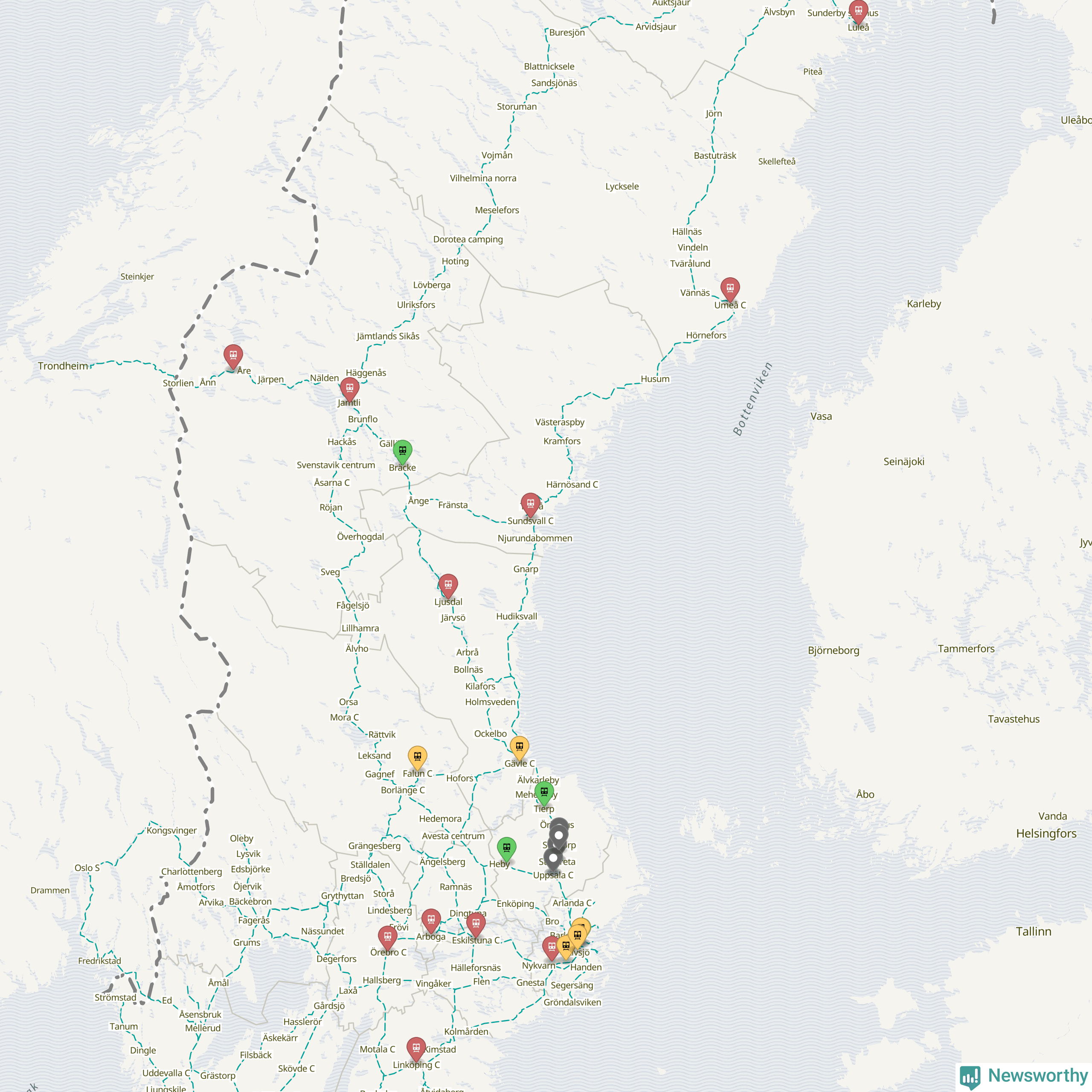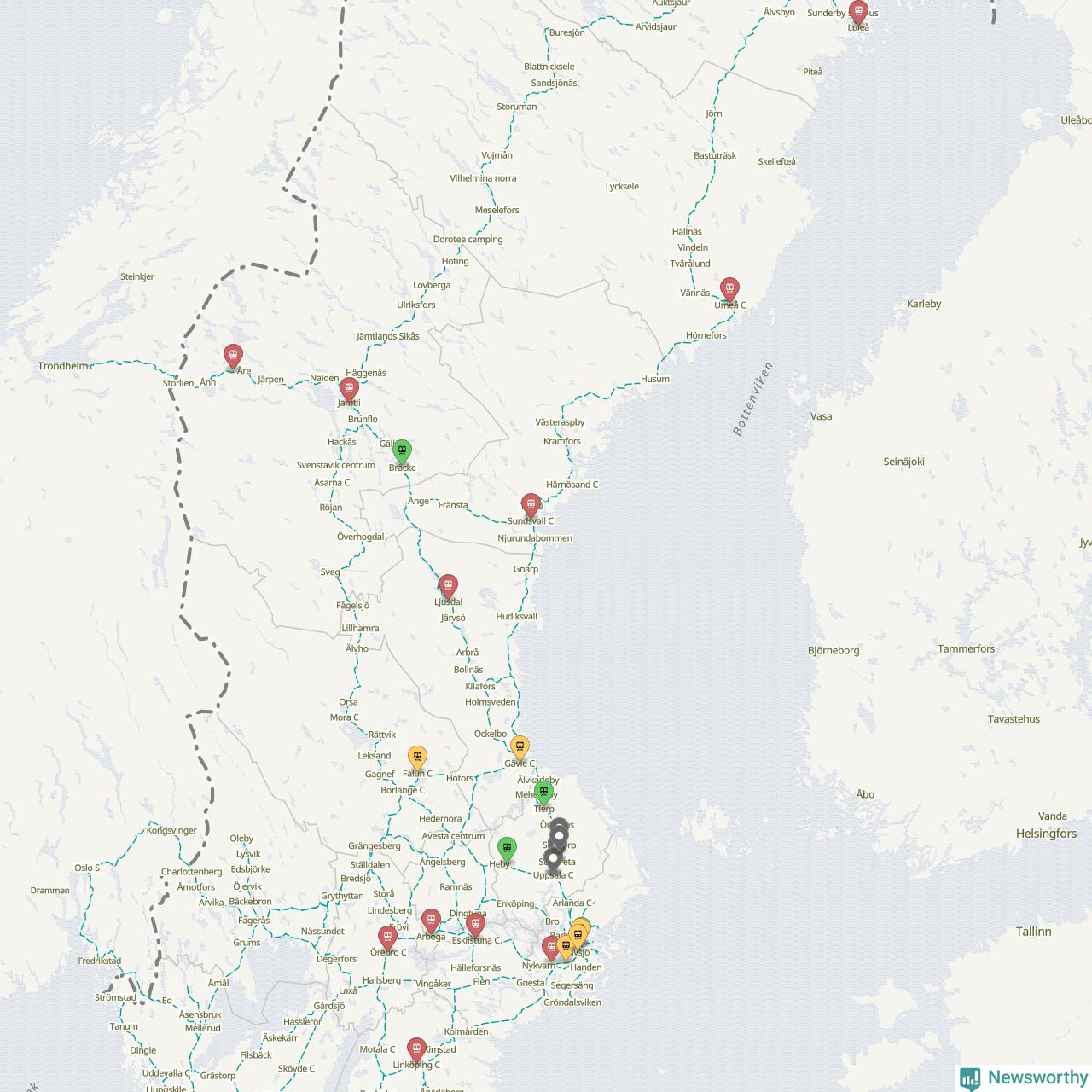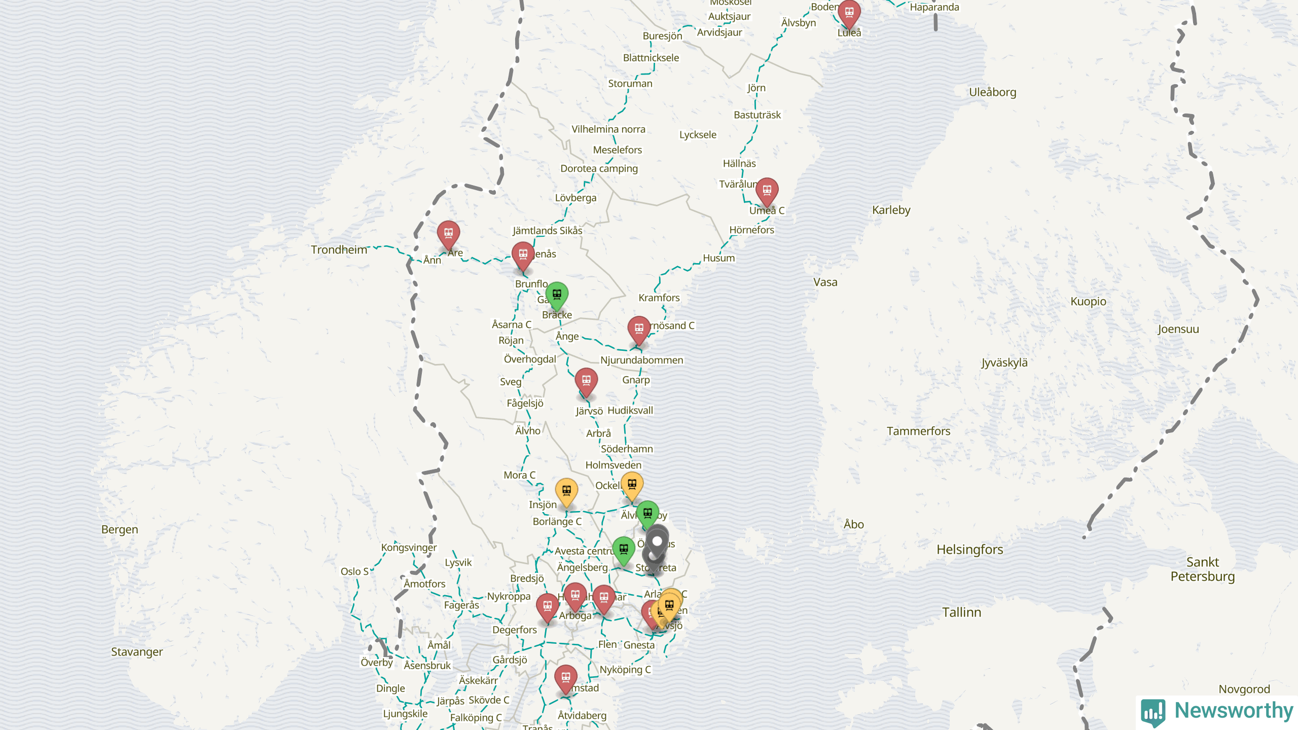 Kartdata från Mapbox, Newsworthy, OpenStreetMap och Trafikverket. Uppgifter om sträckor med passagerartrafik från jarnvag.net.