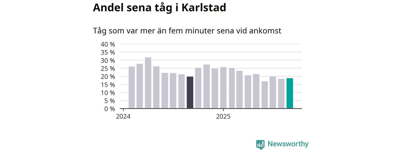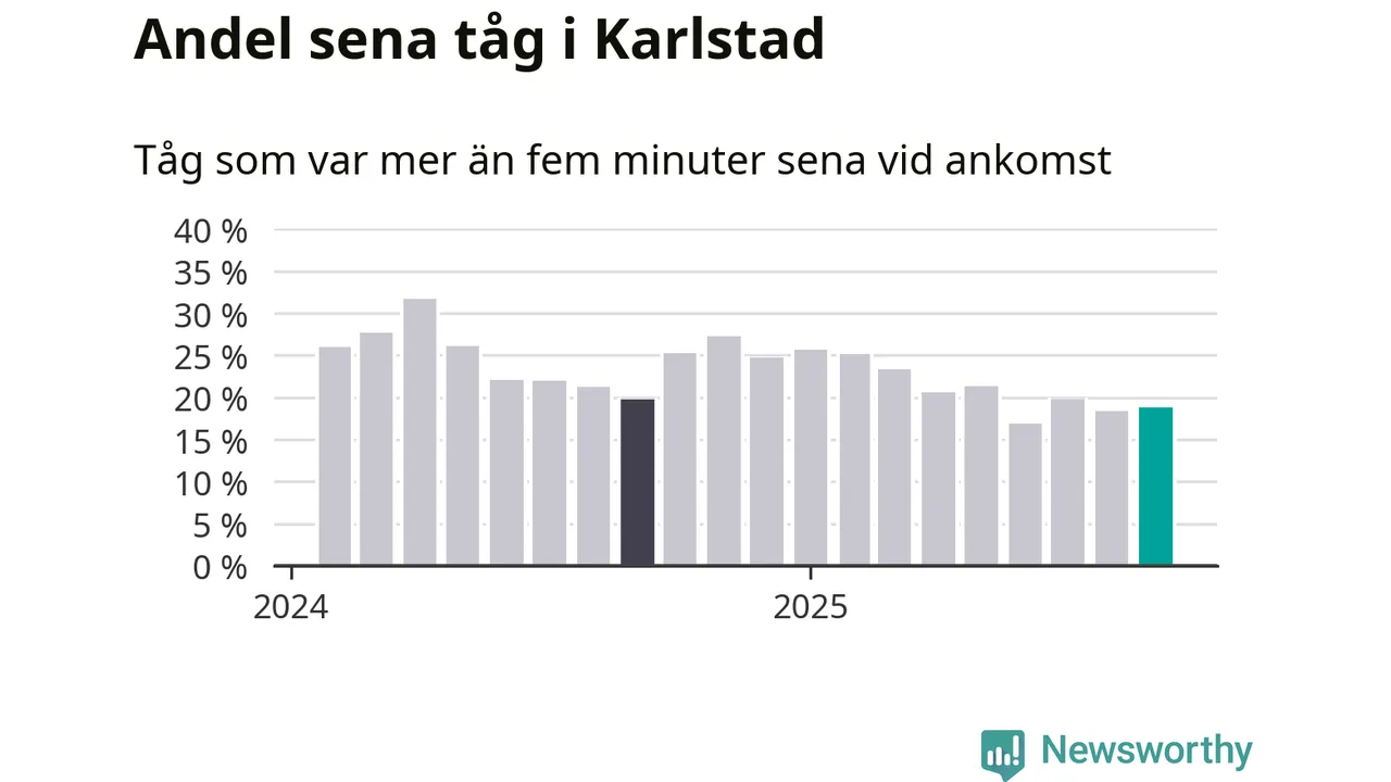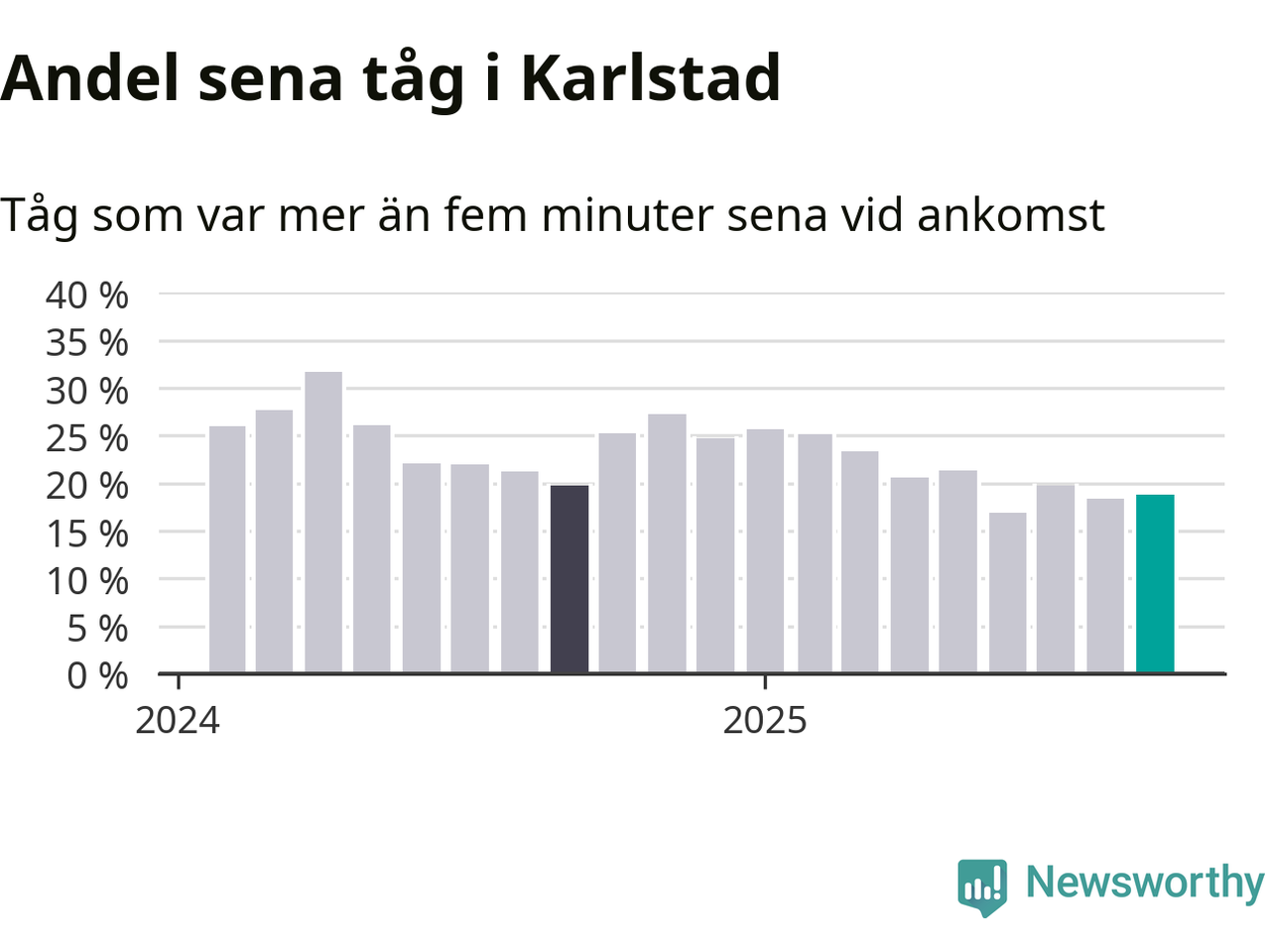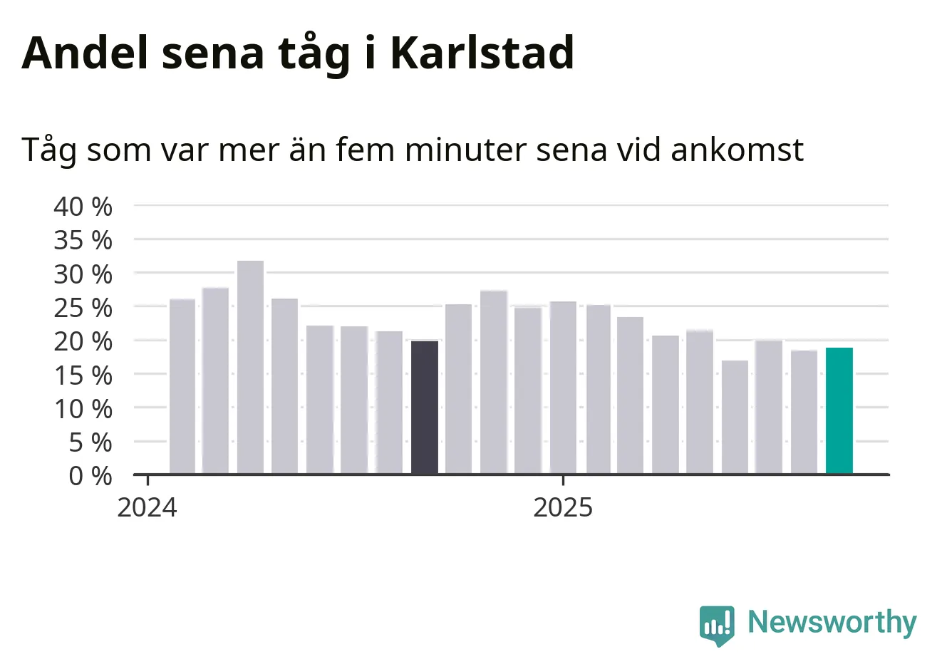 19 procent kan jämföras med 18 procent månaden innan, och 20 procent i september 2024. Siffrorna bygger på realtidsinformation om tågavgångar och ankomster från Trafikverket, som Newsworthy löpande samlar in.