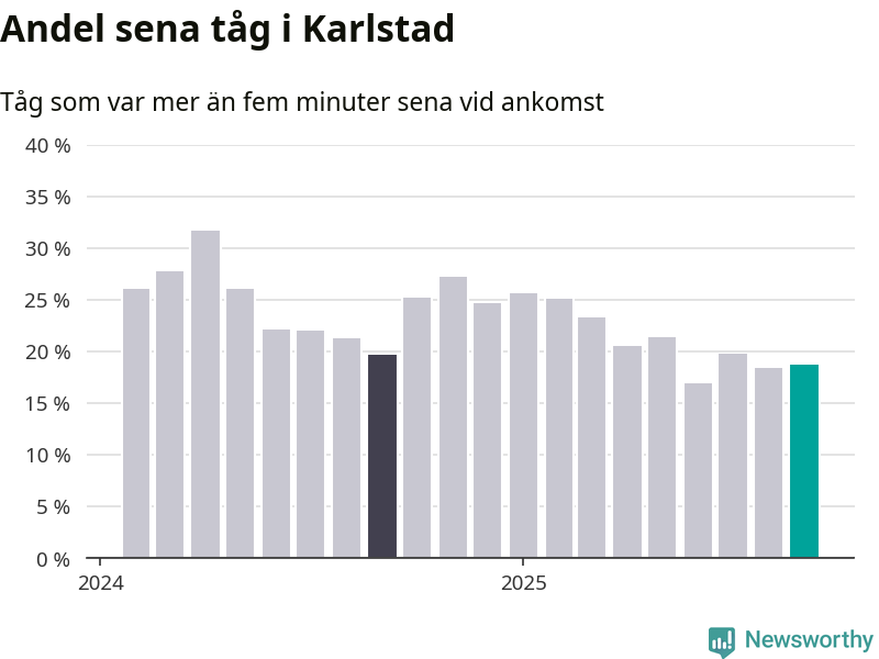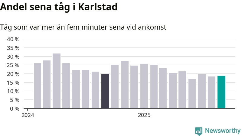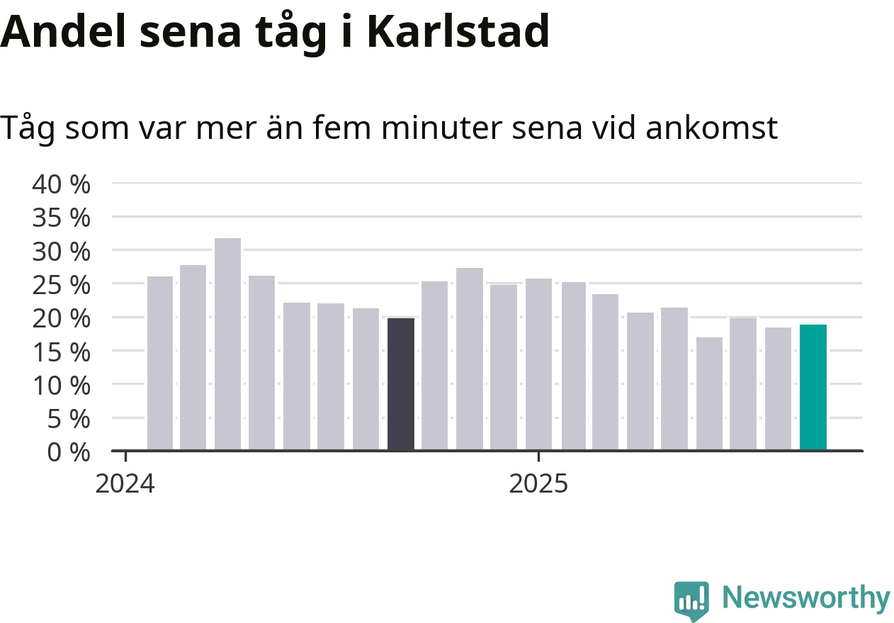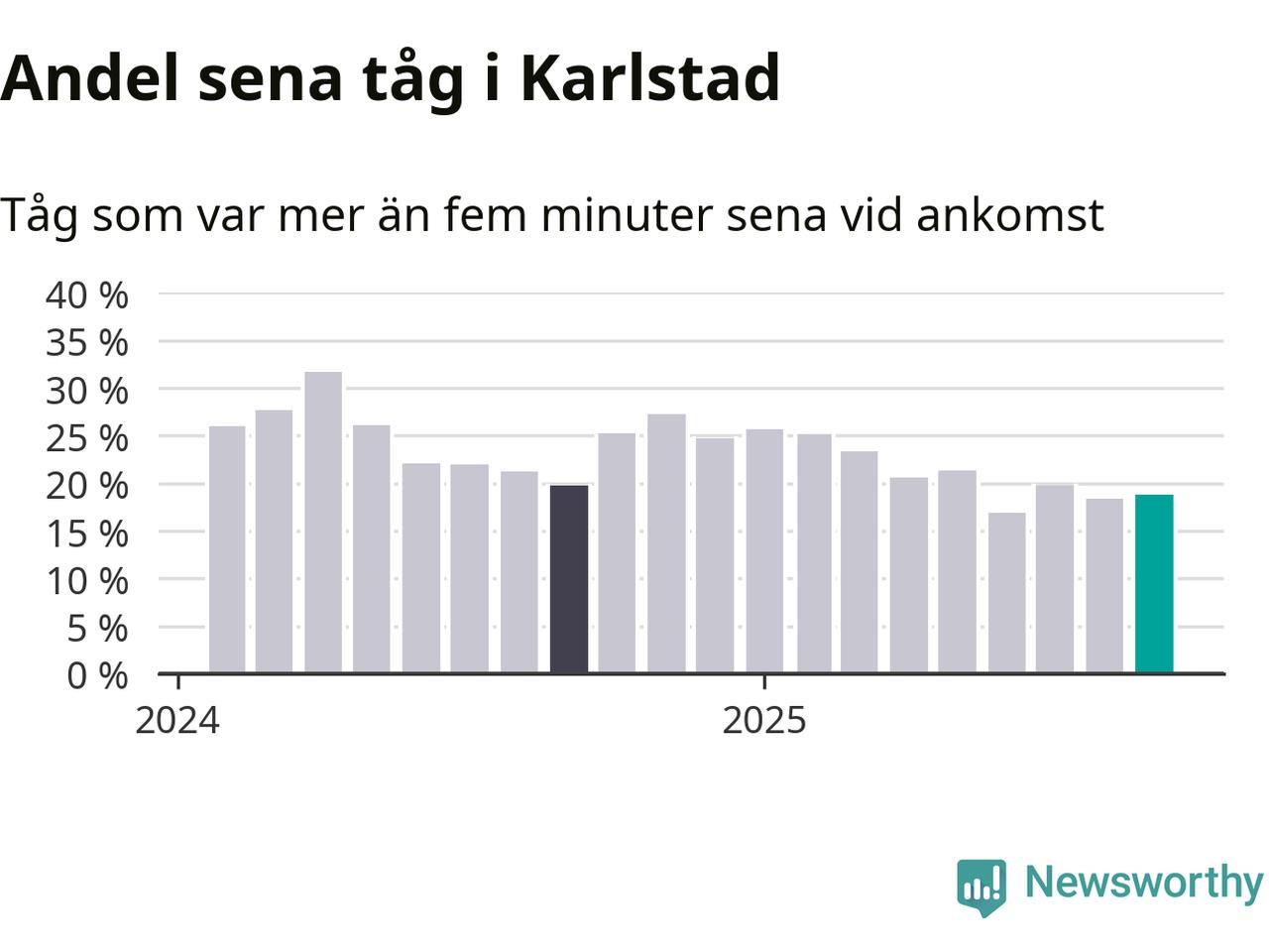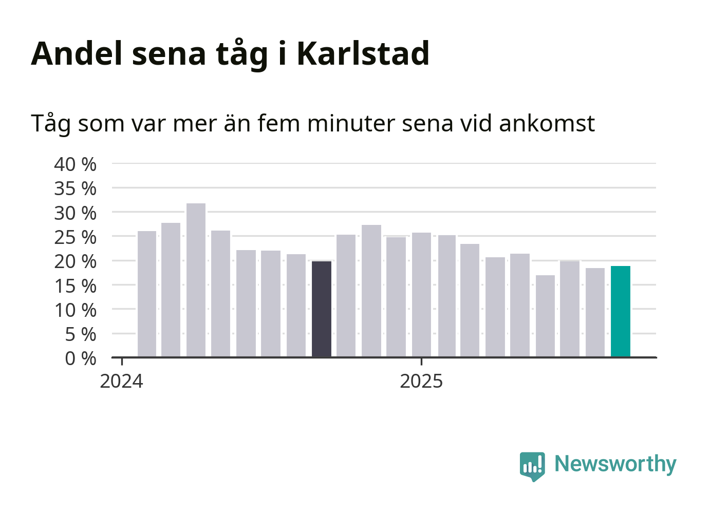 19 procent kan jämföras med 18 procent månaden innan, och 20 procent i september 2024. Siffrorna bygger på realtidsinformation om tågavgångar och ankomster från Trafikverket, som Newsworthy löpande samlar in.