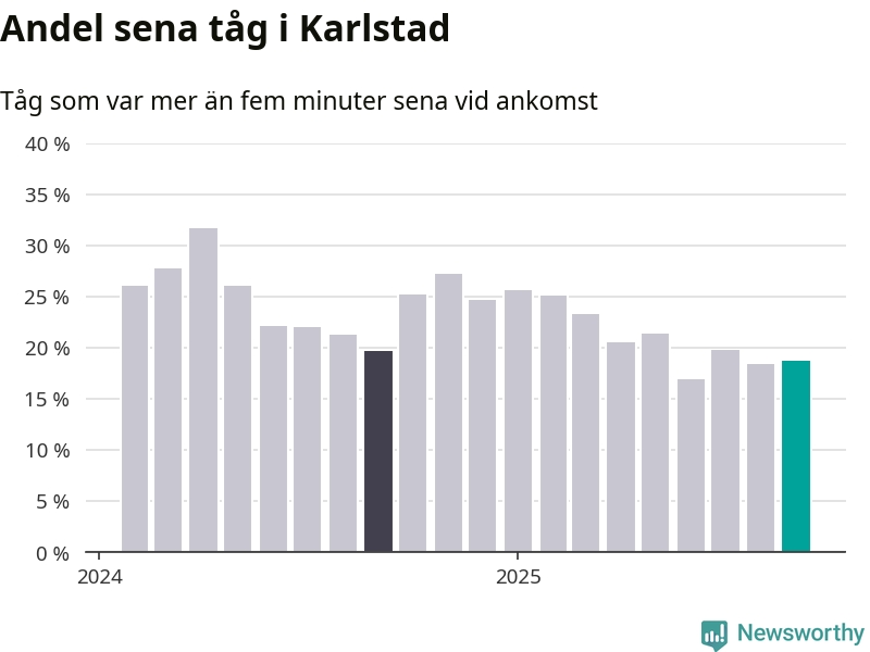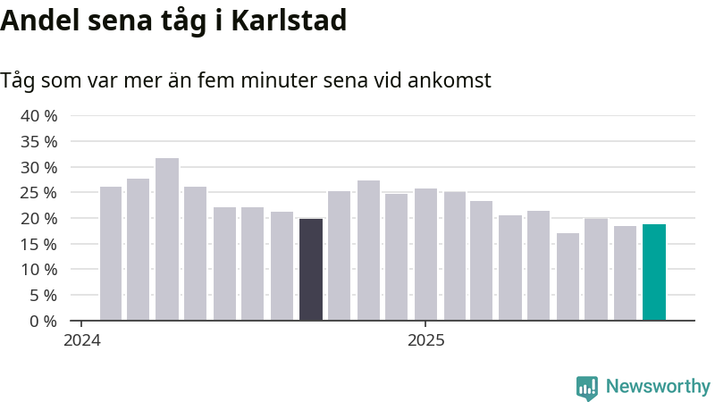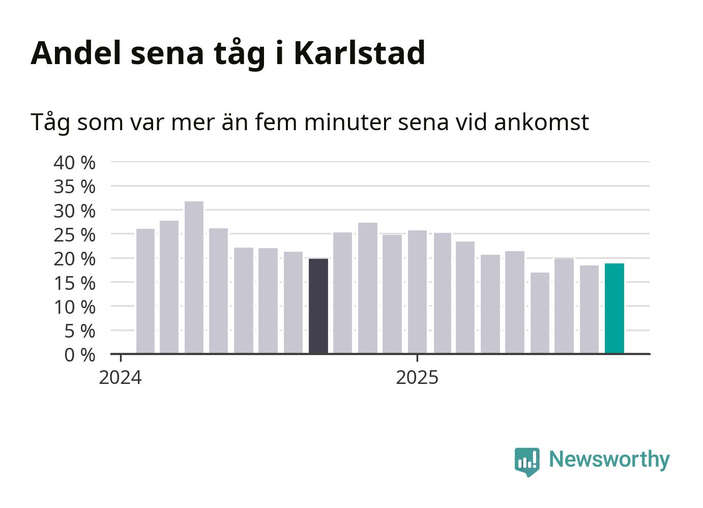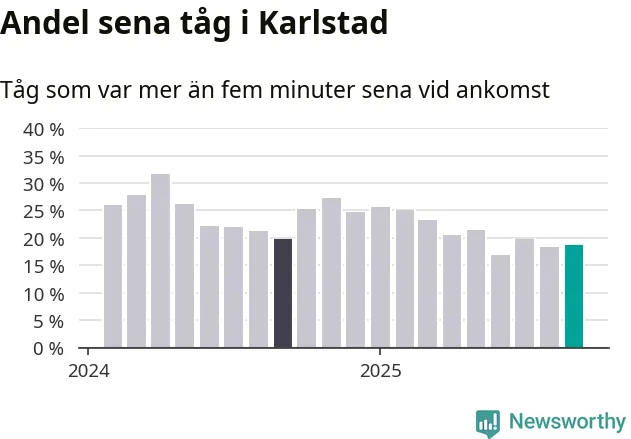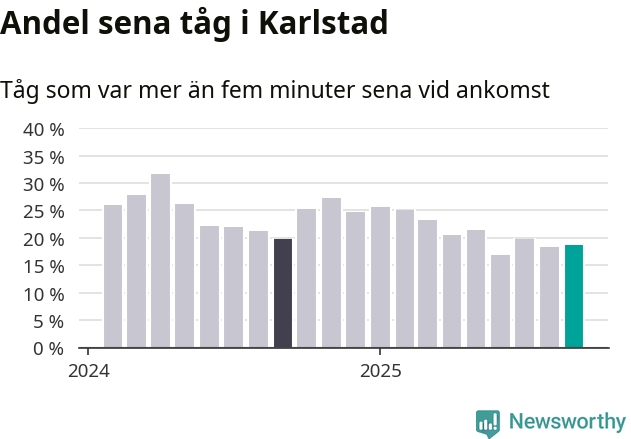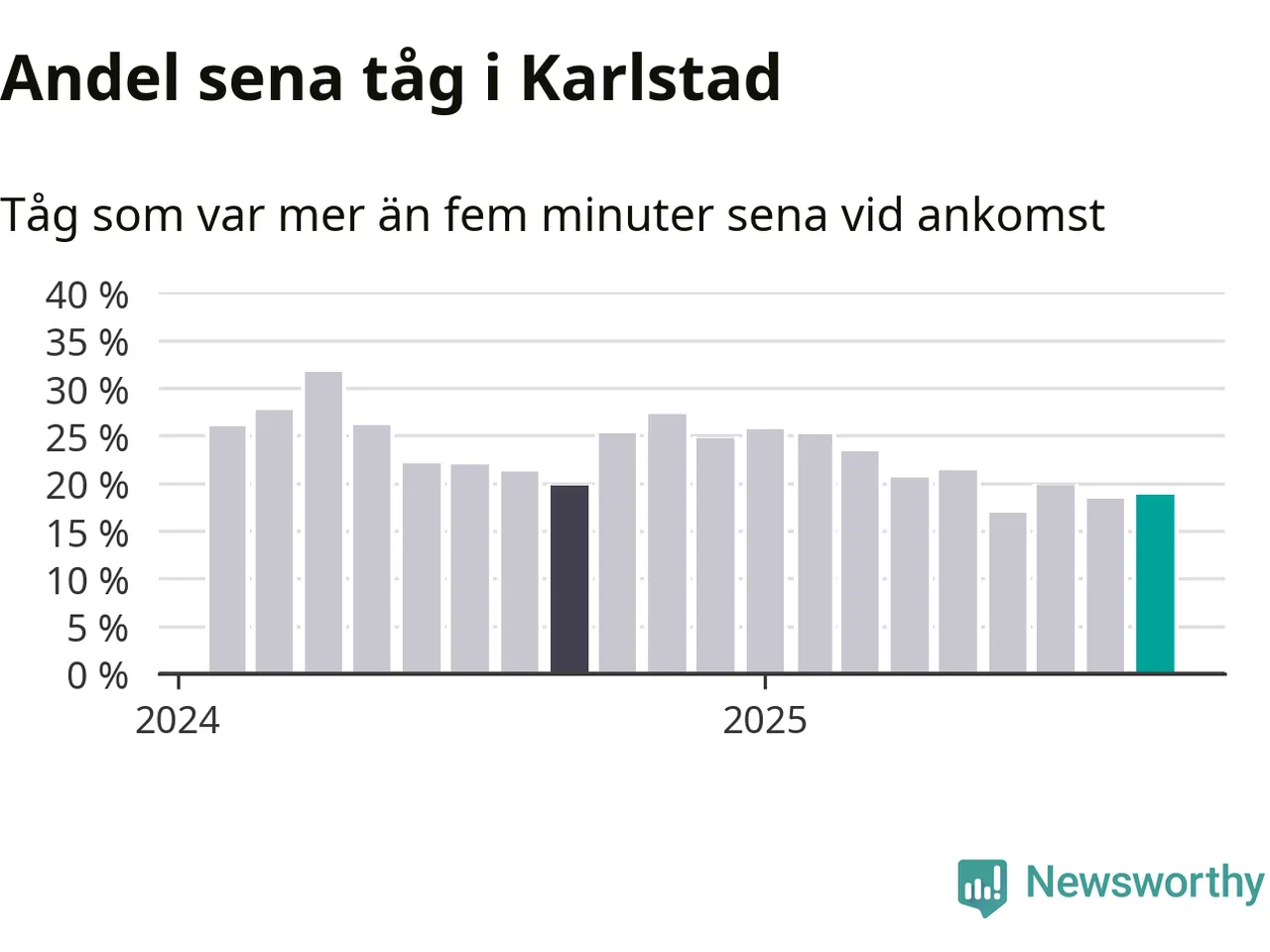 Av omkring 1 200 tåg som passerade Karlstad C, Välsviken eller Väse i september var 224 mer än fem minuter sena. Det motsvarar 19 procent, en bra bit över den nationella målsättningen som säger att inte mer än fem procent av tågen ska vara sena.