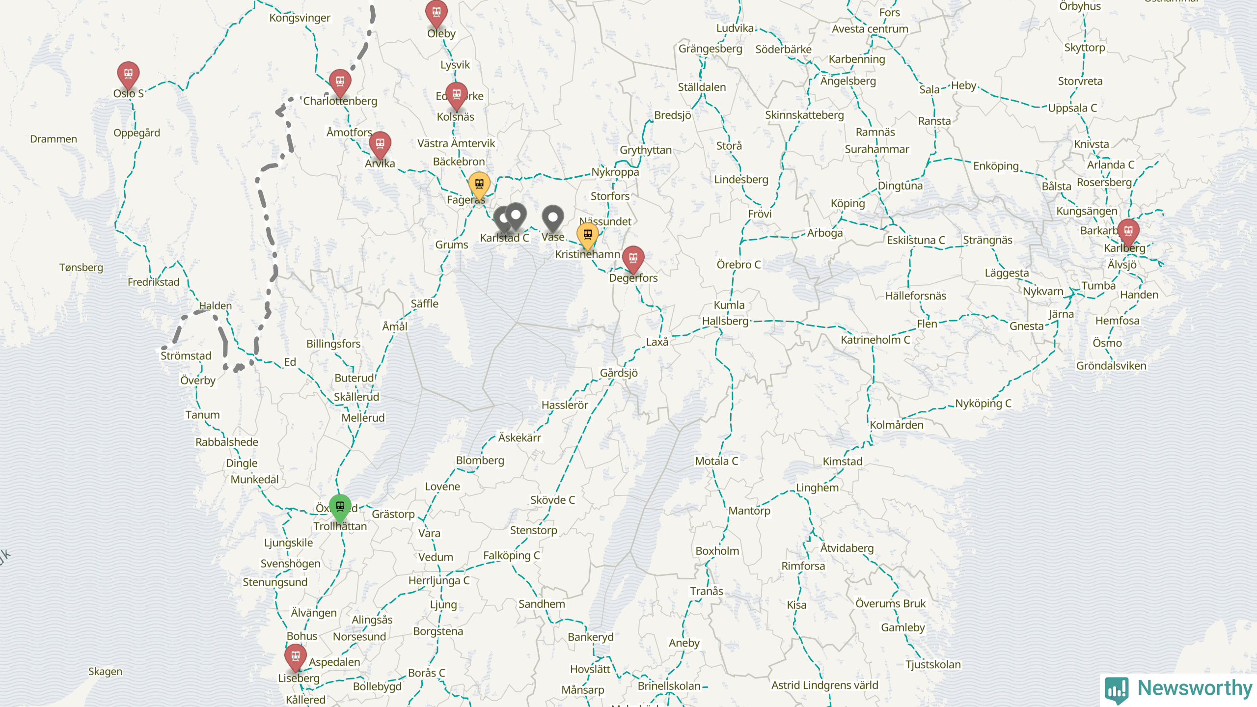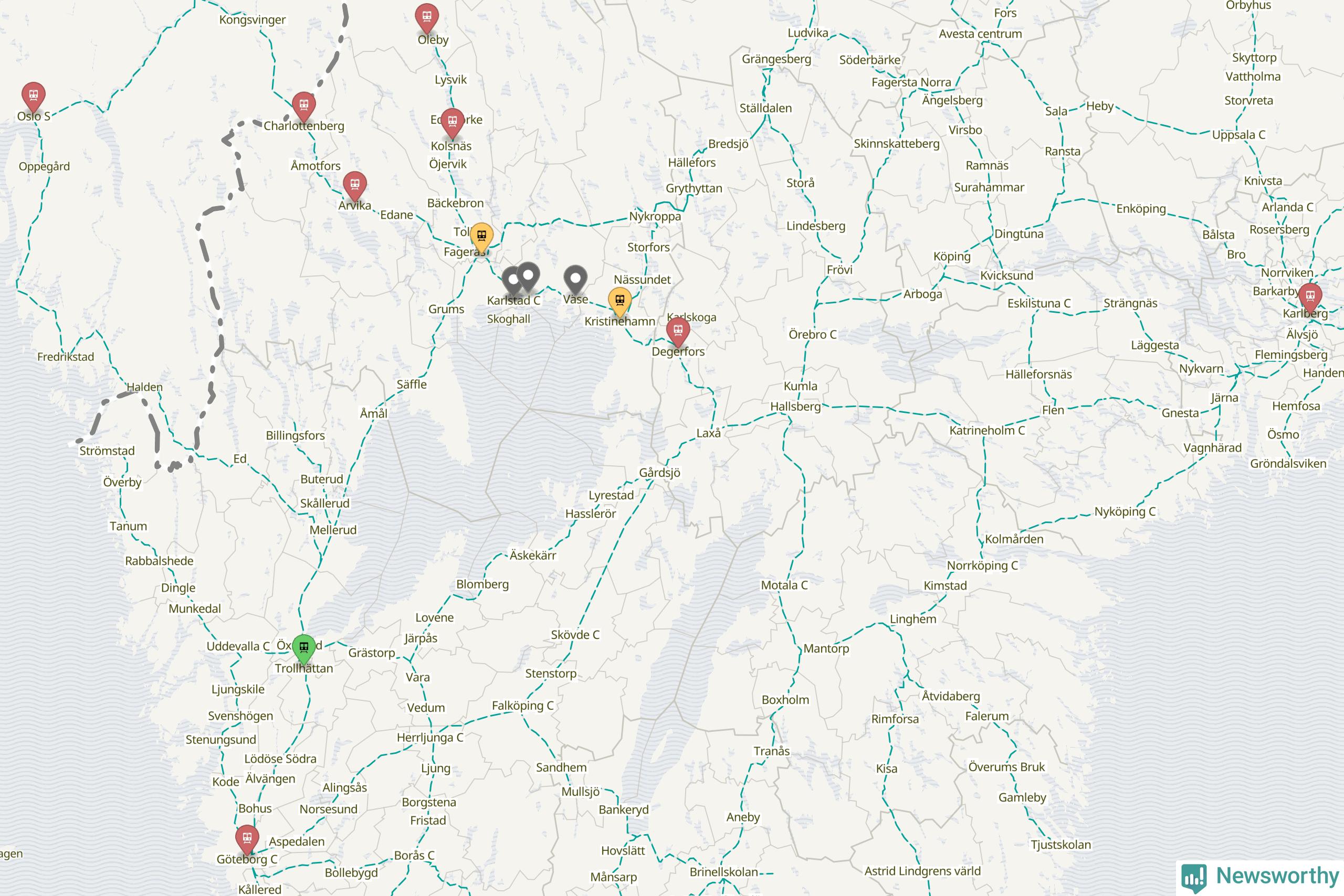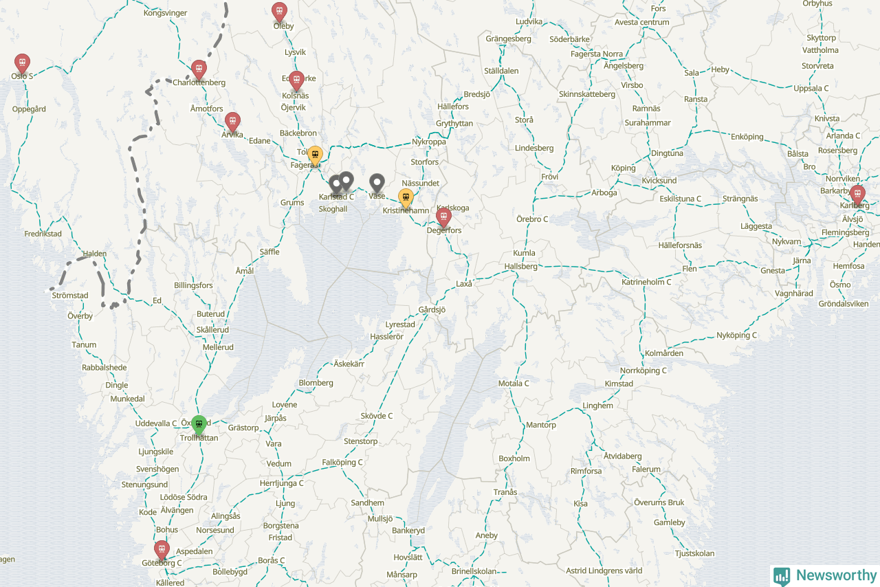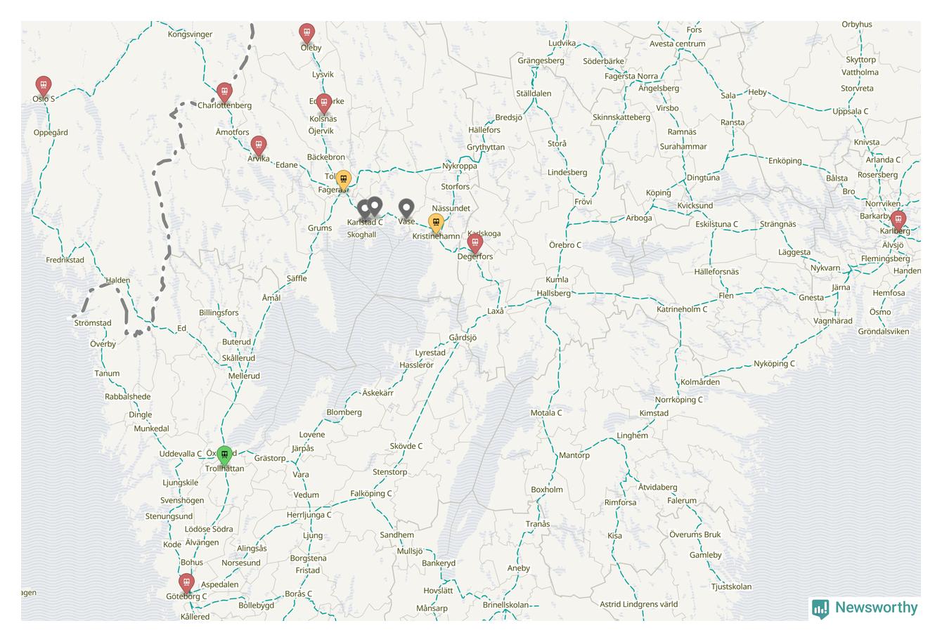 Kartdata från Mapbox, Newsworthy, OpenStreetMap och Trafikverket. Uppgifter om sträckor med passagerartrafik från jarnvag.net.