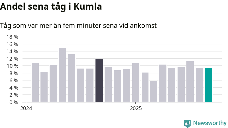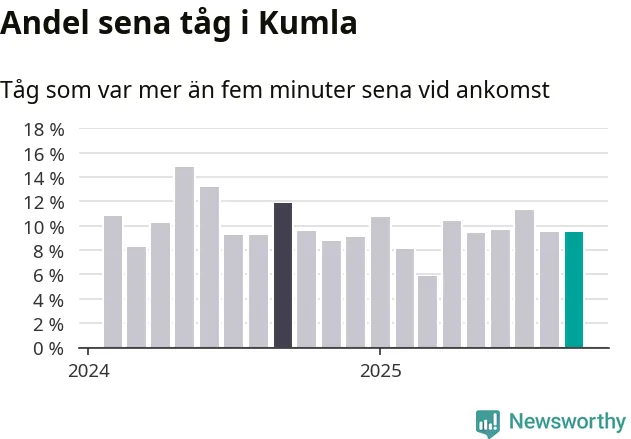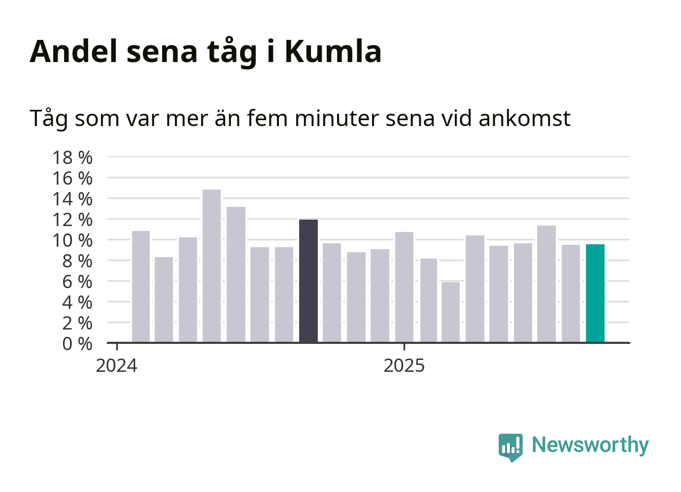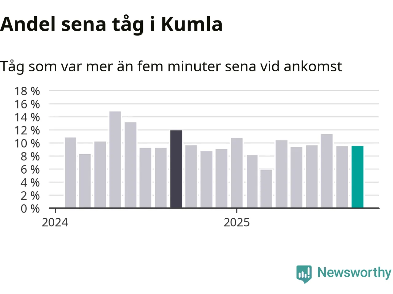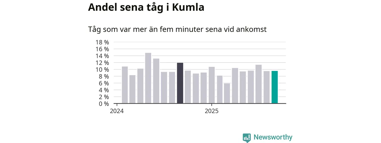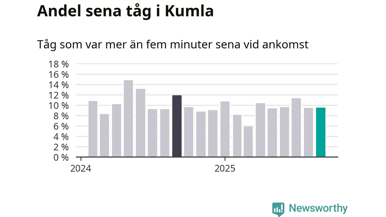 Nio procent är marginellt mer än månaden innan, och kan jämföras med tolv procent i september 2024. Siffrorna bygger på realtidsinformation om tågavgångar och ankomster från Trafikverket, som Newsworthy löpande samlar in.