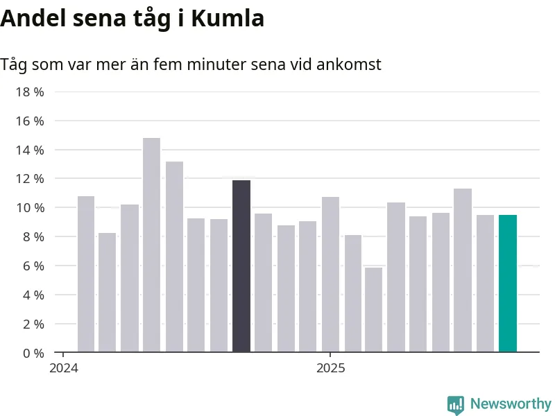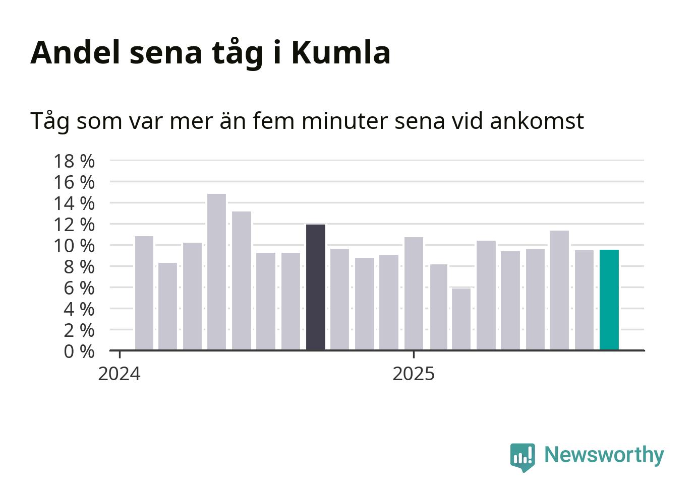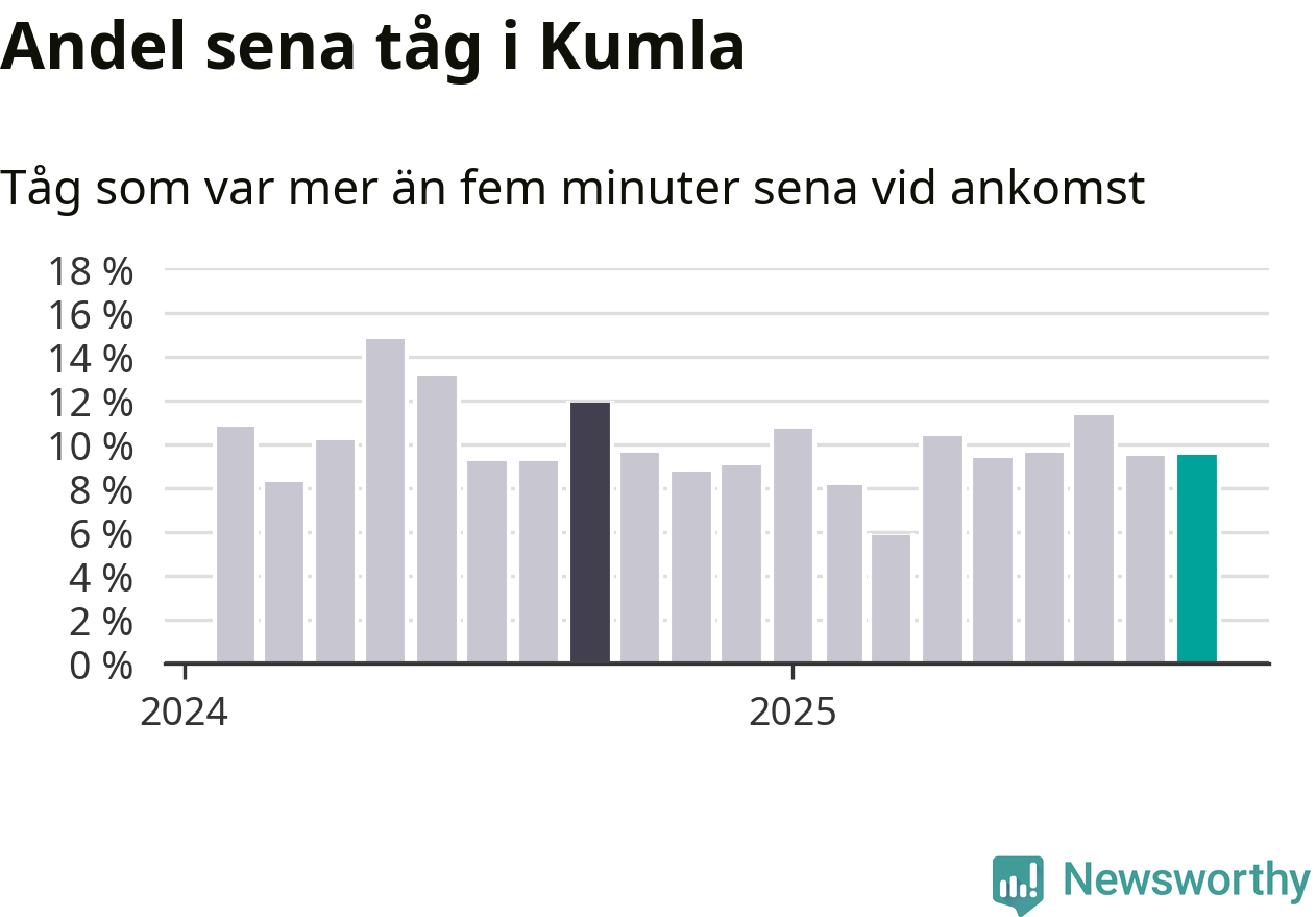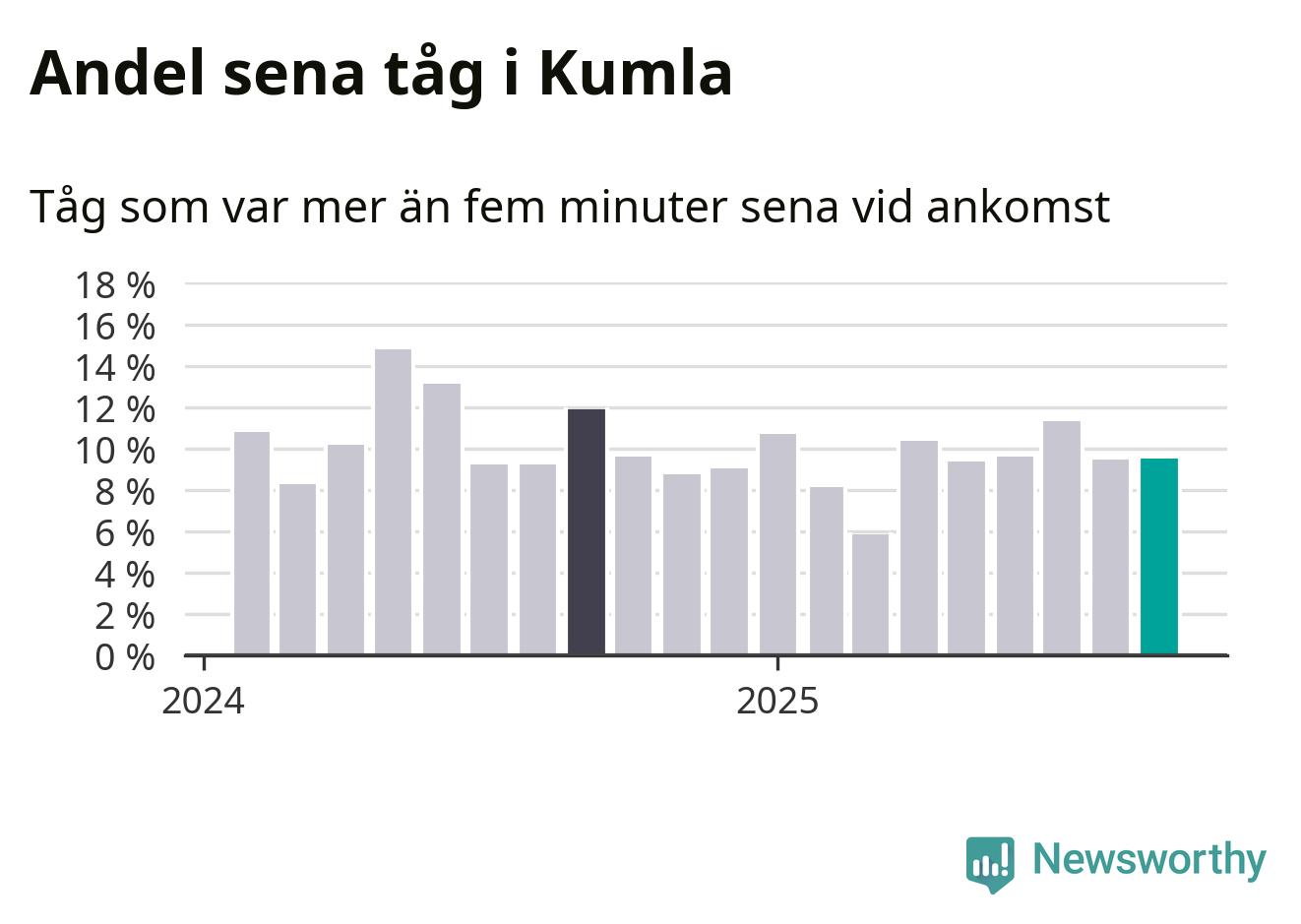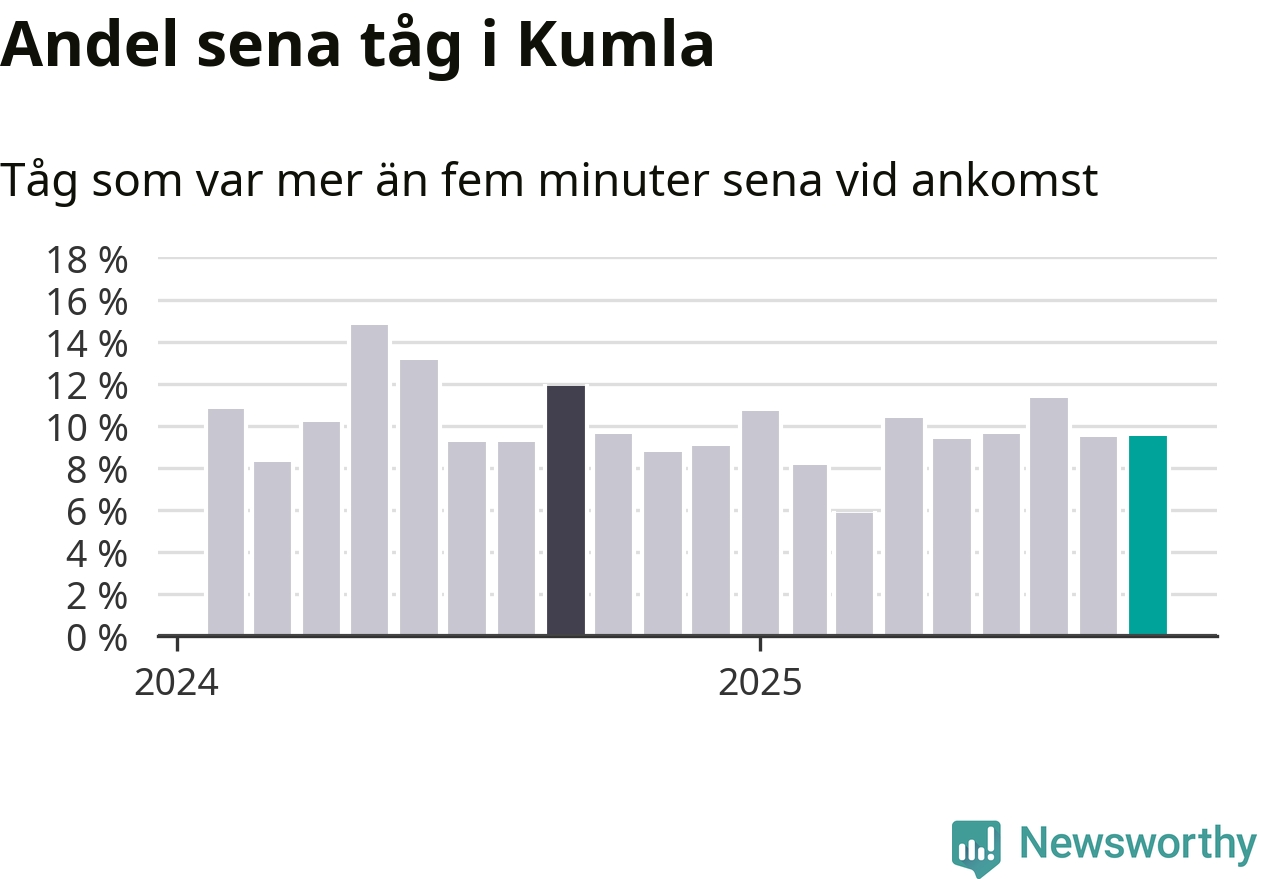 Nio procent är marginellt mer än månaden innan, och kan jämföras med tolv procent i september 2024. Siffrorna bygger på realtidsinformation om tågavgångar och ankomster från Trafikverket, som Newsworthy löpande samlar in.
