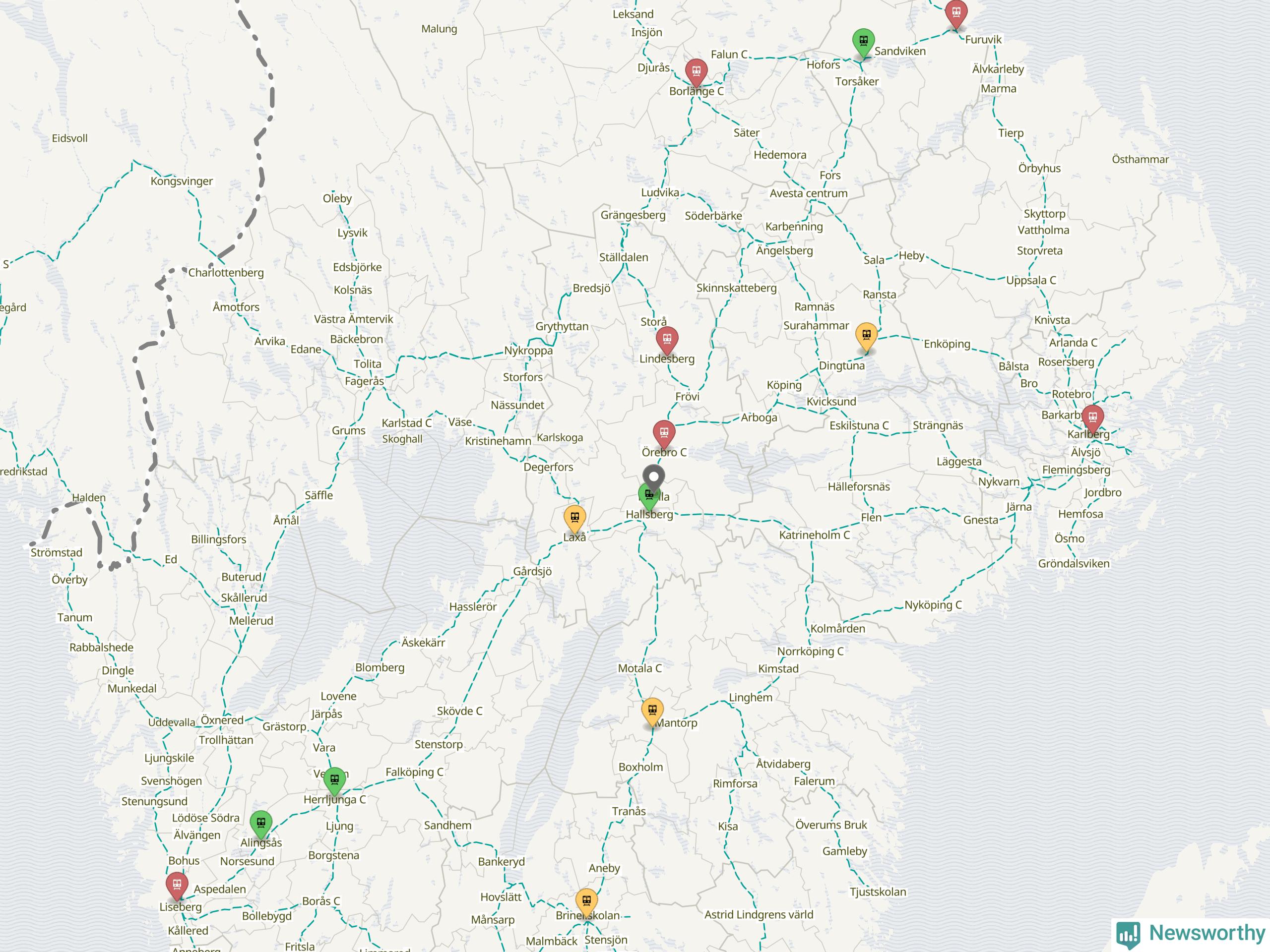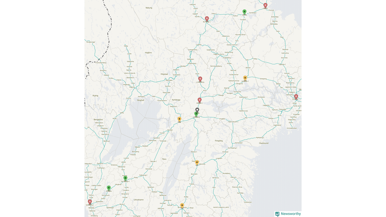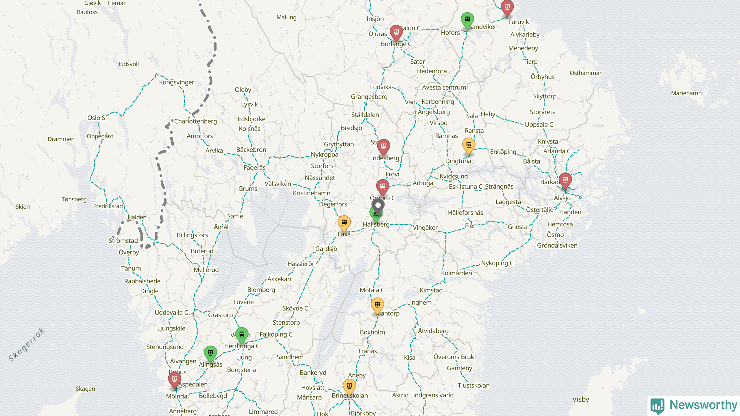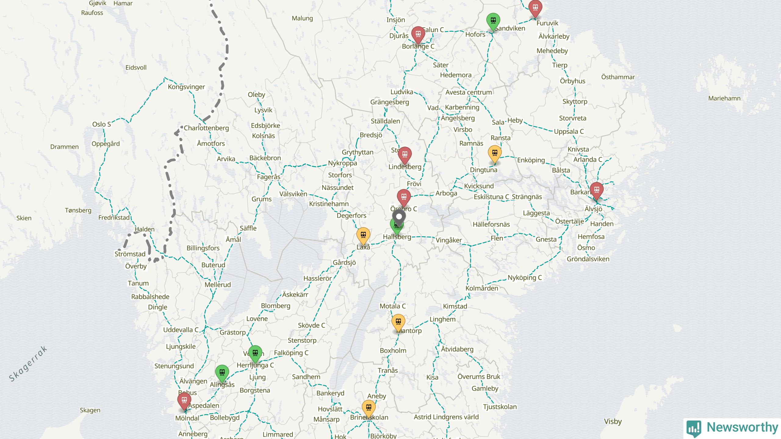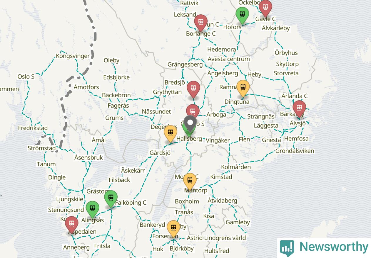 Kartdata från Mapbox, Newsworthy, OpenStreetMap och Trafikverket. Uppgifter om sträckor med passagerartrafik från jarnvag.net.