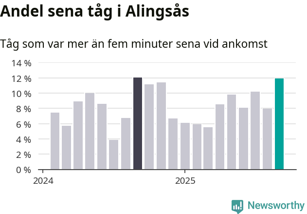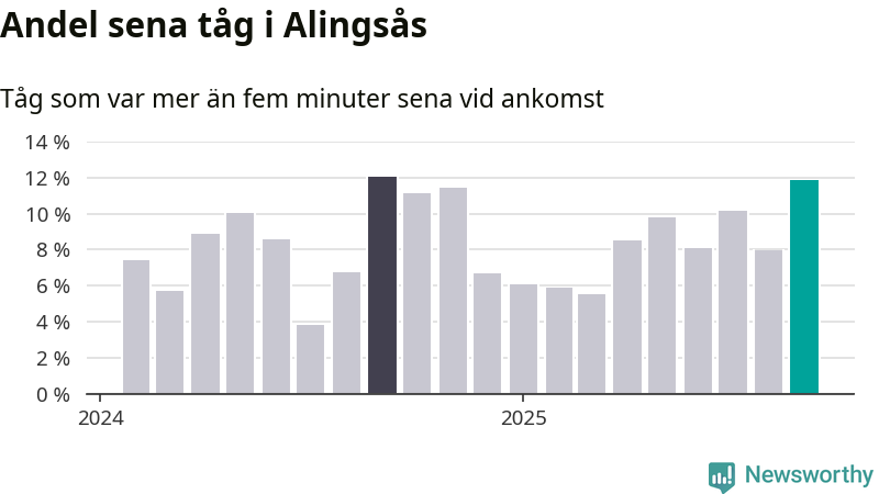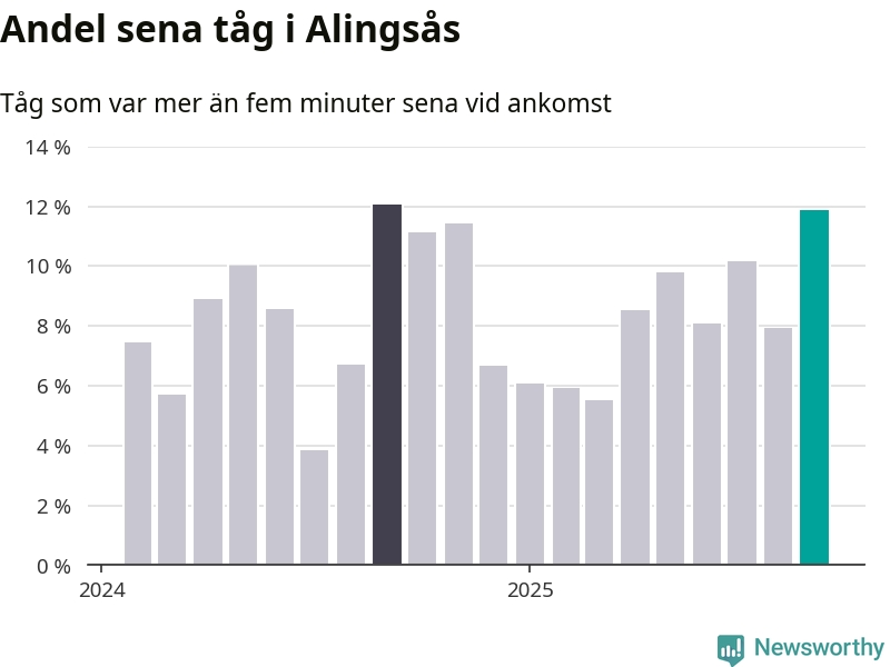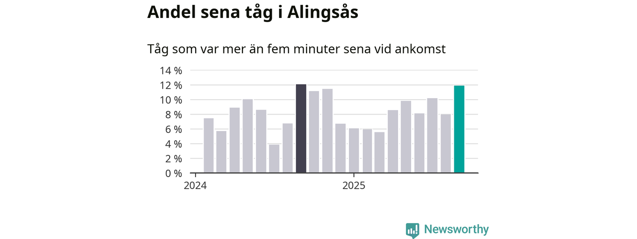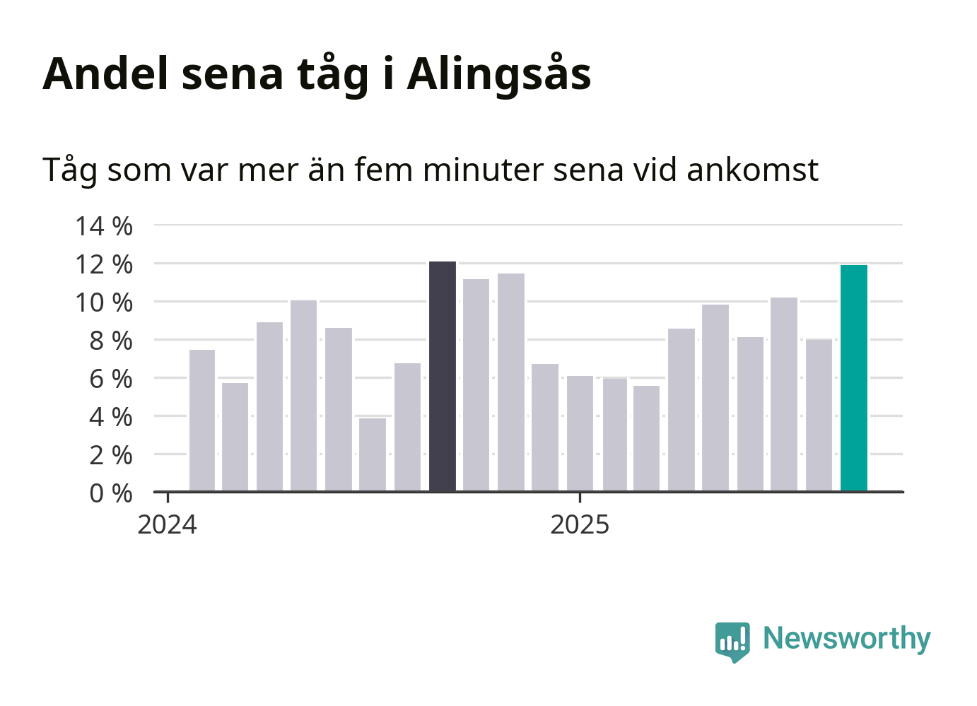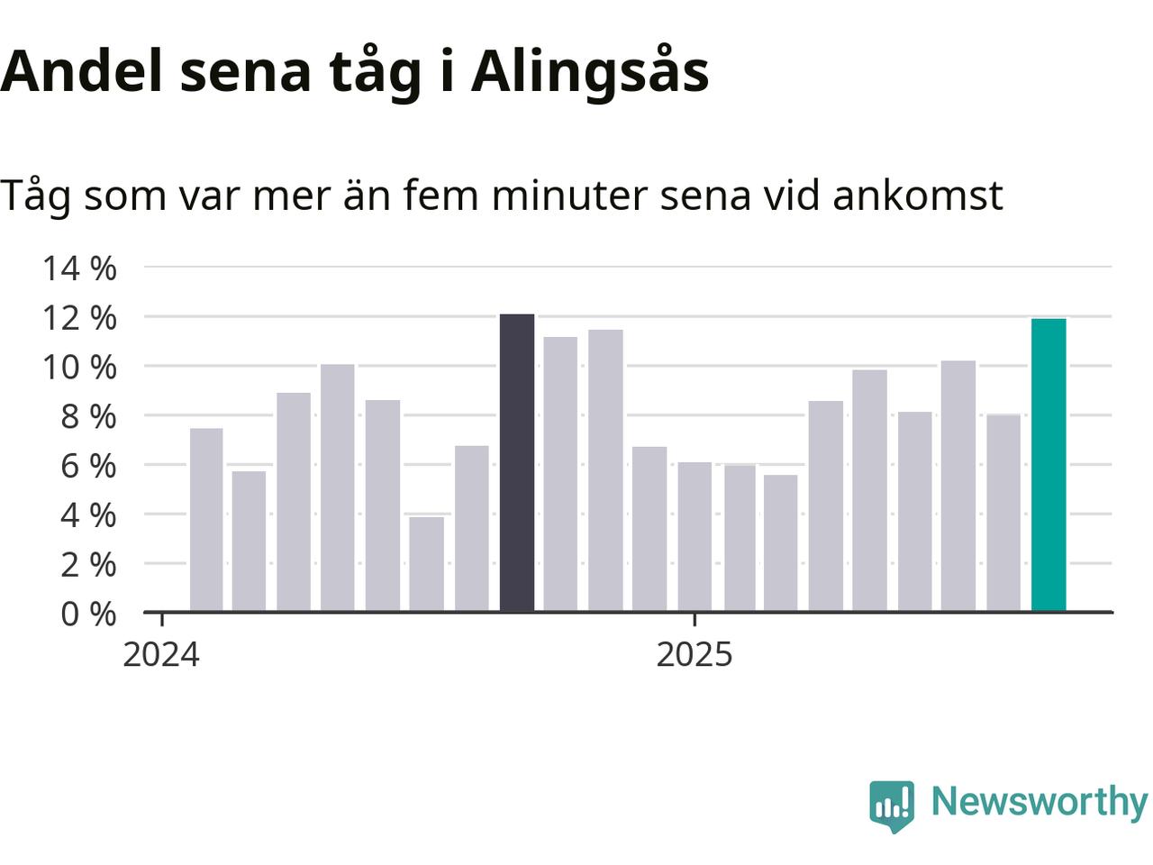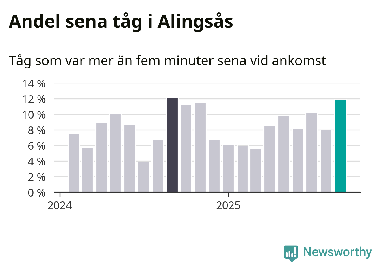 Av 3 400 tåg som passerade Alingsås eller Västra Bodarne i september var 404 mer än fem minuter sena. Det motsvarar 12 procent, en bit över den nationella målsättningen som säger att inte mer än fem procent av tågen ska vara sena.