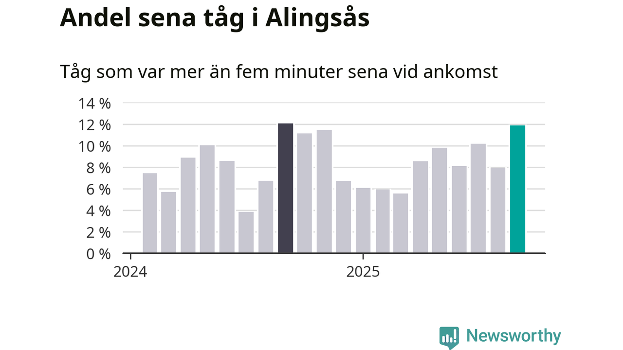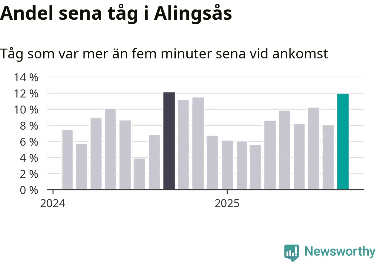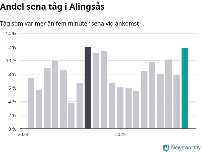 Så hög har andelen förseningar inte varit sedan september 2024. Siffrorna bygger på realtidsinformation om tågavgångar och ankomster från Trafikverket, som Newsworthy löpande samlar in.
