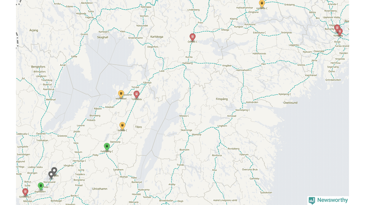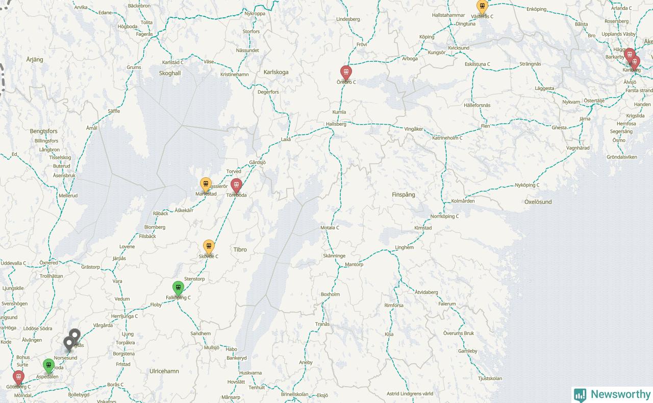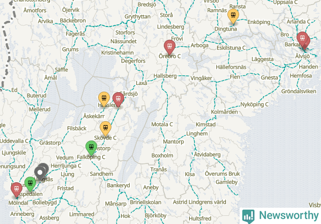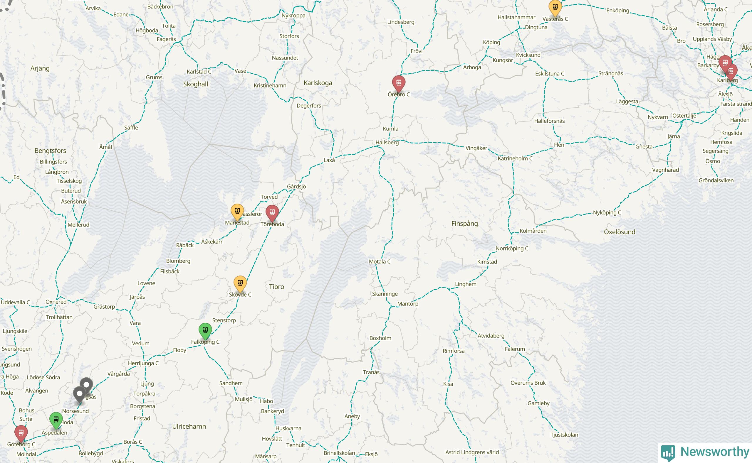 Kartdata från Mapbox, Newsworthy, OpenStreetMap och Trafikverket. Uppgifter om sträckor med passagerartrafik från jarnvag.net.