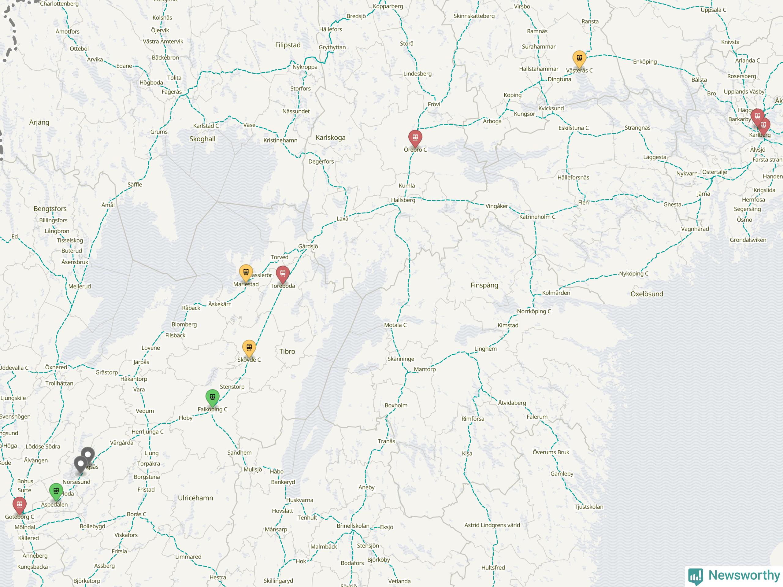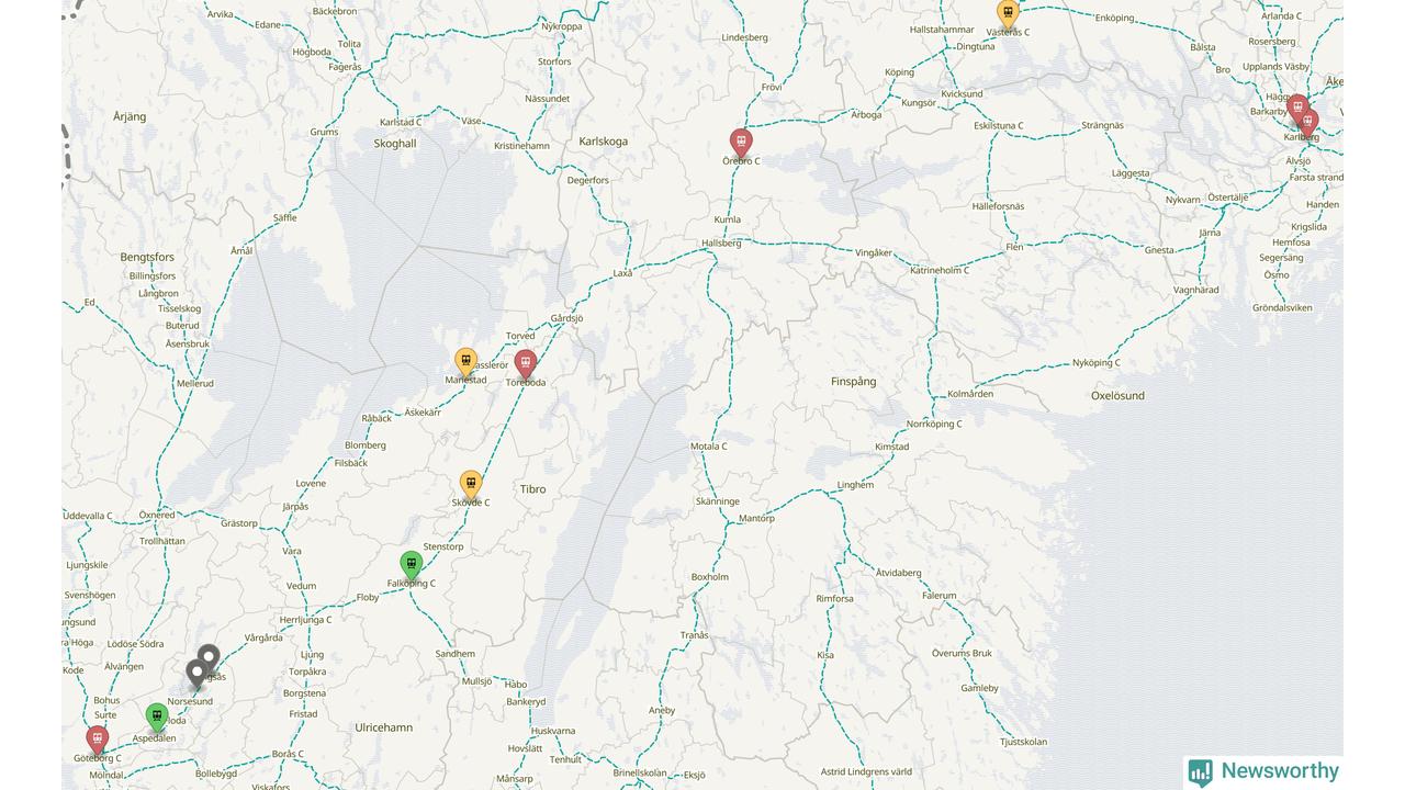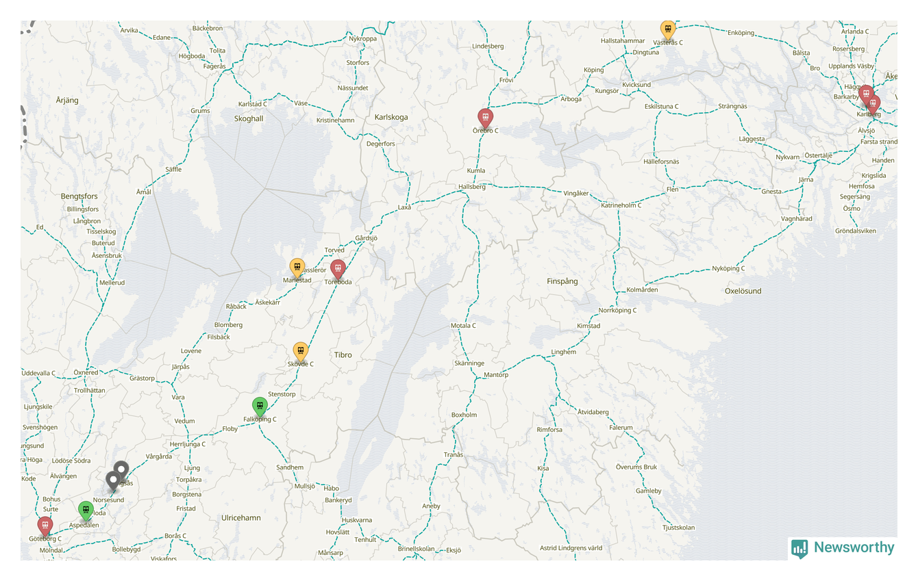 Kartdata från Mapbox, Newsworthy, OpenStreetMap och Trafikverket. Uppgifter om sträckor med passagerartrafik från jarnvag.net.