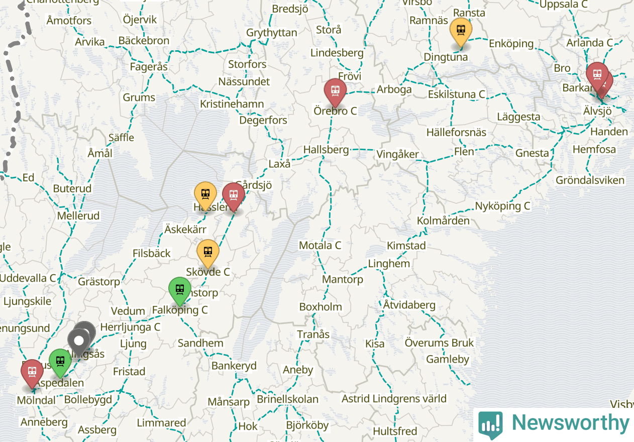 Alingsås–Töreboda station | Västtågen | 18 % (8 av 44 tåg) | 4 minuter och 18 sekunder | 13 mil |