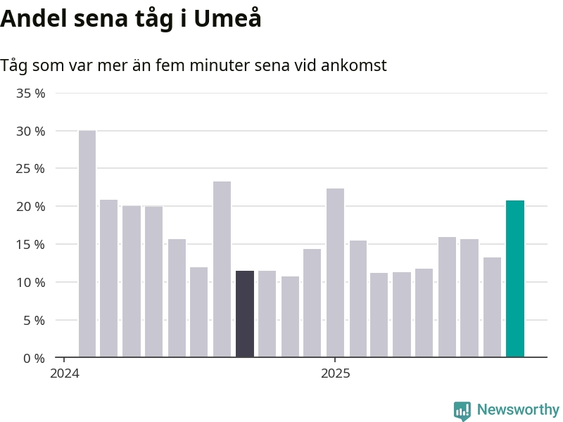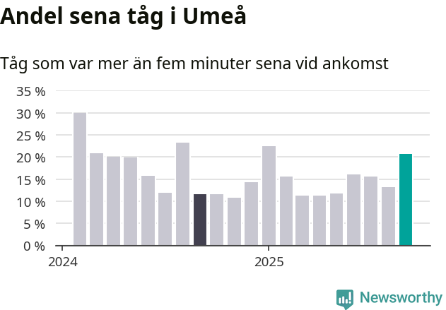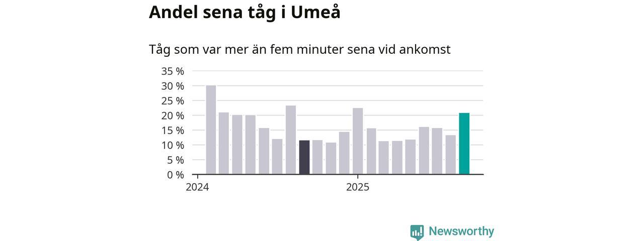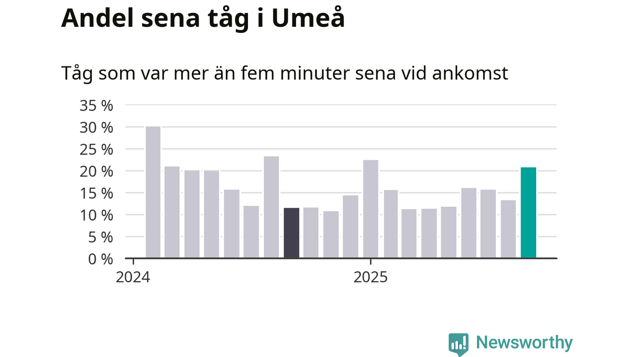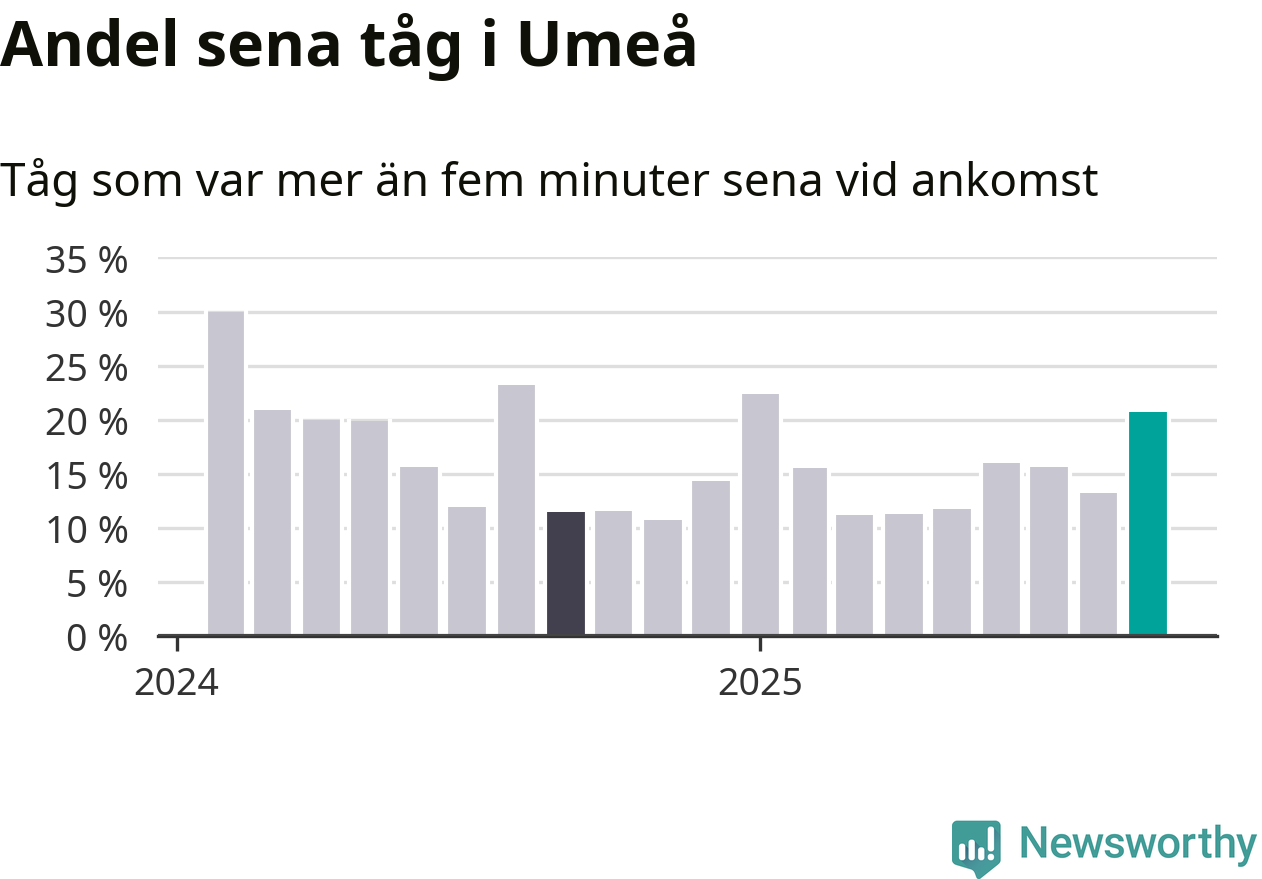 21 procent kan jämföras med 13 procent månaden innan, och tolv procent i september 2024. Siffrorna bygger på realtidsinformation om tågavgångar och ankomster från Trafikverket, som Newsworthy löpande samlar in.