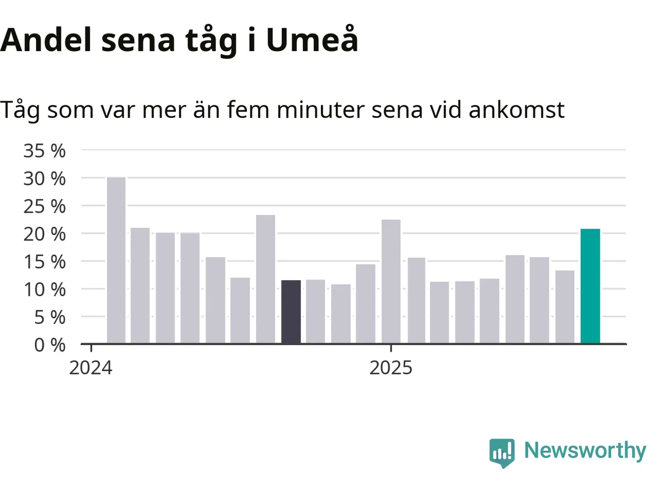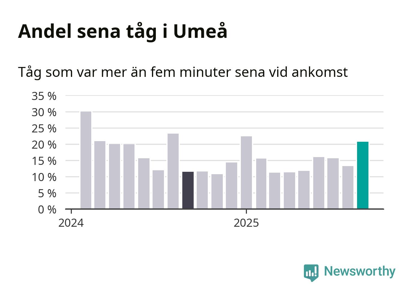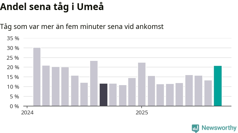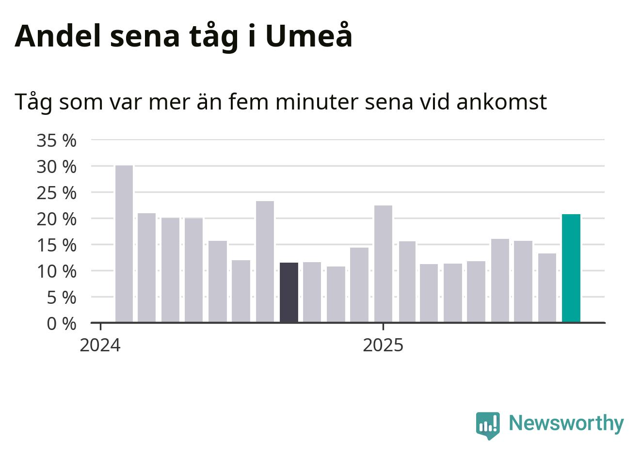 21 procent kan jämföras med 13 procent månaden innan, och tolv procent i september 2024. Siffrorna bygger på realtidsinformation om tågavgångar och ankomster från Trafikverket, som Newsworthy löpande samlar in.
