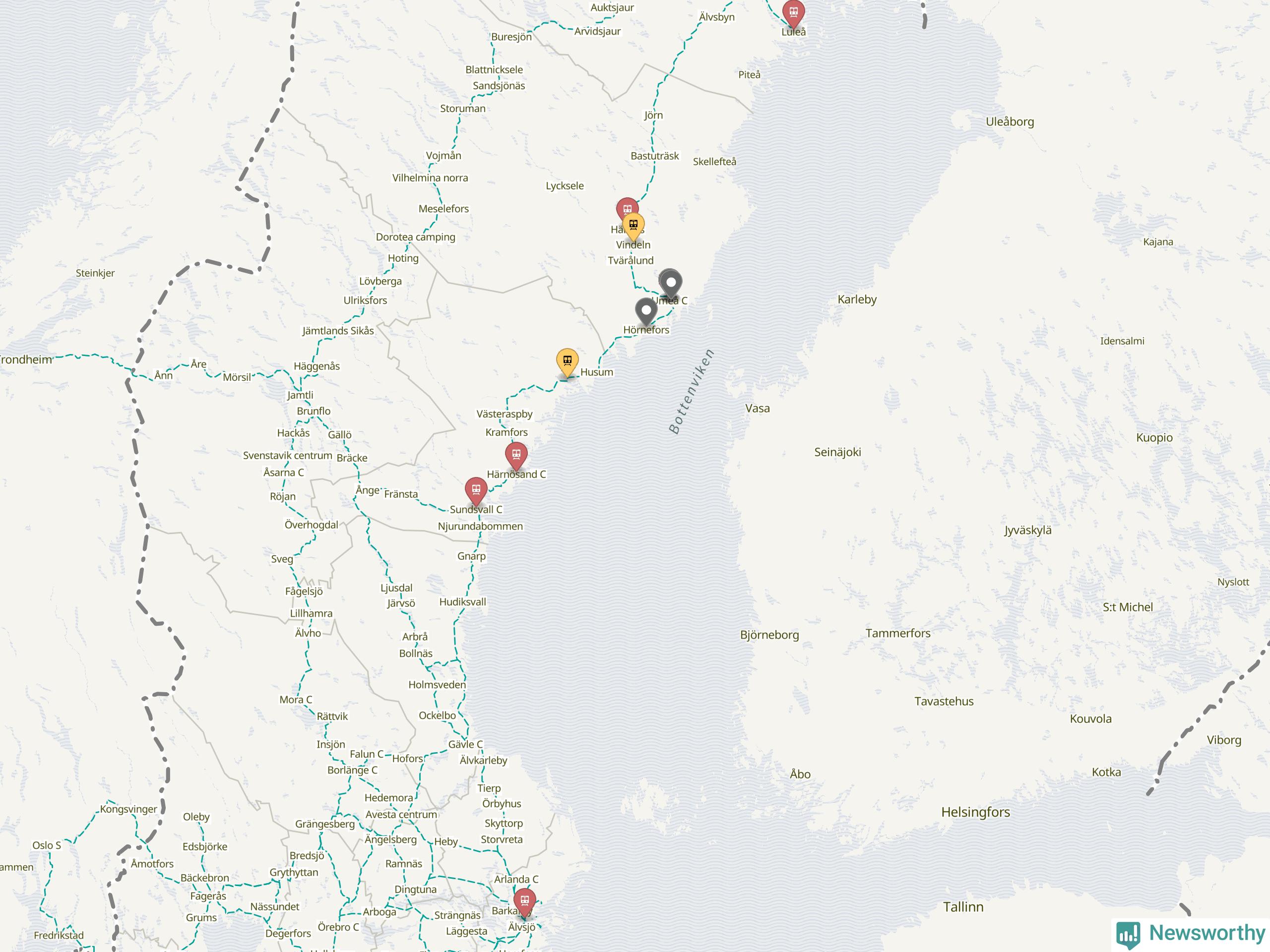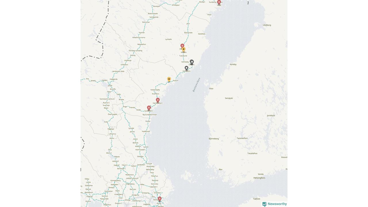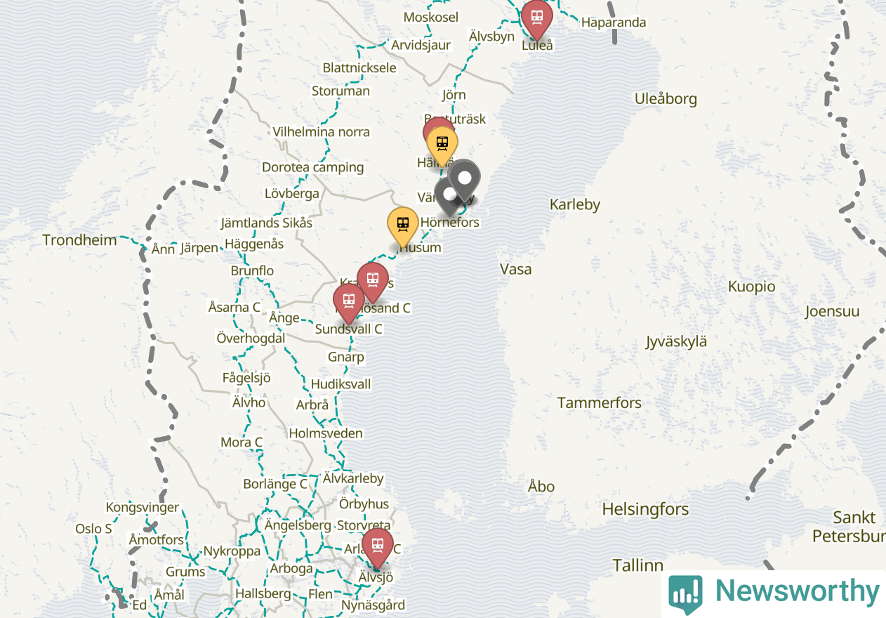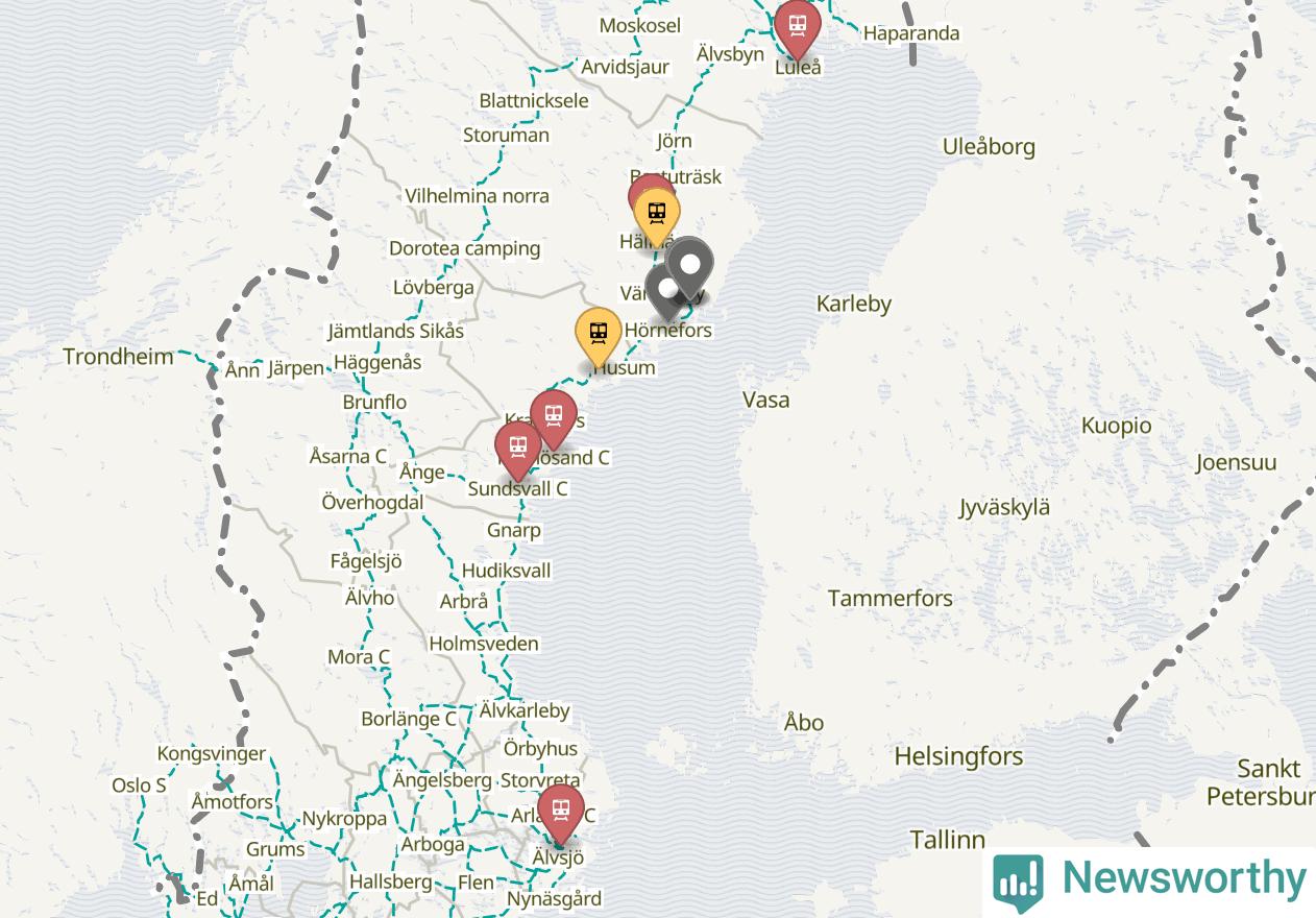 Kartdata från Mapbox, Newsworthy, OpenStreetMap och Trafikverket. Uppgifter om sträckor med passagerartrafik från jarnvag.net.