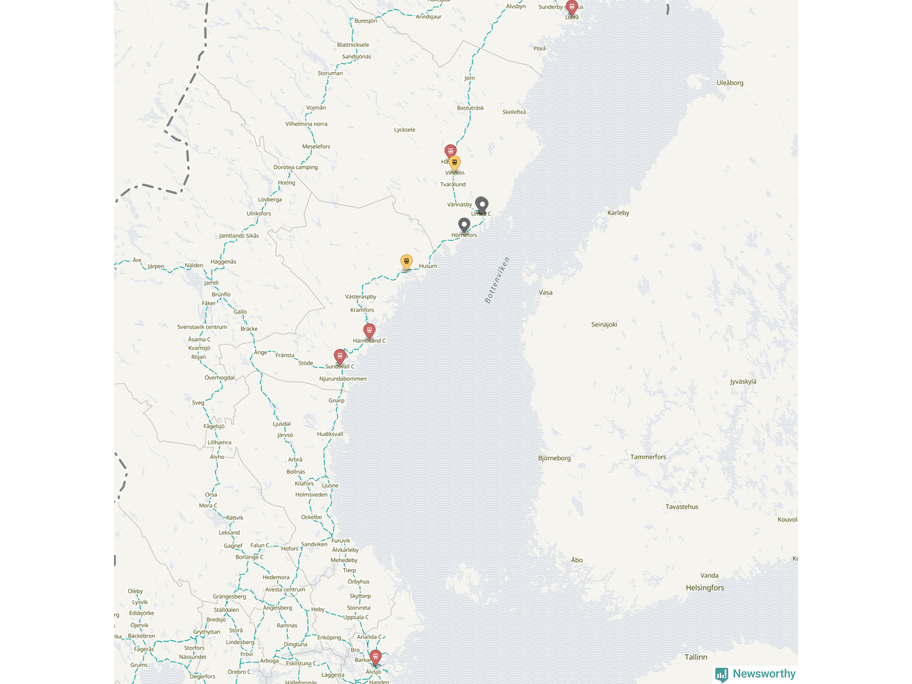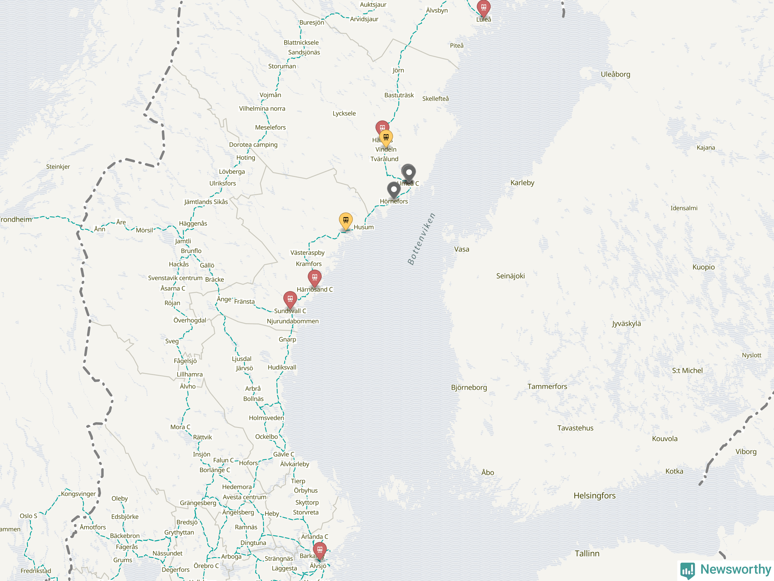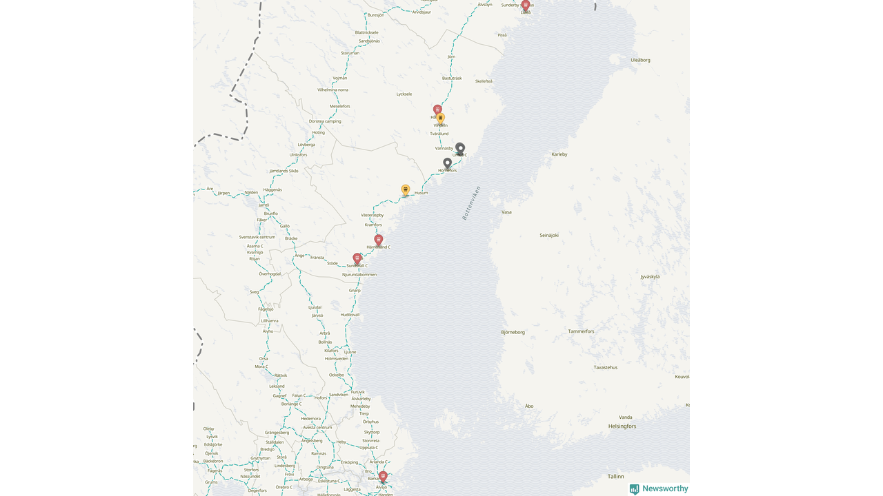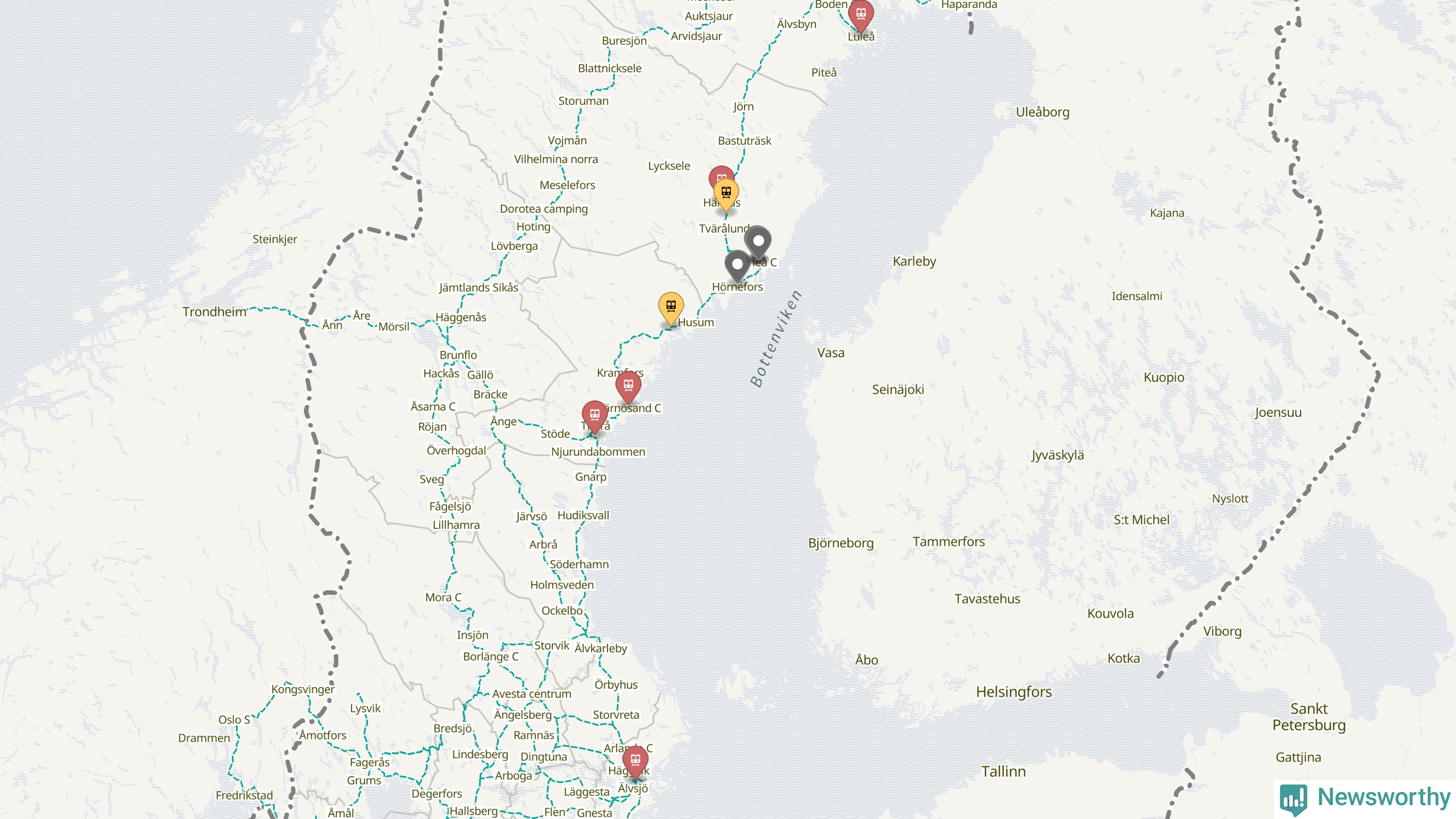Kartdata från Mapbox, Newsworthy, OpenStreetMap och Trafikverket. Uppgifter om sträckor med passagerartrafik från jarnvag.net.